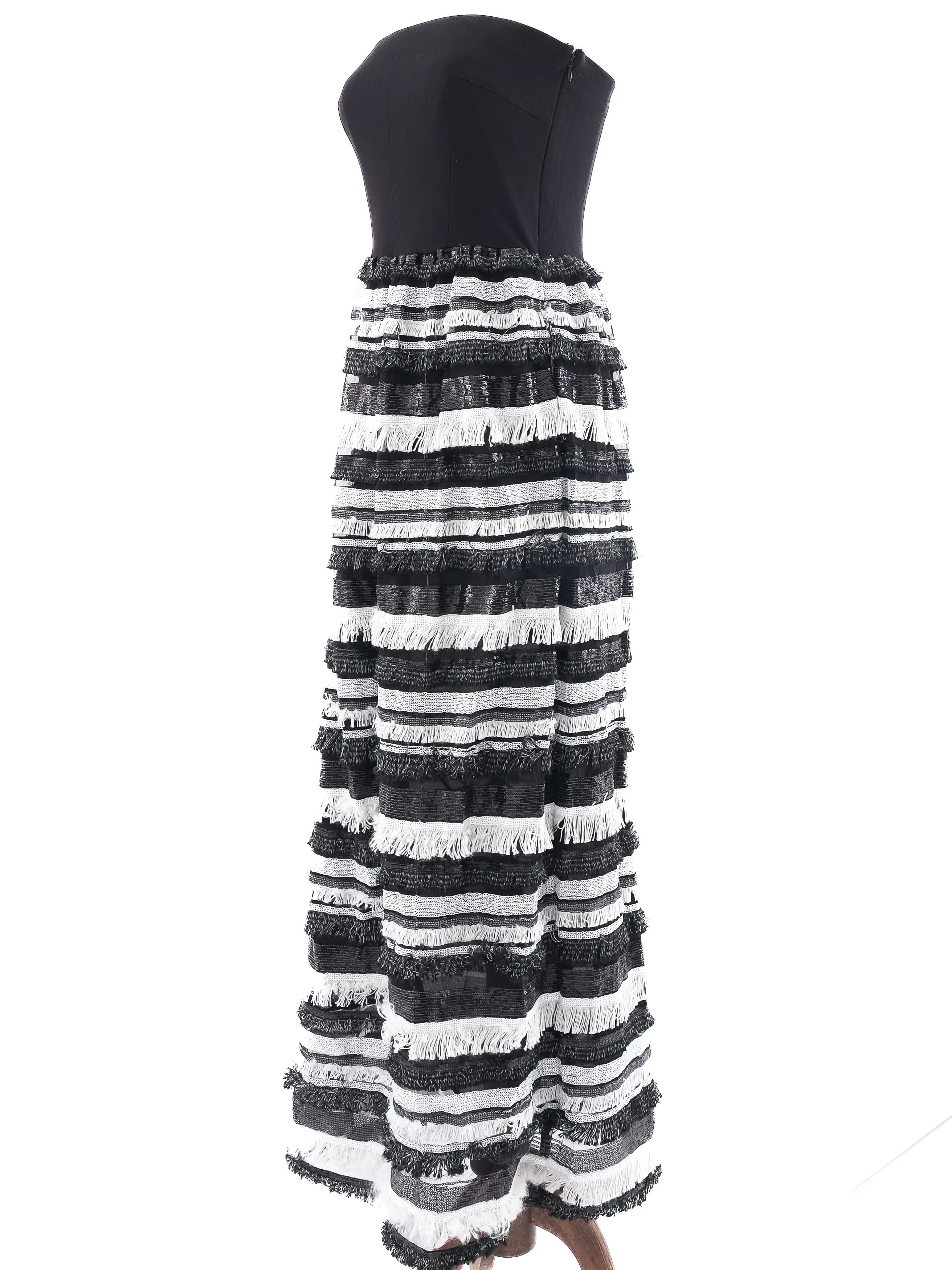 Atos Lombardini Strapless Dress Black White Size L Excellent Condition. This exquisite strapless dress by Atos Lombardini features a fitted black bodice that complements its elegant style. The full-length skirt is adorned with an eye-catching design of textured black and white horizontal stripes, creating an impressive fringed or layered look. Made from high-quality polyester, this dress is not only stylish but also comfortable to wear. It is in excellent condition with no visible flaws, ensuring a pristine appearance for any occasion. The size L provides a flattering fit, perfect for various events. Care instructions recommend dry cleaning for maintaining the dress's integrity. The dress's classic and sophisticated design is suitable for cocktail events, evening outings, or dressy occasions. This item comes from a smoke-free and pet-free home, ensuring a fresh arrival. Invest in a piece that combines style and quality with this beautiful Atos Lombardini dress. Please message me to confirm shipping timeframe. My full-time job involves traveling often, and shipping out may take longer than usual. Thanks for your interest.