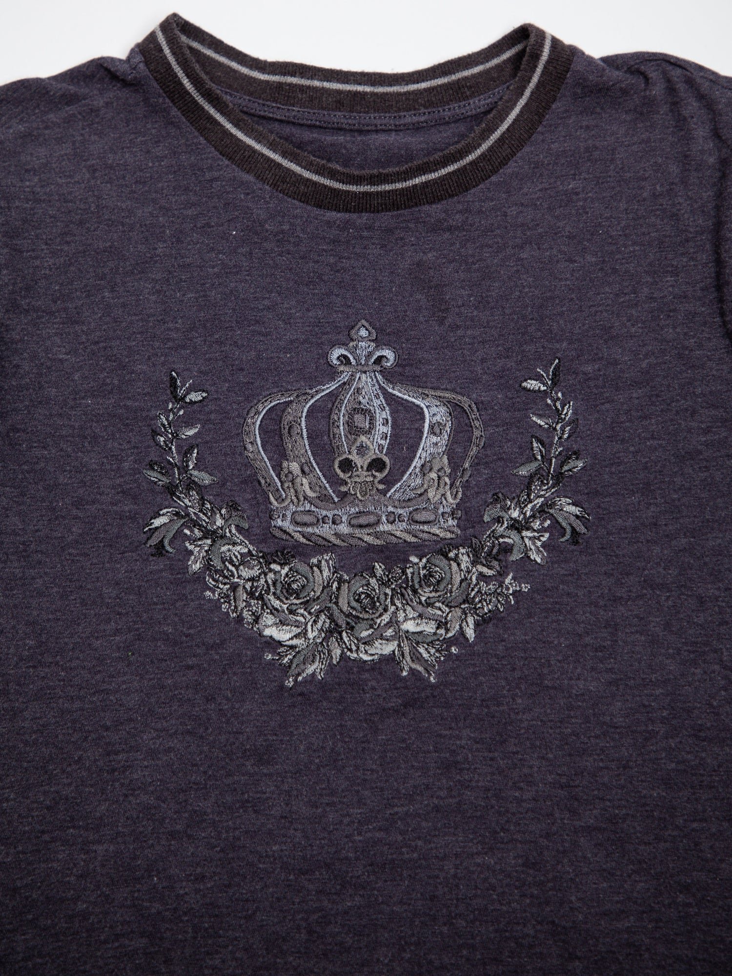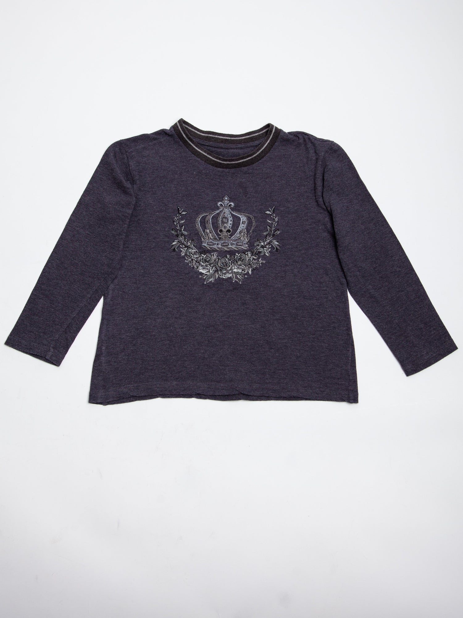 This long sleeve shirt features a stylish crown design with floral elements on the front and boasts a classic round neck with a striped pattern. The back of the shirt is plain, creating an elegant contrast. Designed for kids, this shirt is made from 100% natural cotton, ensuring comfort and breathability.