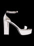 These striking footwear pieces feature a metallic silver finish, showcasing a sleek and reflective design. The shoes are constructed with a high heel and a platform base, offering both style and comfort.