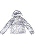 Excellent Emporio Armani Gray Hooded Jacket for Kids Size 6. This stylish hooded jacket from Emporio Armani showcases a stunning metallic silver design, perfect for the trendy young ones. Made from high-quality polyurethane, it offers a shiny and reflective look, making it a standout piece in any child's wardrobe. Featuring a secure zipper closure and two practical zippered pockets at the front, this jacket combines both function and fashion. The hood provides extra warmth and protection against the elements, while the logo detail on the chest adds a touch of brand sophistication. Ideal for casual outings or playdates, this jacket is not only fashionable but also highly versatile. It fits true to size and is in excellent condition, showing no signs of wear. Care instructions are simple; spot clean as needed to maintain its appealing appearance. Don't miss out on this incredible opportunity to own a high-end piece from Emporio Armani in an excellent condition. Please message me to confirm shipping timeframe. My full-time job involves traveling often, and shipping out may take longer than usual. Thanks for your interest.