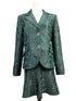 This stunning two-piece suit by Roccobarocco features a beautiful green floral pattern and is made from high-quality viscose material. The set includes a stylish jacket with two buttons and a notched collar, paired with a flattering knee-length A-line skirt. Both pieces are in excellent condition, showcasing a subtle sheen and textured fabric that adds elegance to any wardrobe.