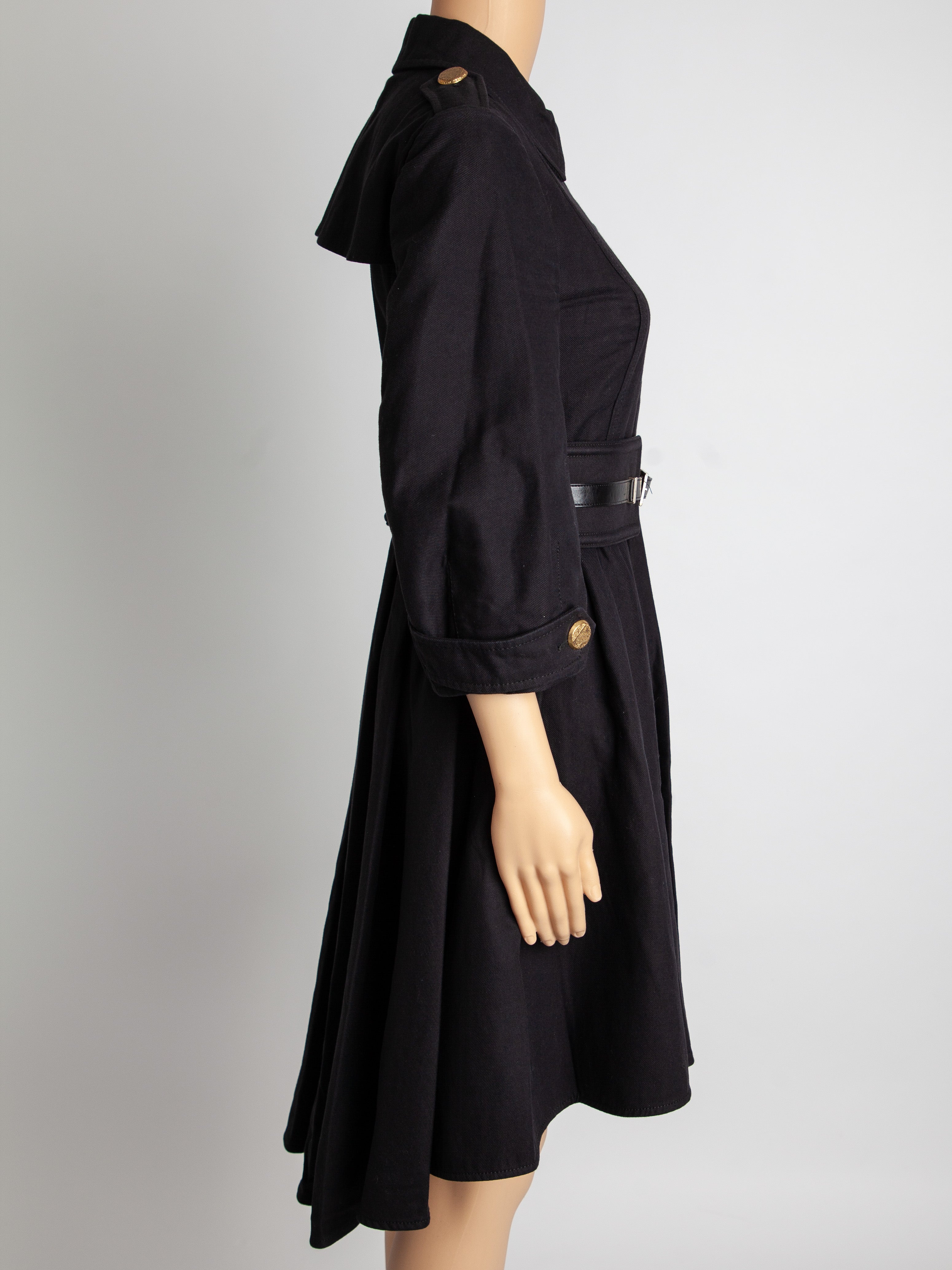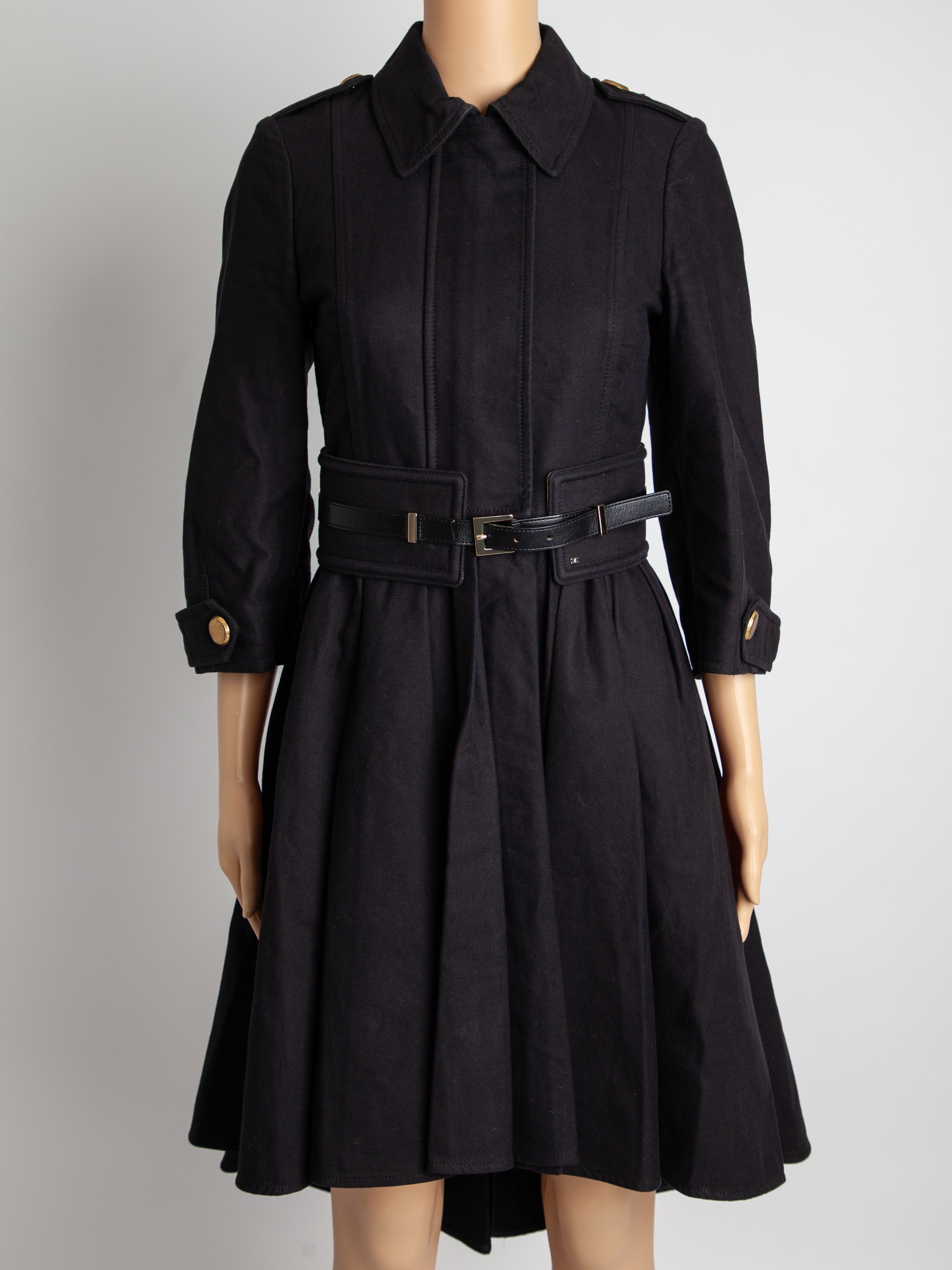 This exquisite trench coat by Elisabetta Franchi is ideal for transitioning between seasons. The structured design in sleek black features a belted waist that enhances your silhouette, complemented by elegant button details on the cuffs and shoulders. The coat also showcases a flared skirt, creating a timeless and sophisticated look.