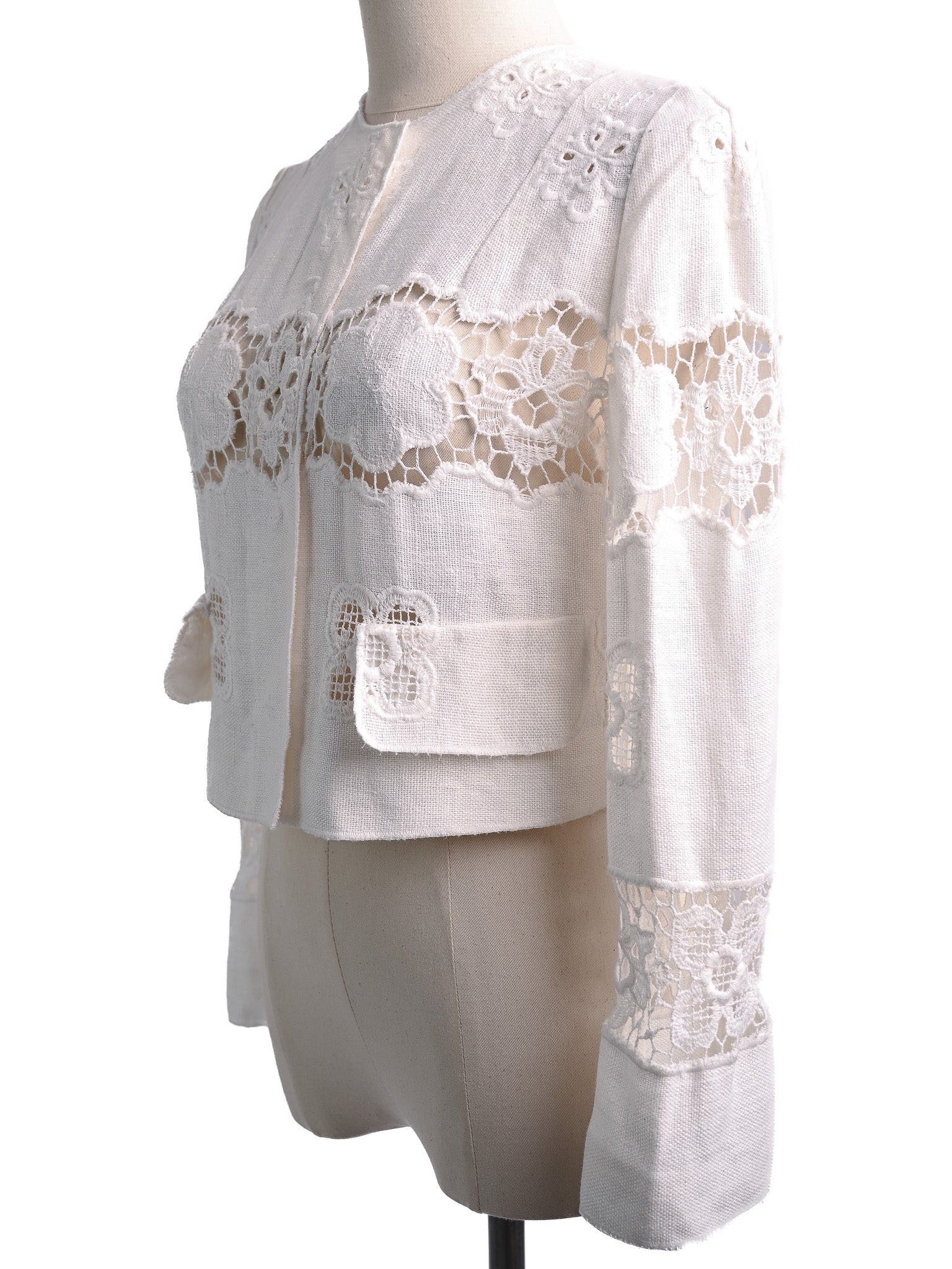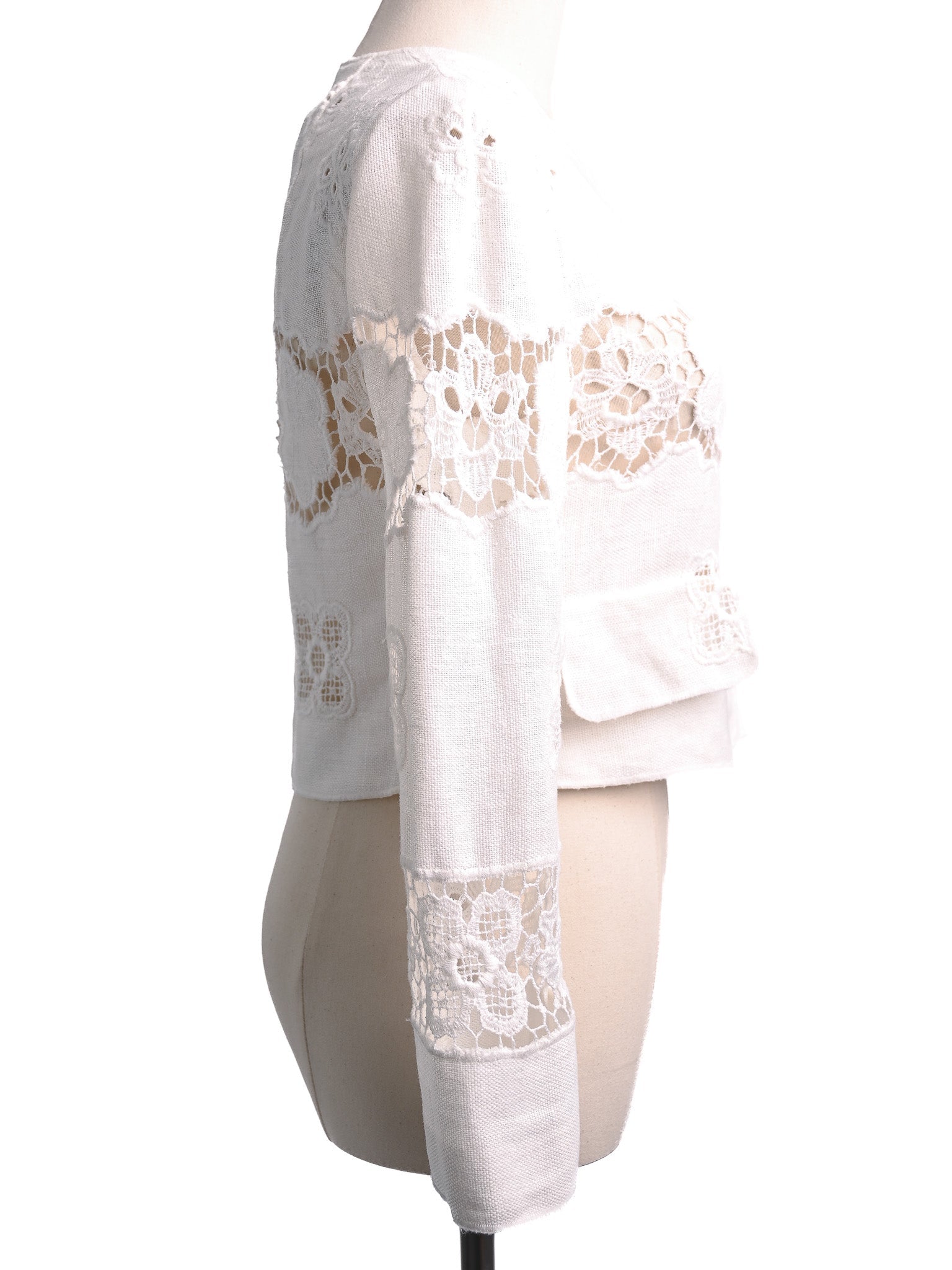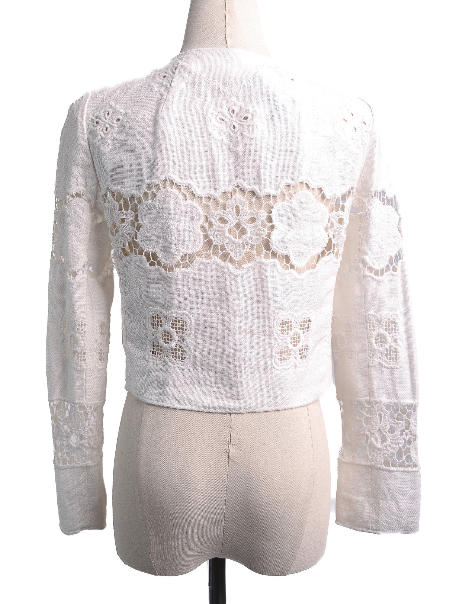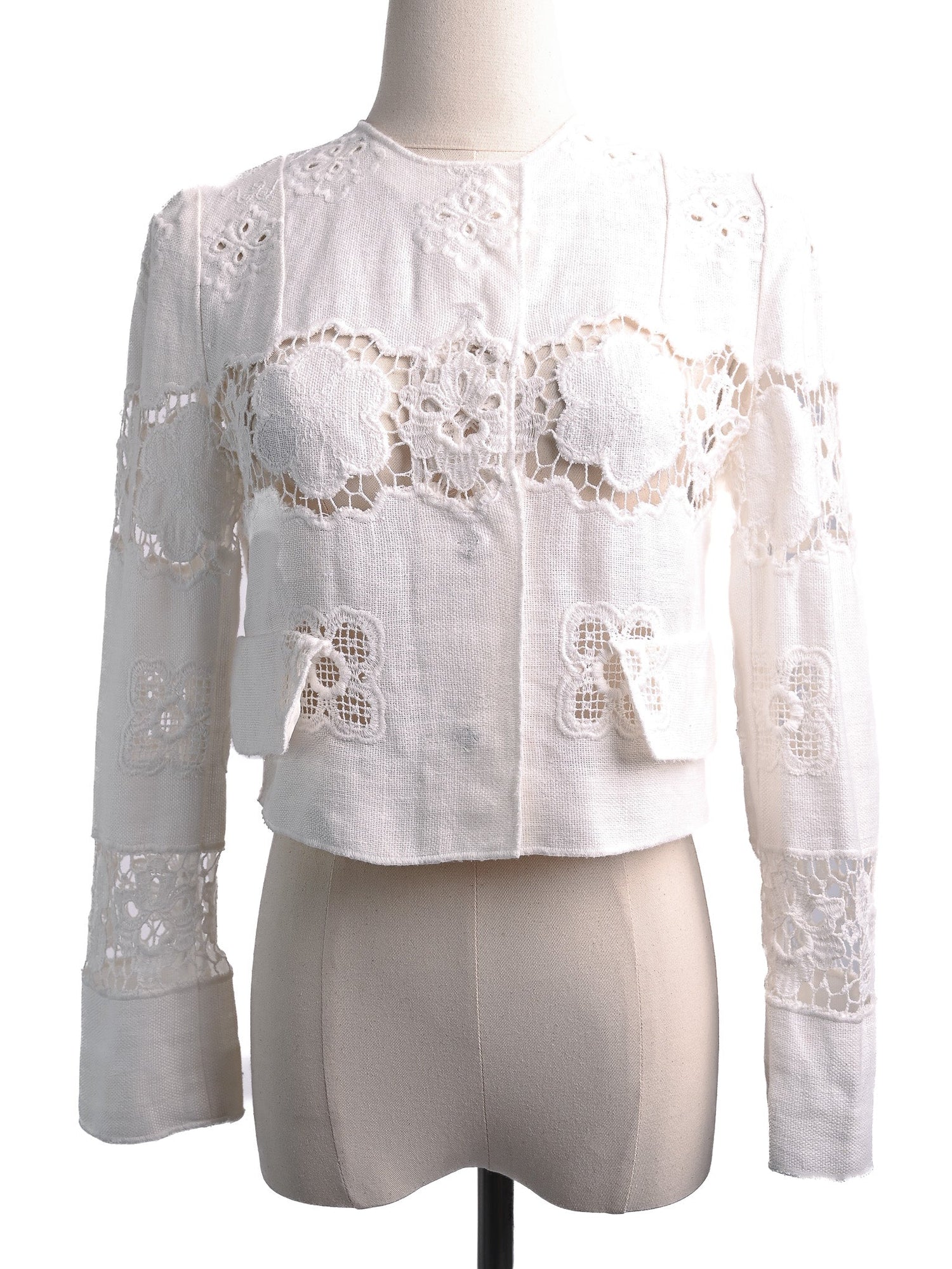 This beautiful jacket showcases intricate floral lace patterns and elegant cut-outs, making it a standout piece in any wardrobe. Designed for women, this size XS jacket is cropped with long sleeves and features a round neckline, providing a chic silhouette.
