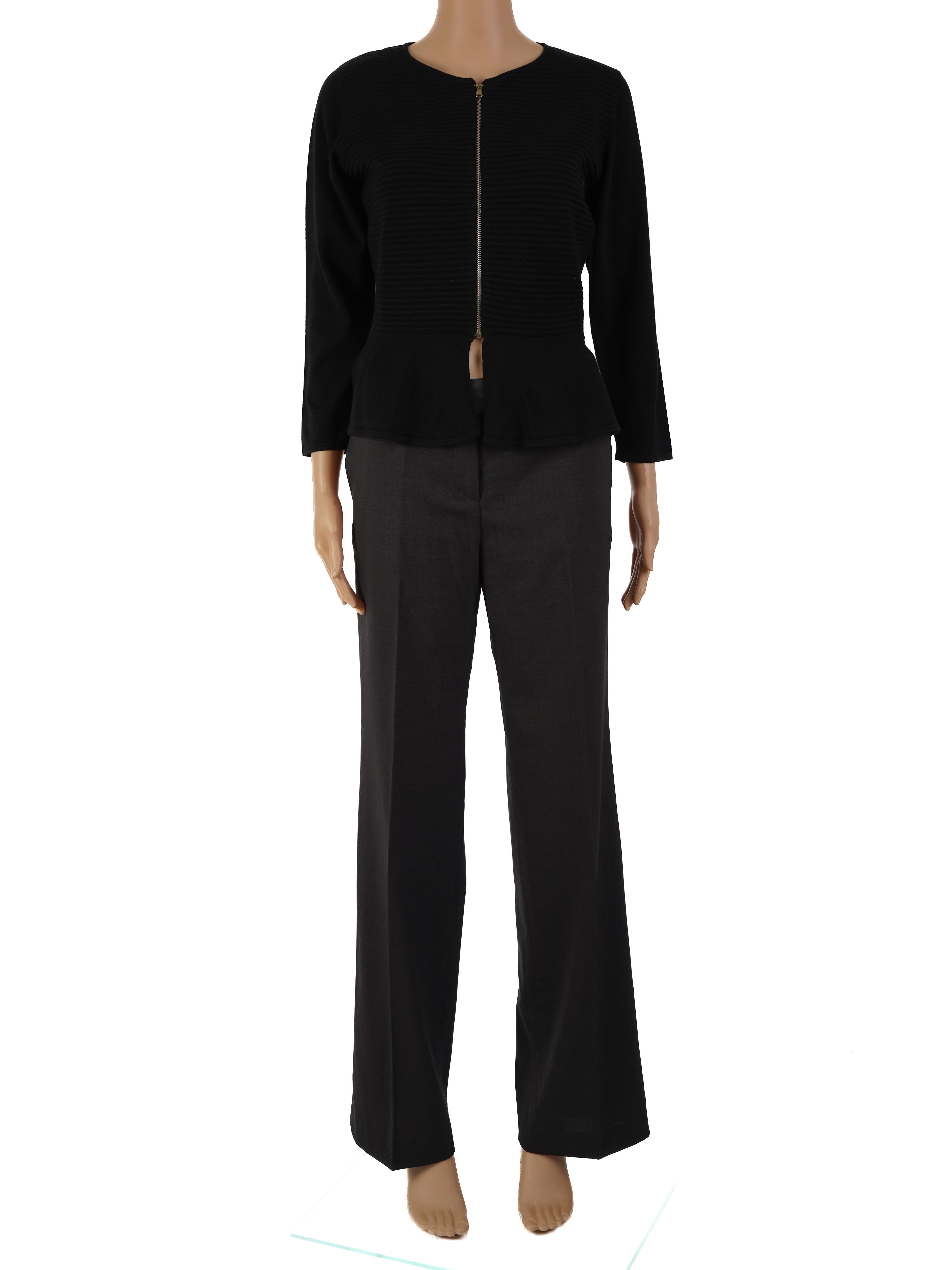 This stunning Intrend jacket features a sleek black design, perfect for elevating any outfit. The jacket showcases a unique textured design on the surface and is tailored for a flattering peplum silhouette, making it both stylish and functional.