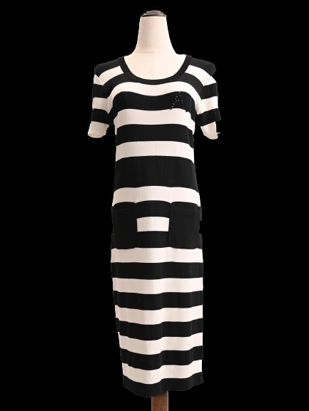 This striking dress features a captivating black and white striped design, perfect for fashion-forward women. Crafted from lightweight viscose, it offers comfort without compromising on style. The dress has short sleeves, ideal for warm weather, and comes equipped with two convenient front pockets for added functionality.
