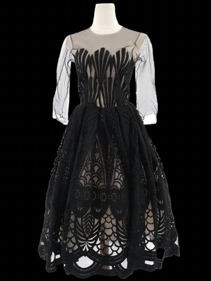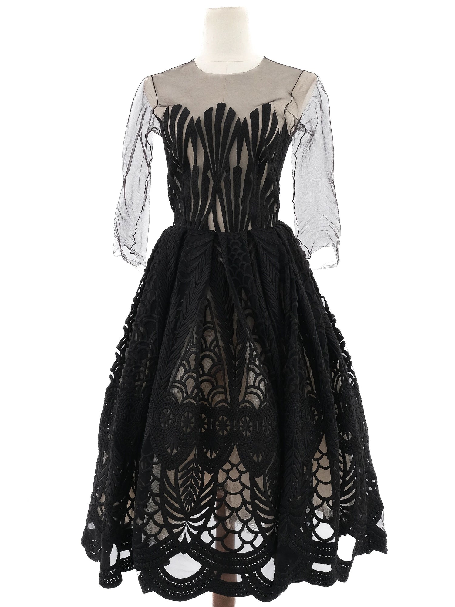 Excellent Bella Potemkina Black Lace Dress Size M. This stunning dress showcases intricate lace designs, perfect for special occasions. The elegant black color is complemented by sheer sleeves and a fitted bodice that flows into a full skirt, creating a sophisticated silhouette. The lace detailing adds a touch of luxury while the lighter fabric underneath enhances the contrast, making this piece truly eye-catching. Made from high-quality elastane, this dress offers both comfort and a flattering fit. It is in excellent condition with no flaws and fits true to size. Care instructions: Dry clean only to maintain the delicate lace and overall integrity of the dress. Approximate measurements: Size M. Ideal for cocktail parties, evening events, or upscale gatherings, this dress will make a statement wherever you go. Smoke-free and pet-free home. Please message me to confirm shipping timeframe. My full-time job involves traveling often, and shipping out may take longer than usual. Thanks for your interest.