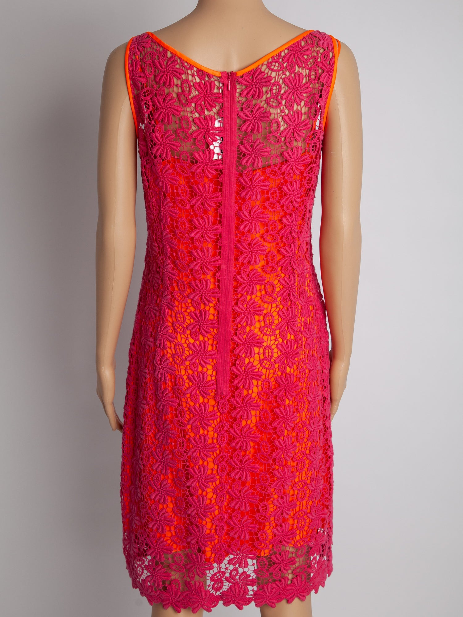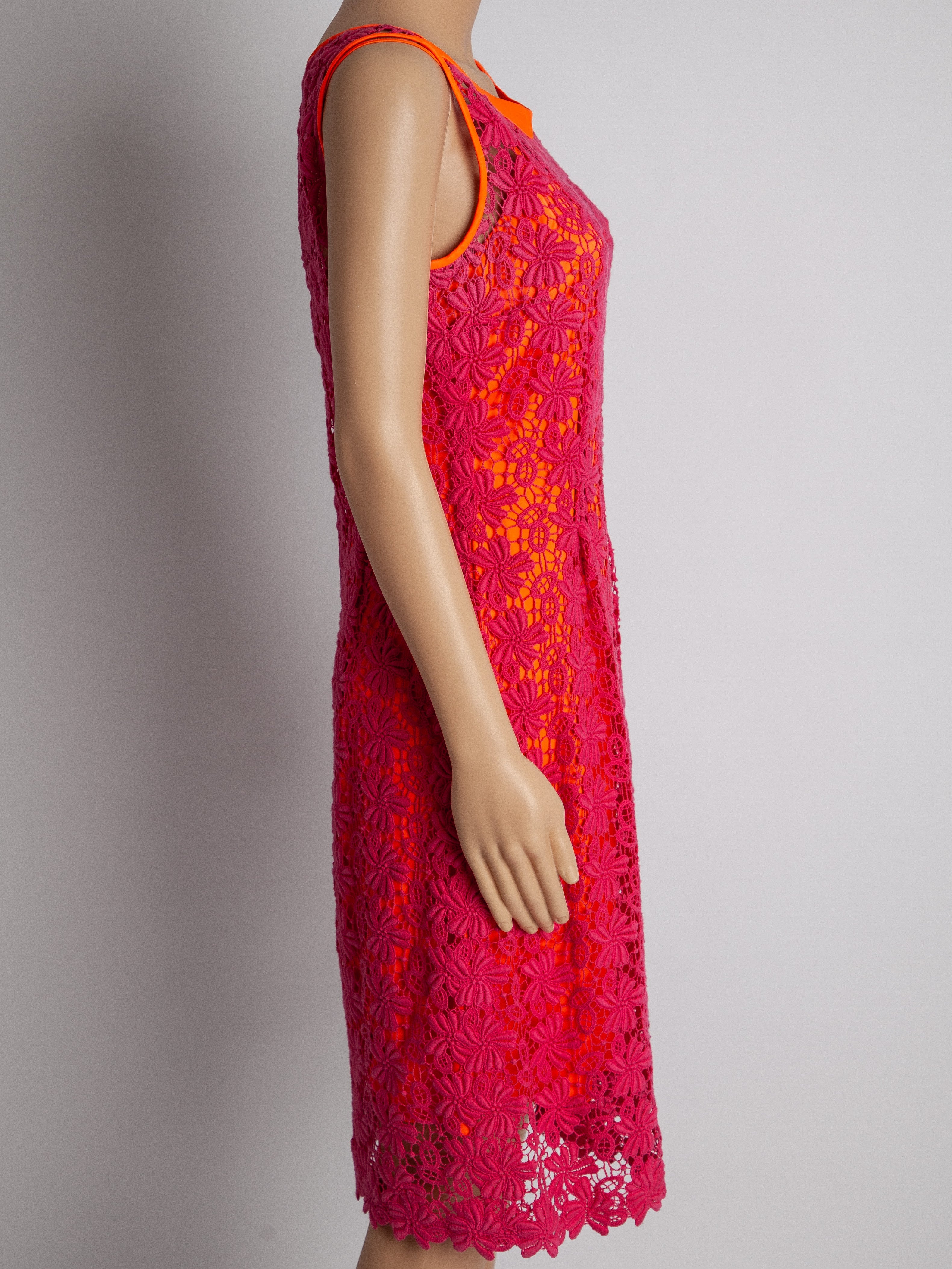 This vibrant pink dress by Elie Tahari is in excellent condition, featuring a stunning floral lace design with an orange underlayer. Size S, it fits true to size and is perfect for various occasions, from casual outings to semi-casual events.