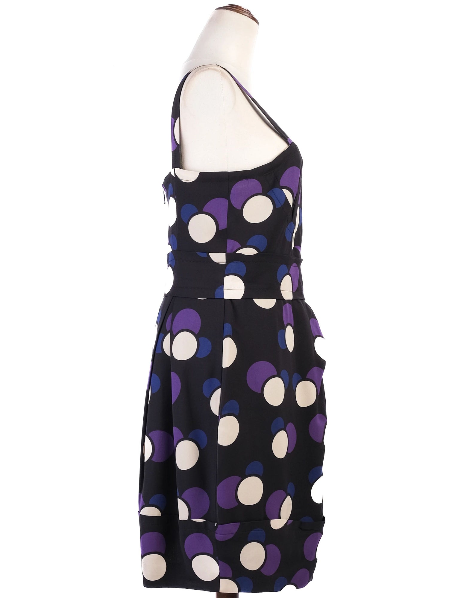 Excellent Marc Jacobs Silk Sleeveless Dress Size M Polka Dots This stunning Marc Jacobs dress combines elegance and playfulness, making it a perfect addition to any wardrobe. Crafted from luxurious silk, this sleeveless dress features a vibrant pattern of large polka dots in purple, blue, and white against a striking black background. The dress is designed for a flattering fit, boasting a fitted top that transitions into a knee-length skirt, ideal for both casual and semi-formal occasions. Condition is excellent, with no flaws, and it fits true to size, making it a delightful piece for women who appreciate quality and style. The dress includes a convenient zipper at the back for easy wear. Care instructions recommend dry cleaning to maintain the integrity of the silk fabric. With its unique design and high-quality material, this dress is perfect for events ranging from cocktail parties to evening outings. It comes from a smoke-free and pet-free home, ensuring that it remains in pristine condition. Please message me to confirm shipping timeframe. My full-time job involves traveling often, and shipping out may take longer than usual. Thanks for your interest.