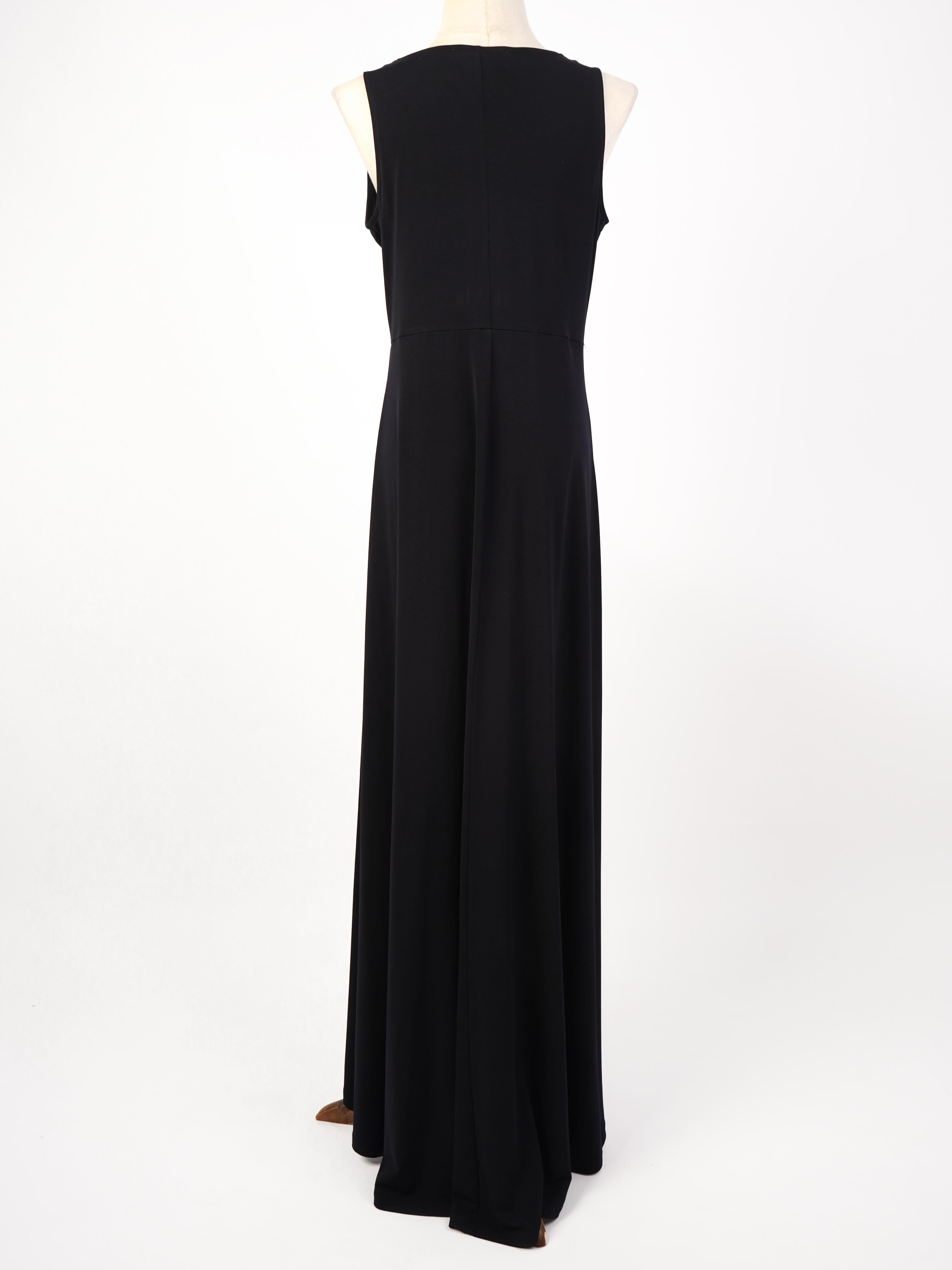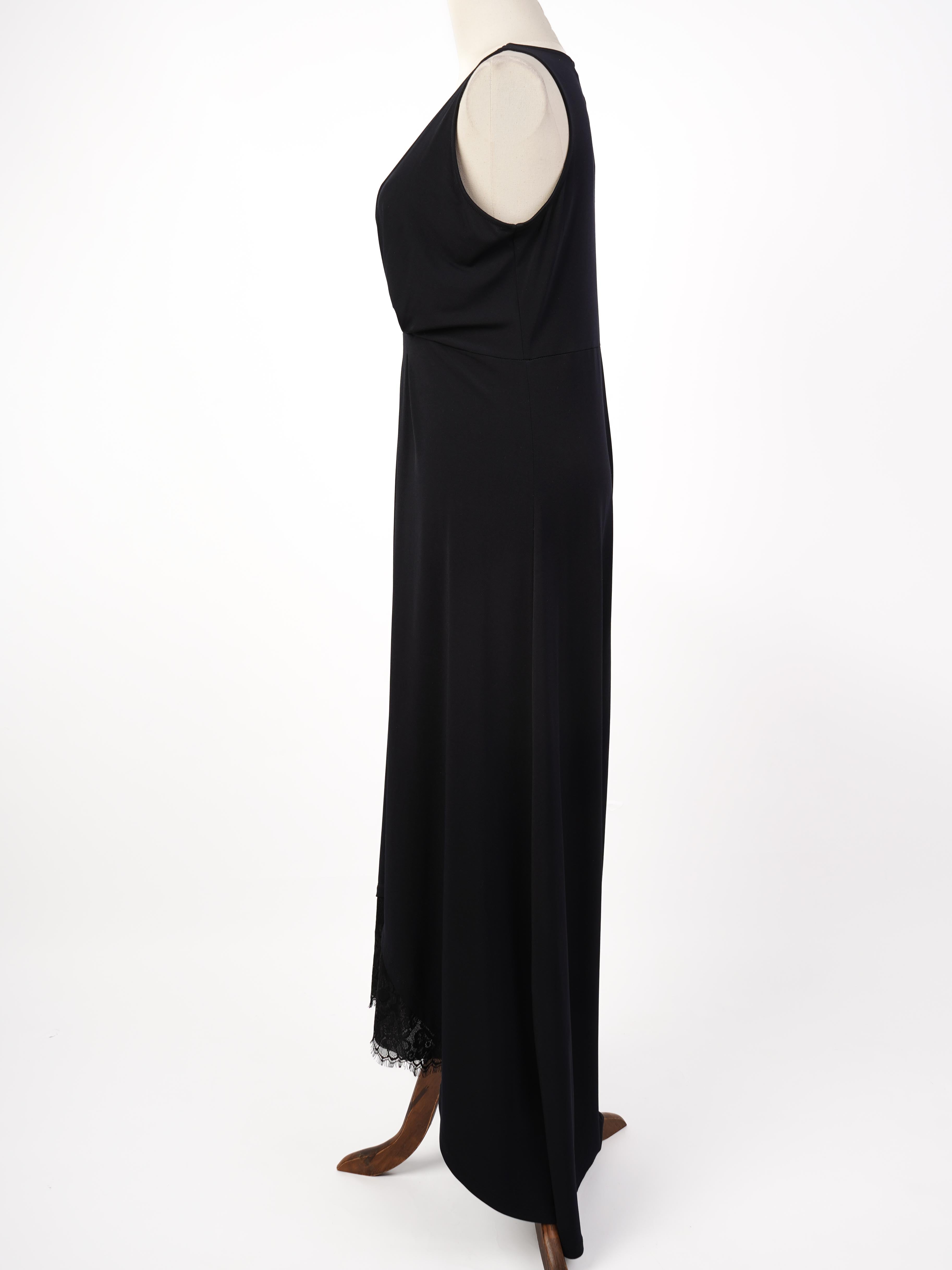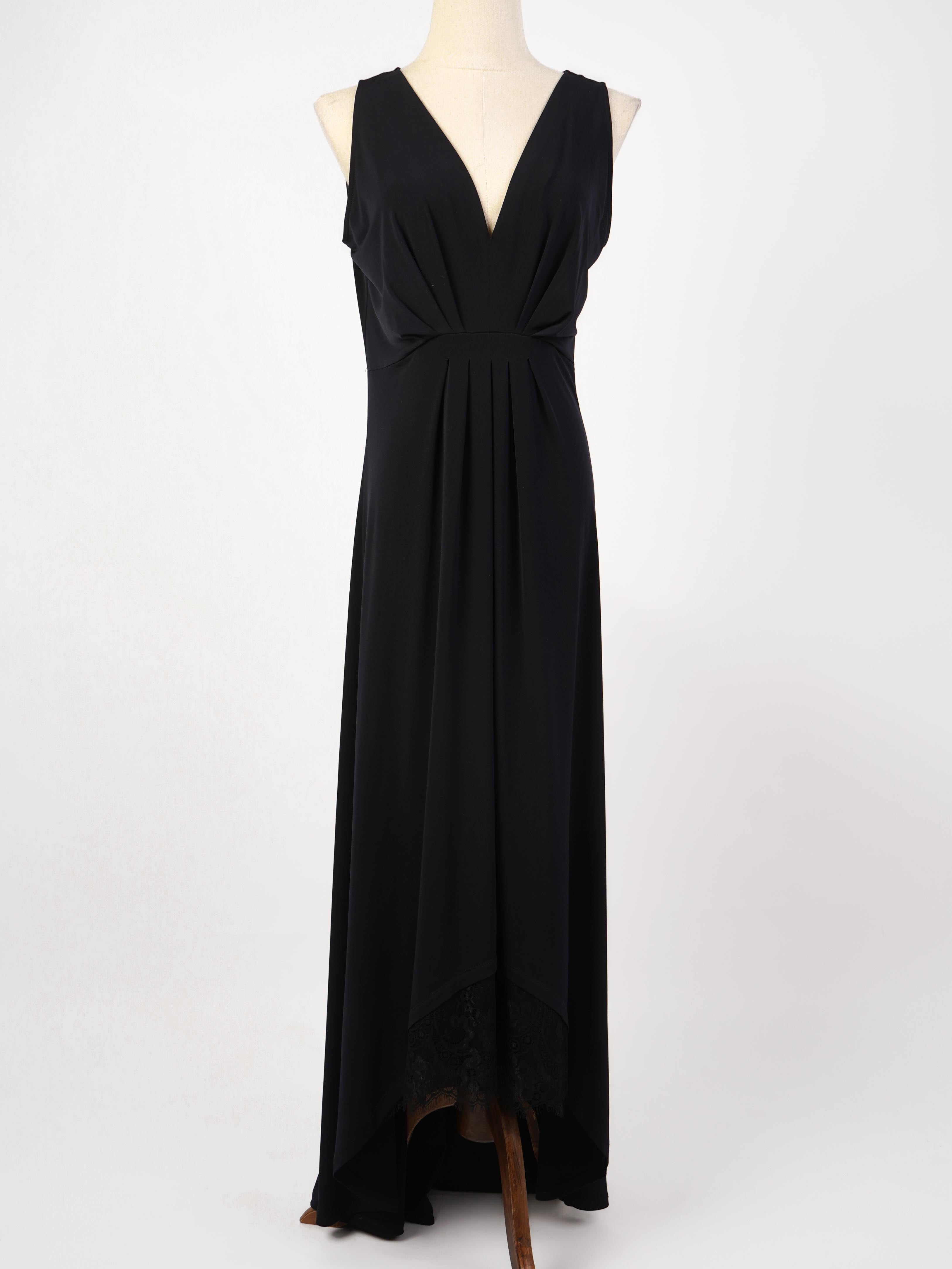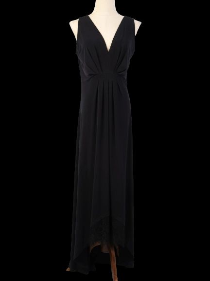 This stunning black sleeveless dress by Michael Kors is the perfect addition to any women's wardrobe. Designed with a flattering V-neckline and elegant pleated detailing at the bust, this dress is both stylish and sophisticated. The gently flared long skirt adds movement and grace, while the delicate lace trim on the hem adds a touch of femininity.