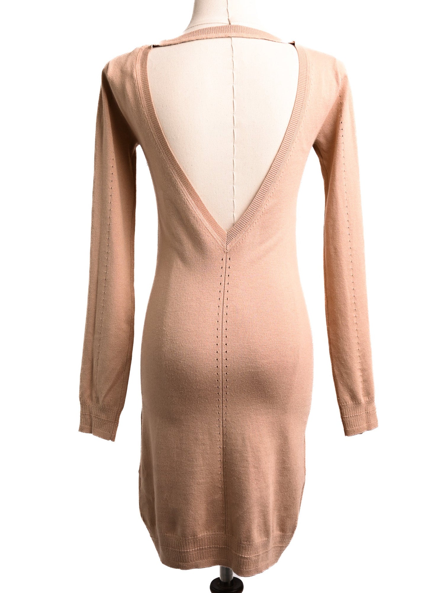 The dress features a form-fitting design complemented by long sleeves and a sophisticated deep V-cut at the back, adding an elegant touch. Its neutral white color makes it a versatile addition to your wardrobe, suitable for both casual outings and more formal occasions.