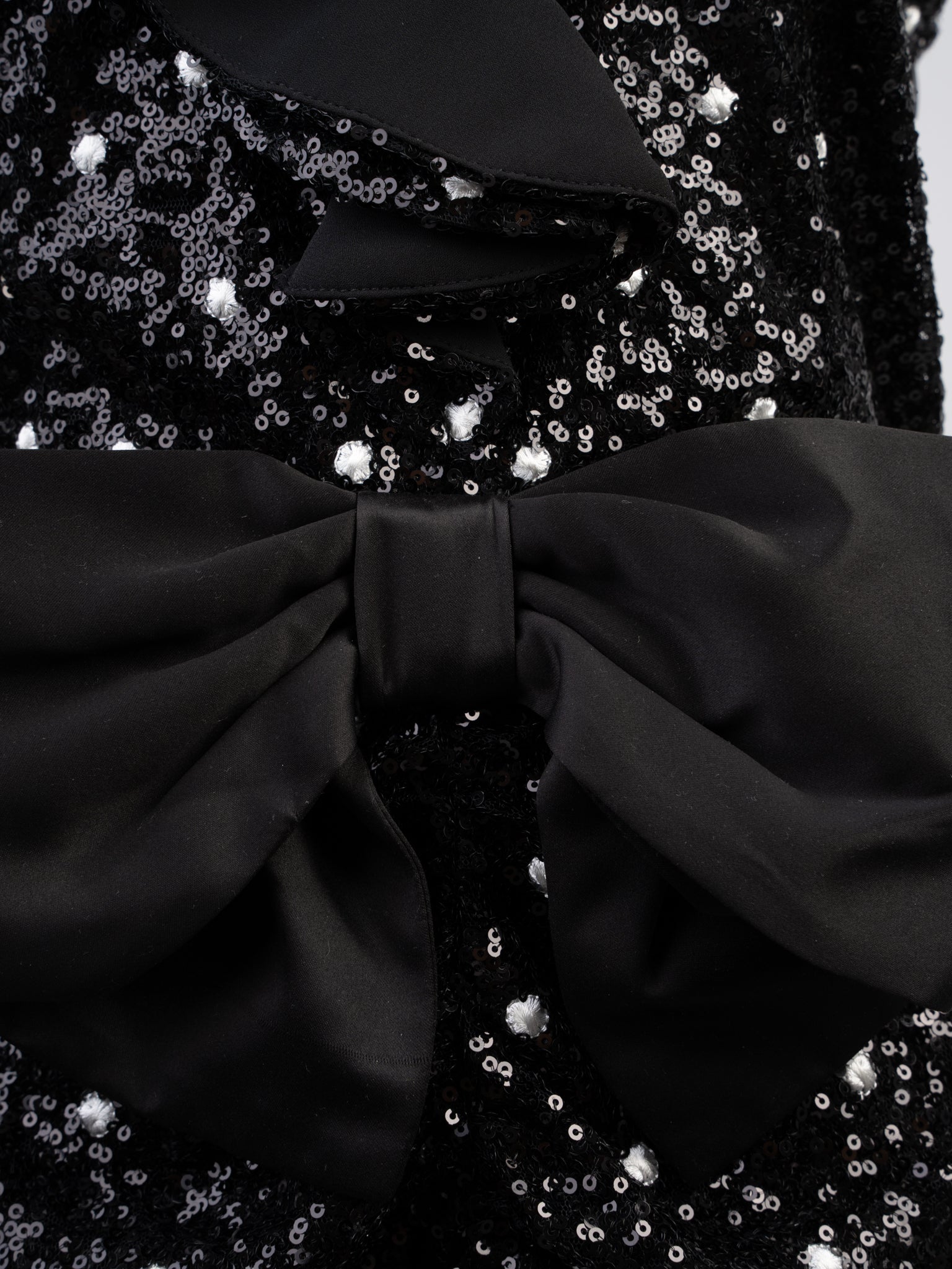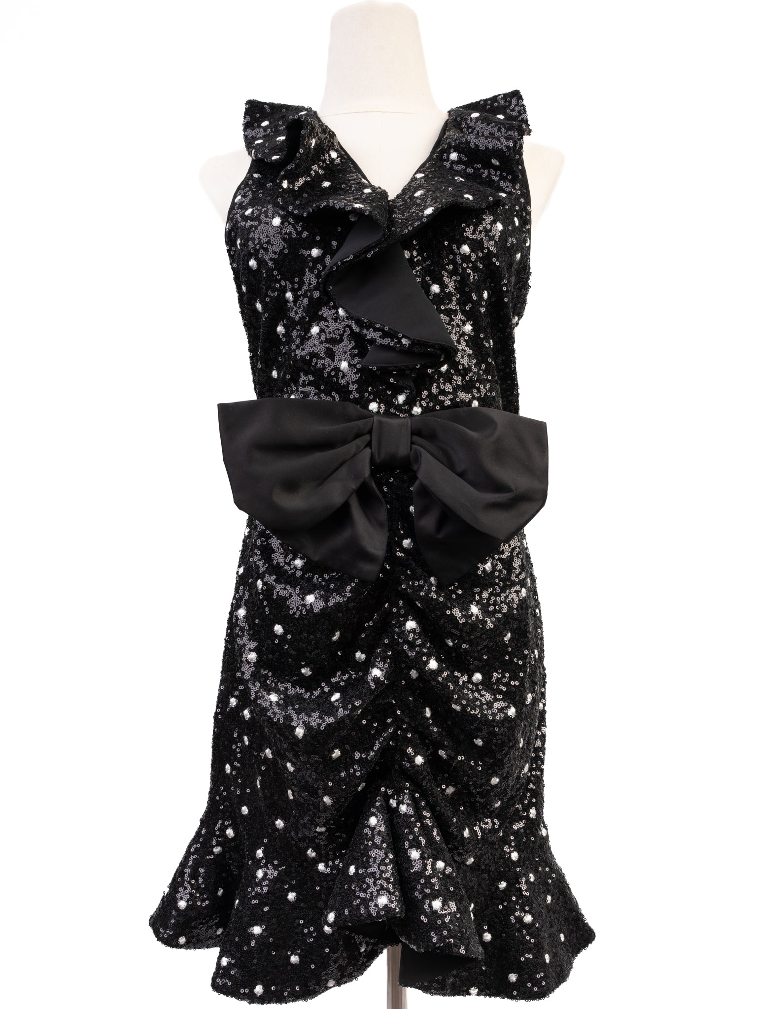 This elegant sleeveless dress is designed by H&M in collaboration with Giambattista Valli, making it a standout piece for any wardrobe. It is well-maintained in good condition, showcasing a stunning black color adorned with a beautiful sequin design. The dress features a large black bow at the waist, adding a touch of sophistication, and showcases a ruffled neckline that enhances its feminine appeal.