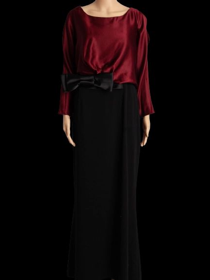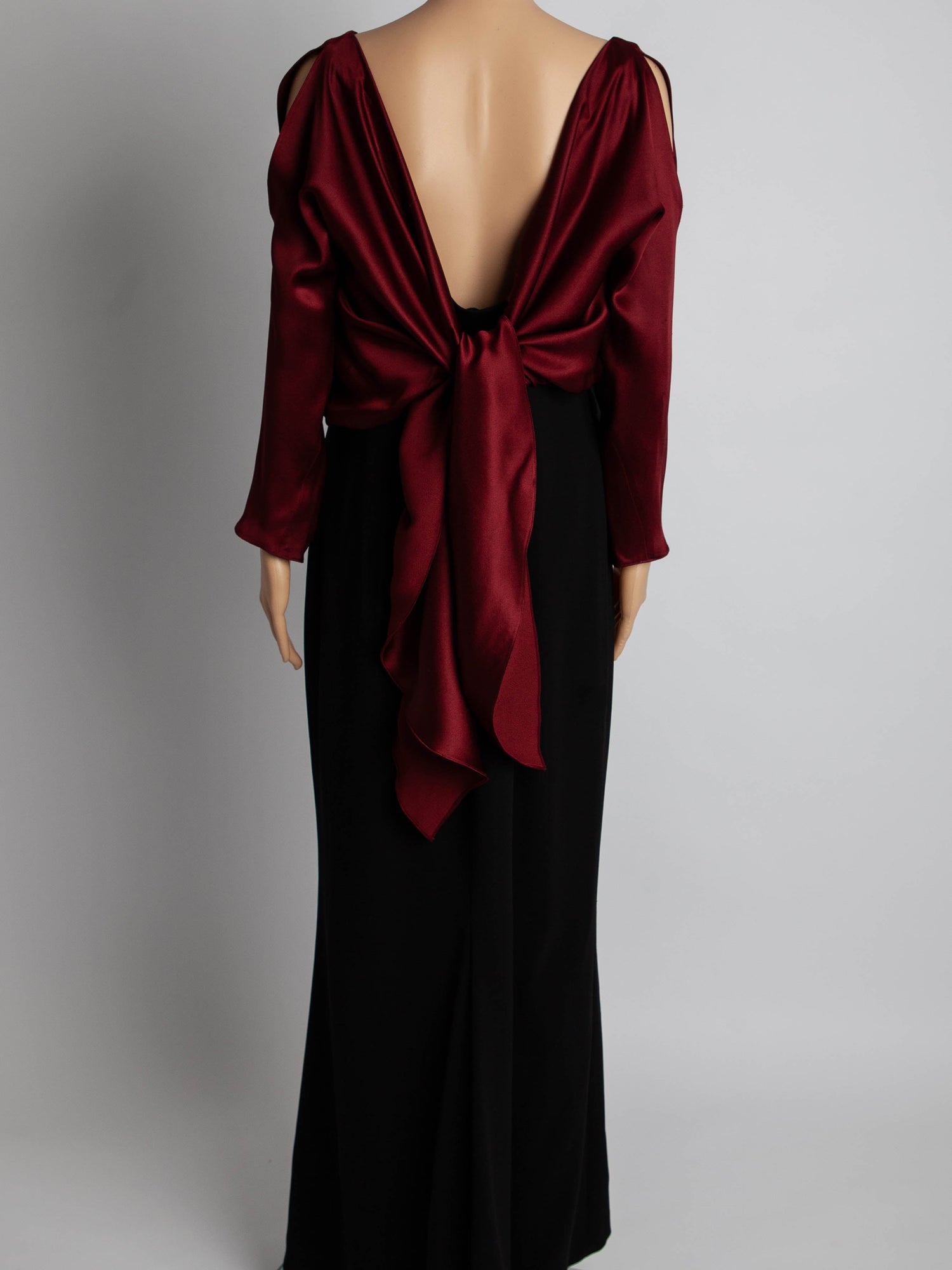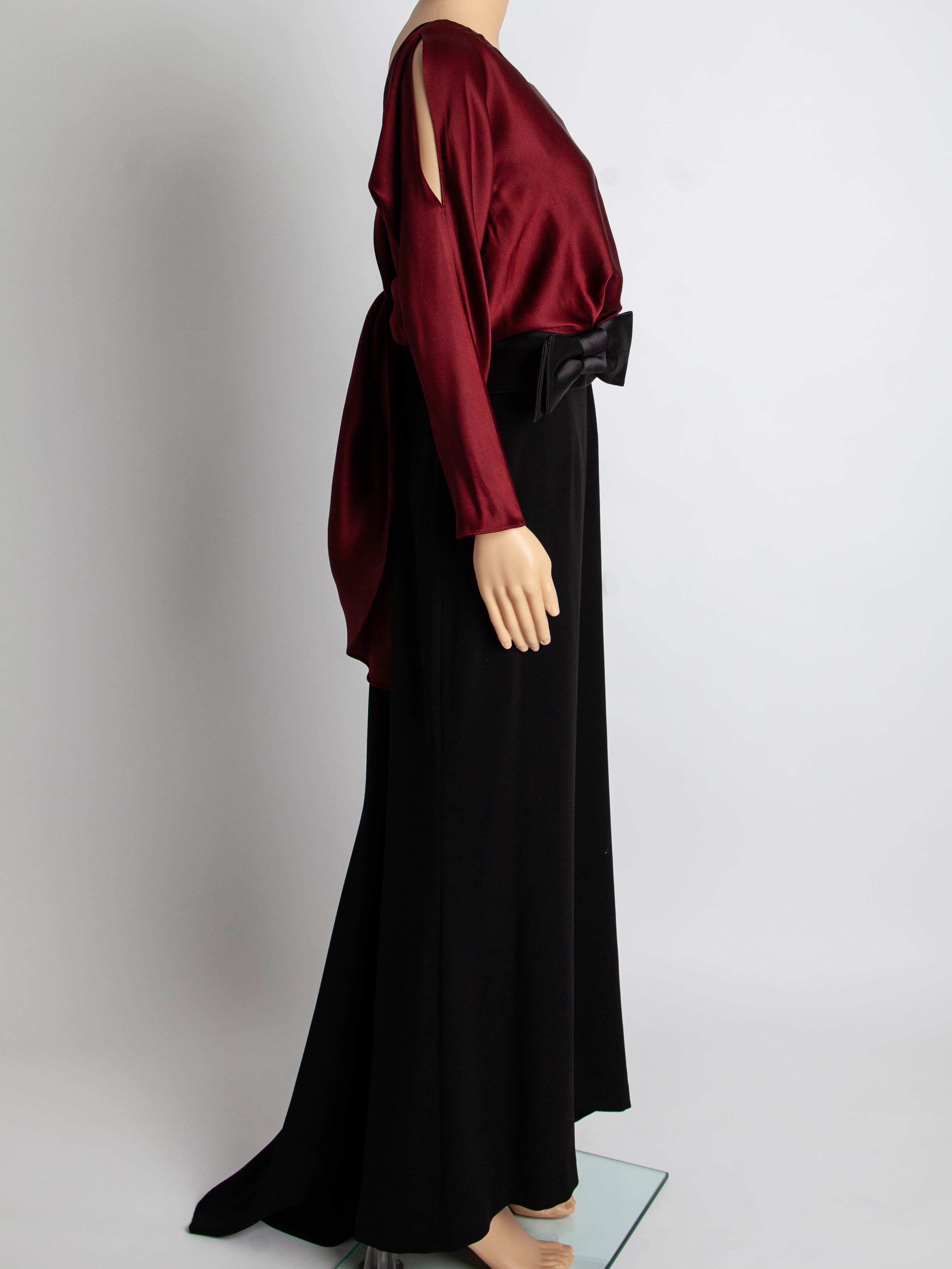 This elegant dress from Paule KA features a sophisticated design, suitable for formal occasions. The garment is sized 46 (equivalent to XL) and showcases a striking deep burgundy satin top with long sleeves, complemented by a flowing black silk skirt. The open back design adds a modern twist, while the black bow detail at the waist enhances the overall silhouette.