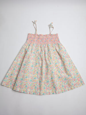 This charming floral-patterned dress by Petit Bateau is perfect for your little one's wardrobe. Made from natural cotton, it offers comfort and breathability for all-day wear. The dress features a smocked top for a snug fit, complemented by thin straps and a flowing skirt that allows for easy movement.