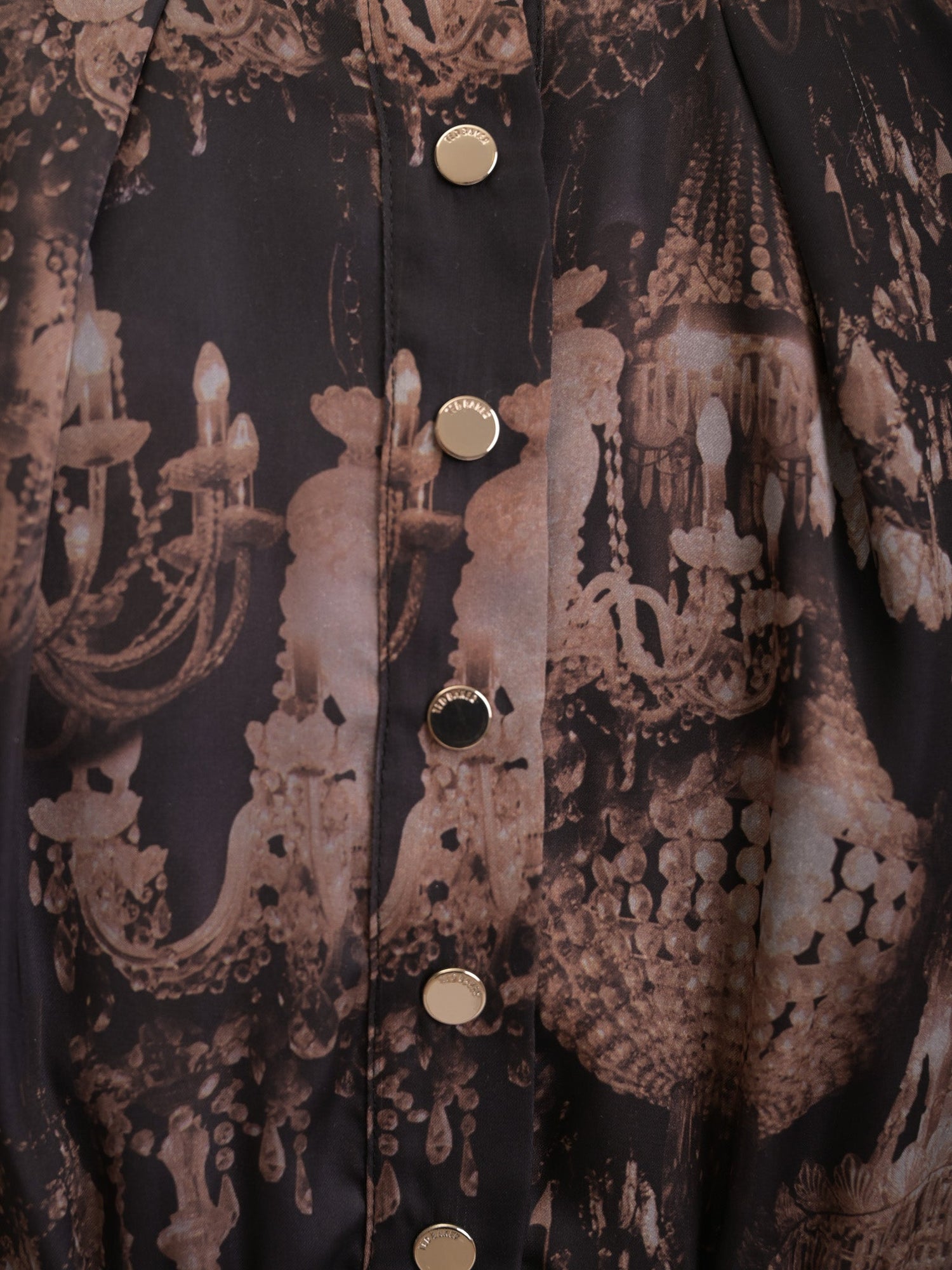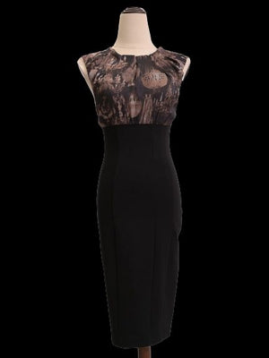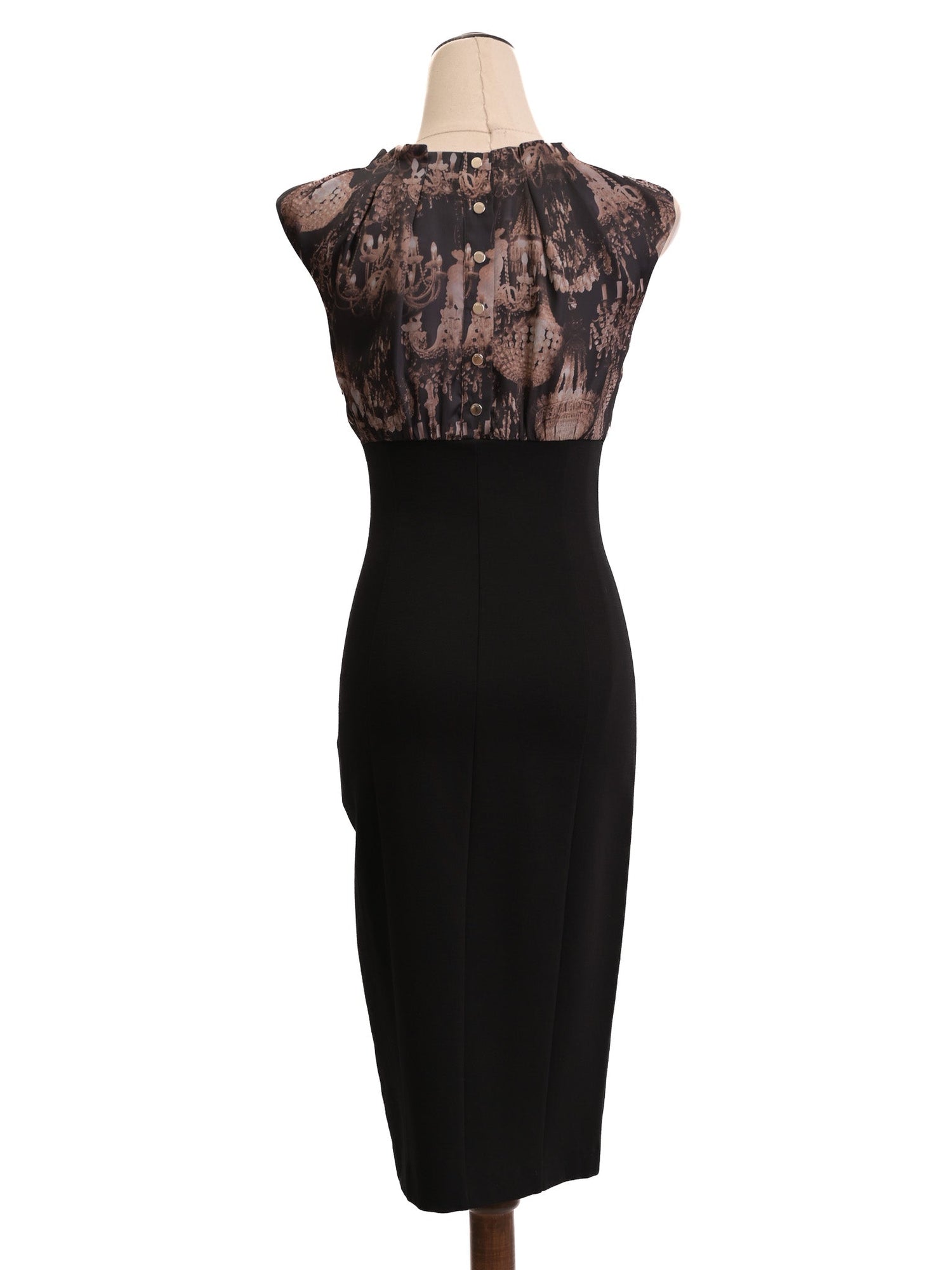 This exquisite dress by Ted Baker features a beautiful combination of colors with an intricate patterned top, showcasing designs that resemble ornate chandeliers. The fitted silhouette flatters the figure, while the black skirt adds a touch of sophistication.
