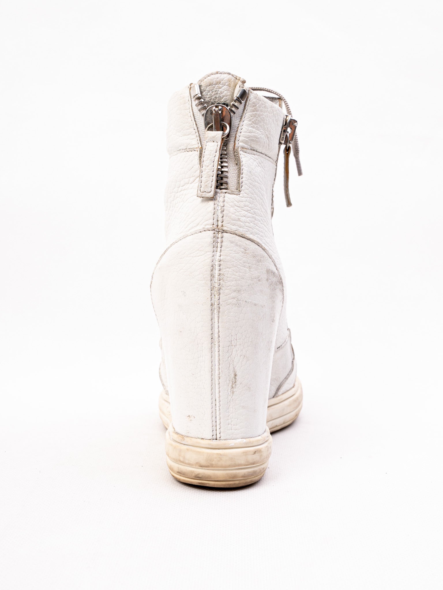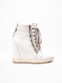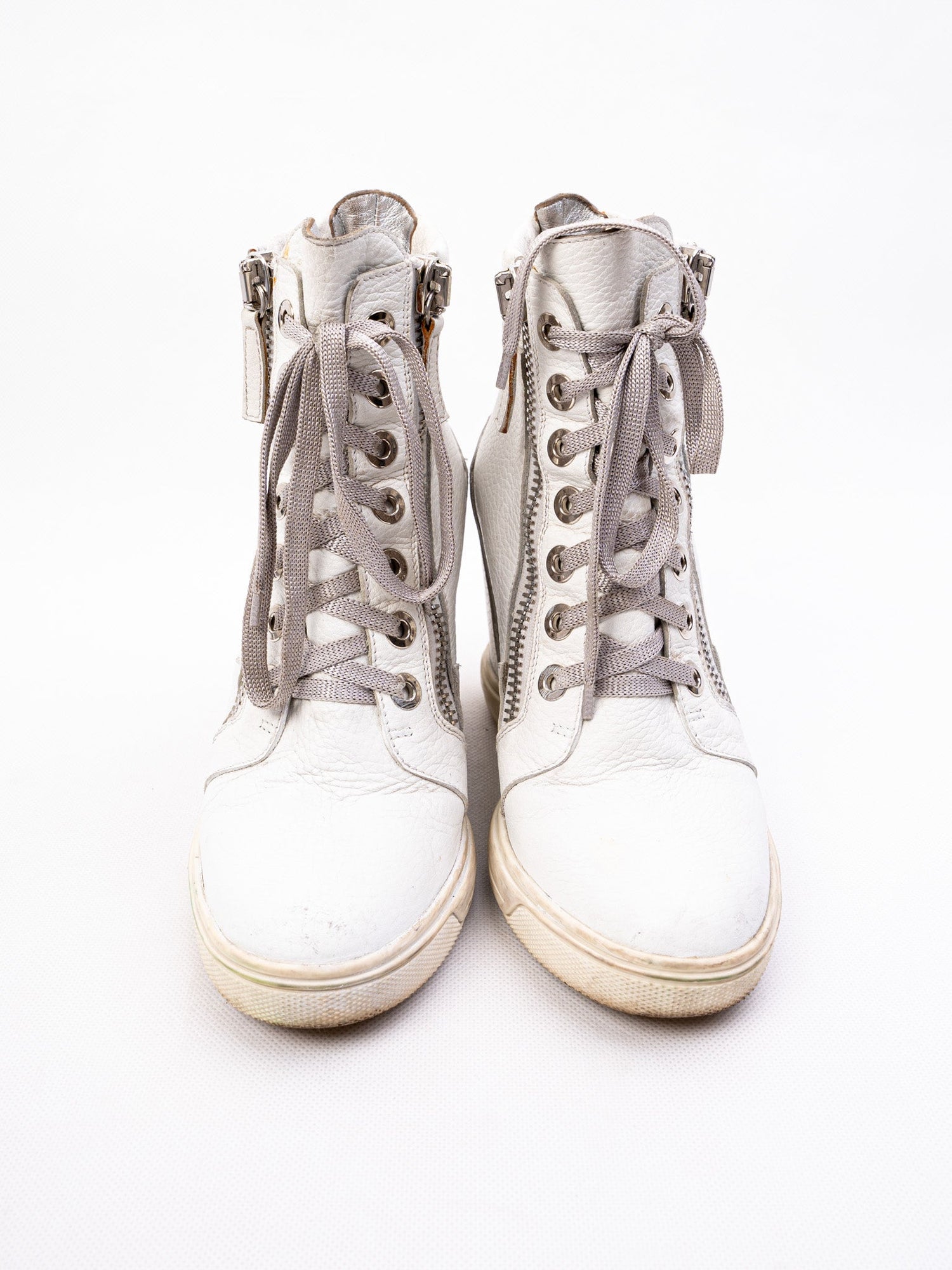 Step into style with these Gianmarco Lorenzi high-top sneakers, featuring a striking wedge heel. Crafted from genuine leather, these white sneakers offer a textured finish that adds a unique touch to your wardrobe. The size 36 is perfect for those looking for a comfortable fit with a fashionable edge.