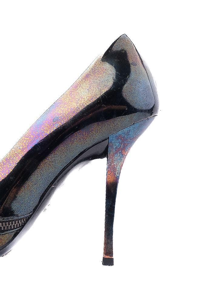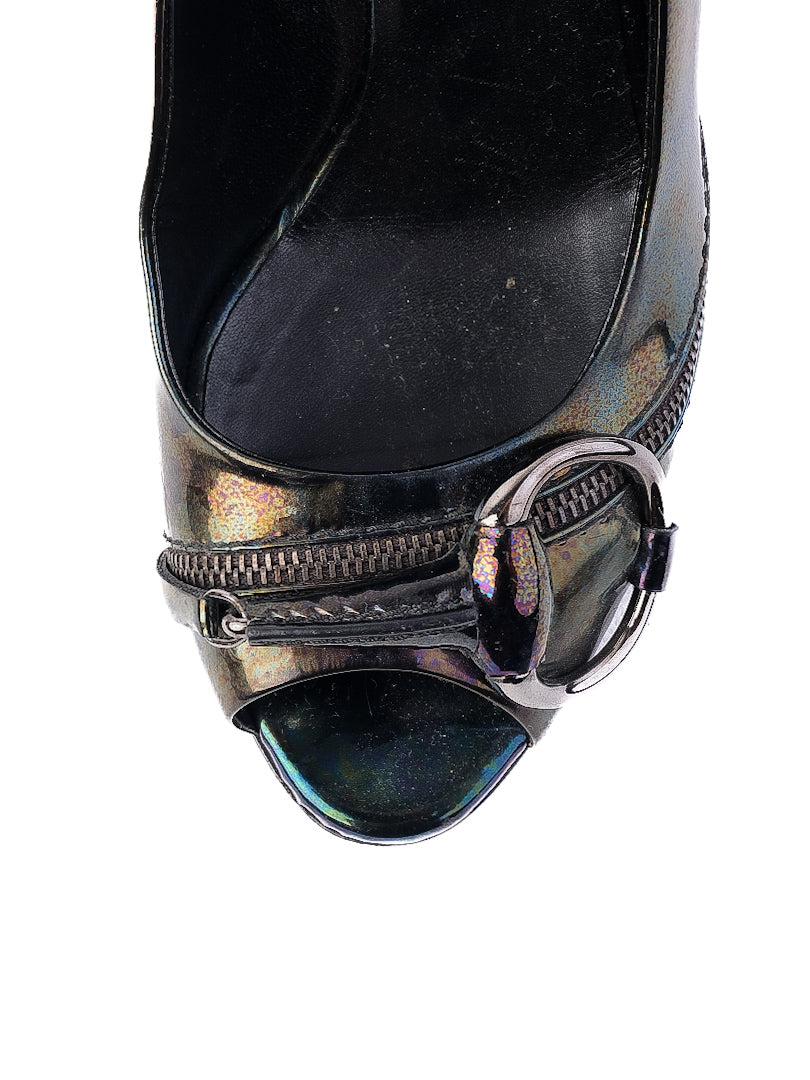Average Gucci High-Heeled Shoes Combined Leather Size 37. These stylish high-heeled shoes from the renowned brand Gucci feature an eye-catching iridescent finish that reflects light beautifully, making them a statement piece in any wardrobe. The combined color provides a dynamic appearance that is sure to stand out. Designed for women, these shoes include a peep toe that adds a trendy touch, complemented by a secure metal buckle detail and elegant zipper-like trim along the edge. Condition is average, showing some signs of wear but still maintains their charm and style. The shoes are made from genuine leather, ensuring both durability and luxury. Size 37 fits true to size, providing a comfortable fit for everyday wear. Care for these shoes by using a specialized leather cleaner to maintain their shine and condition. Ideal for occasions such as semi-casual outings or evening events, these Gucci high-heels will elevate any ensemble. Smoke-free and pet-free home. Please message me to confirm shipping timeframe. My full-time job involves traveling often, and shipping out may take longer than usual. Thanks for your interest.