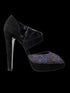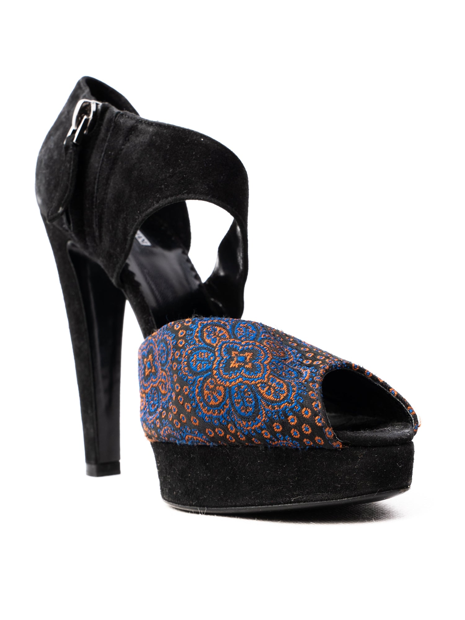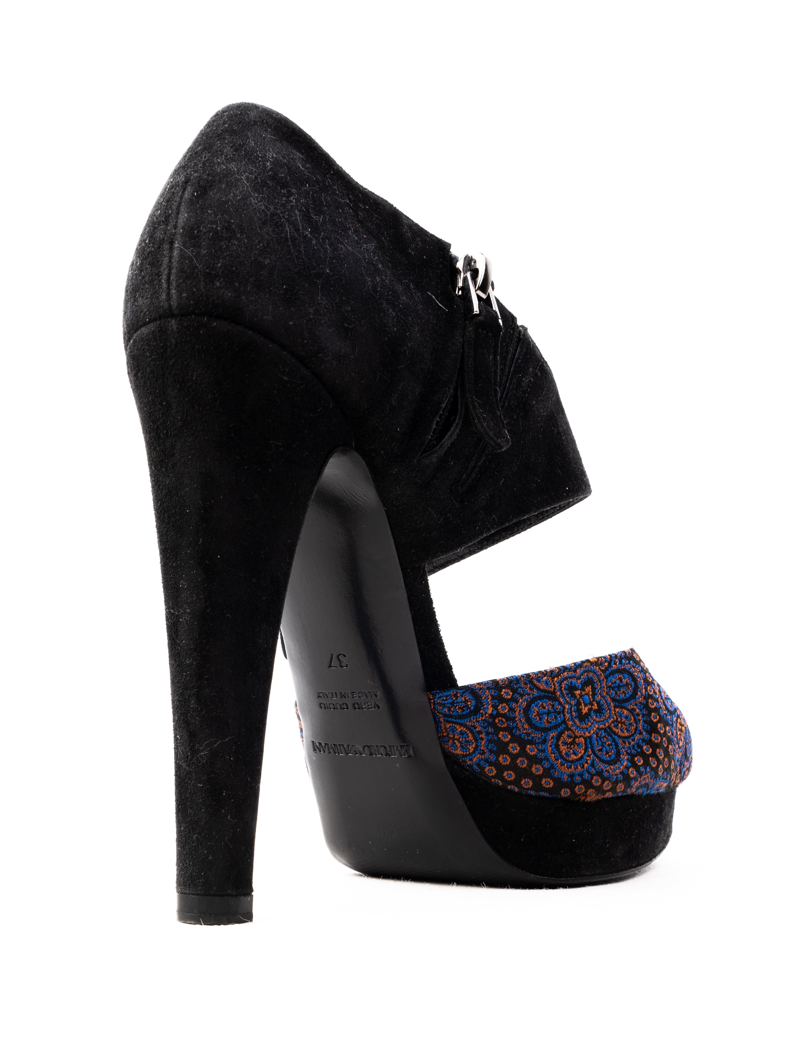 These elegant high-heeled shoes by Emporio Armani are in excellent condition, showcasing a stunning combination of textures and colors. The upper features a unique blue and brown patterned design, adding a sophisticated touch to any outfit. With black heels and a platform sole, they offer both style and comfort, perfect for dressy occasions.
