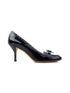 This stunning pair of high-heeled shoes from Gucci is crafted from premium patent leather, showcasing a sleek glossy finish that is sure to turn heads. Designed for women, these shoes feature decorative studs along the edges and a beautifully detailed bow with metallic accents at the front, adding a touch of elegance to any outfit.