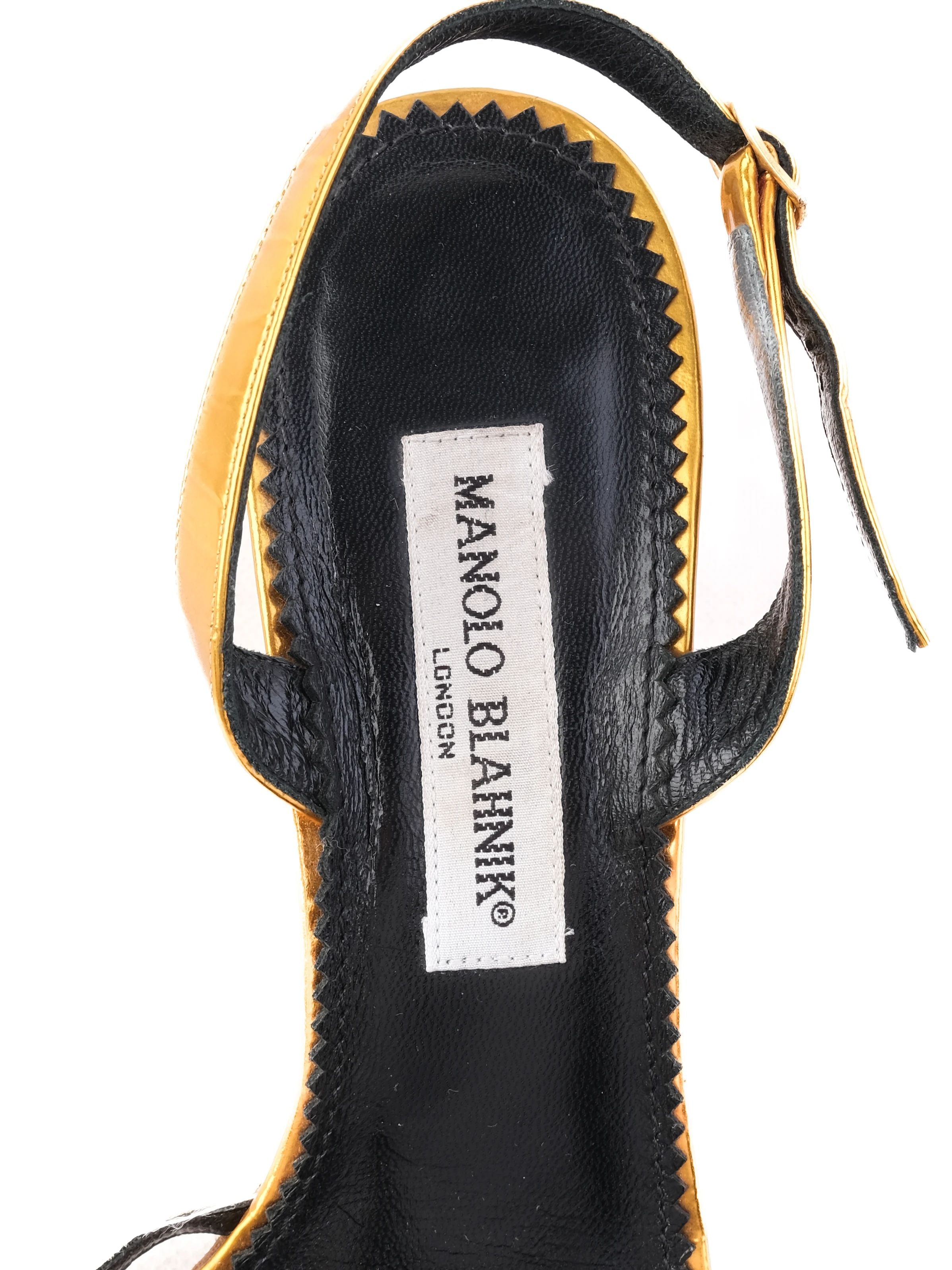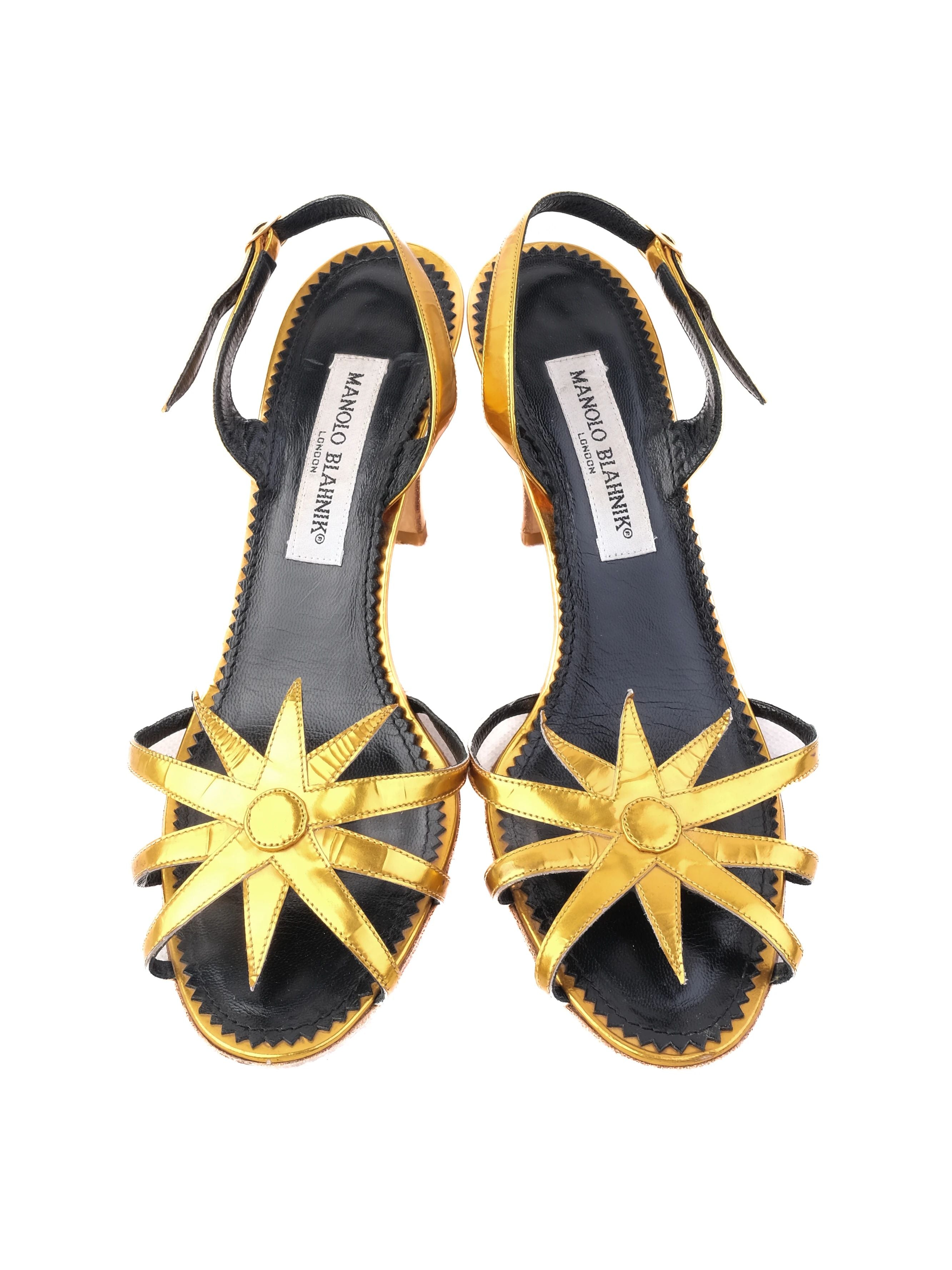 Excellent Manolo Blahnik Yellow Leather High-Heeled Sandals Size N/A Step into sophistication with these stunning high-heeled sandals by Manolo Blahnik. Crafted from genuine leather, these exquisite shoes feature a vibrant yellow color that is sure to make a statement. The glossy gold finish and eye-catching black accents highlight the intricate star-like pattern on the front, adding a touch of elegance and flair. Designed with an open toe and a slender heel, these sandals ensure that your style remains chic and fashionable. Condition is excellent, showing minimal signs of prior wear. The adjustable ankle strap provides a comfortable fit, making them perfect for various occasionsÑbe it a cocktail party or an evening out. These sandals not only elevate your outfit but also showcase the signature craftsmanship that Manolo Blahnik is renowned for. Care instructions: Wipe clean with a soft cloth to maintain their beauty. Elevate your shoe collection with these luxurious sandals that embody both style and quality. Please message me to confirm shipping timeframe. My full-time job involves traveling often, and shipping out may take longer than usual. Thanks for your interest.