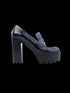These stunning shoes are crafted from genuine leather and feature a sleek, shiny black finish that exudes sophistication. Designed in a chic loafer-style, they are enhanced by a moccasin toe and a thick, chunky platform sole for added comfort and stability.
