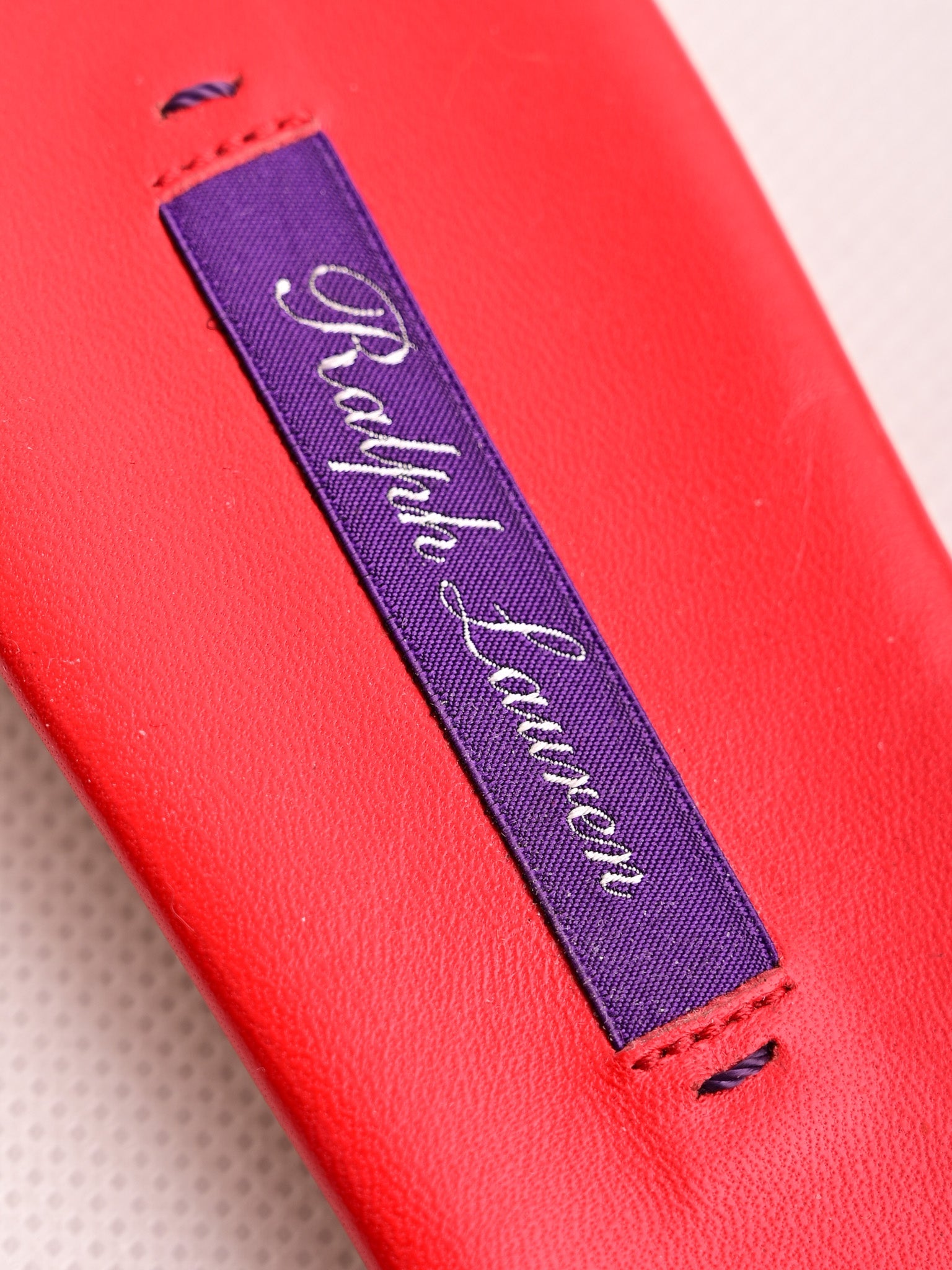 These stylish flat sandals are crafted from high-quality genuine leather, featuring a vibrant red color that adds a pop to any outfit. The minimalist design includes a single strap across the foot adorned with a decorative emblem bearing the letter 'R'. The insole is branded with 'Ralph Lauren', ensuring authenticity and brand prestige.
