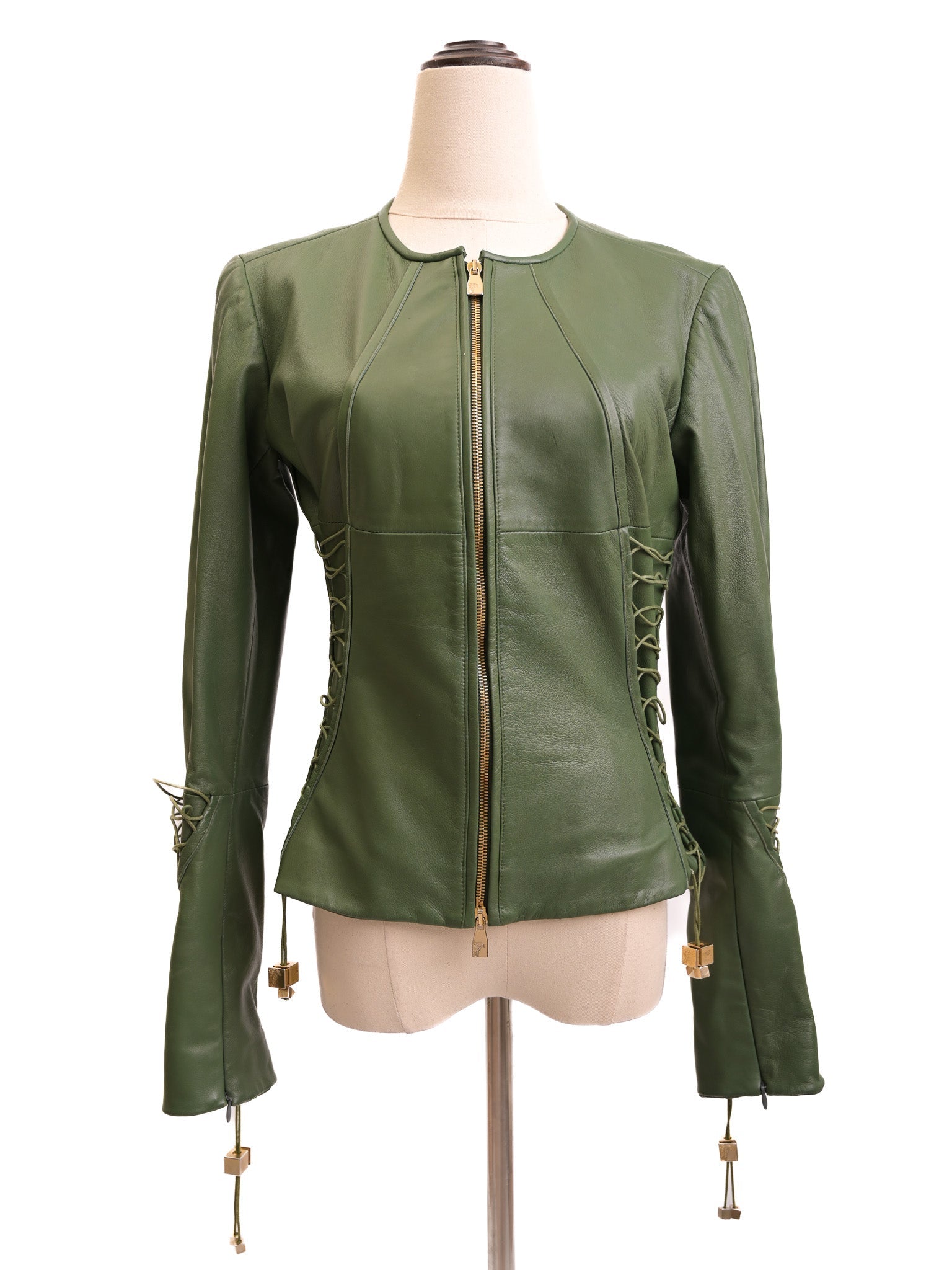 This stunning green leather jacket from Versace is in excellent condition, showcasing no flaws and a fitted silhouette that fits true to size. The jacket features a front zipper, decorative lacing on the sides and sleeves, and detailing with small tied weights that highlight its unique design.