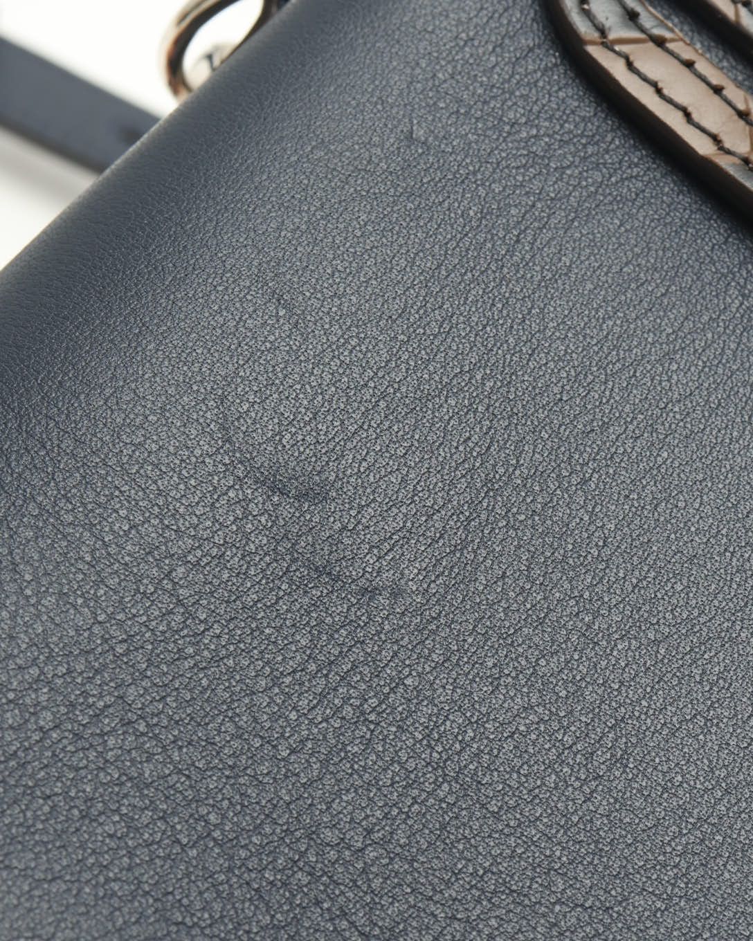 FENDI Mini By The Way Bag¥ Navy blue grained leather¥ Zucca canvas trim with stud detailing¥ Silver-tone hardware¥ Dual top handles¥ Detachable and adjustable shoulder strap¥ Brown fabric lining with a single compartment¥ Top zip closureOverall Preloved Condition: ExcellentExterior Condition: Excellent. Light trace of use.Interior Condition: Excellent. Light trace of use.Hardware: Shiny with light scratches.Delivered with no accessoriesMade in ItalyDimensions:Height 12 cmWidth 21 cmDepth 9 cmHandle drop 4 cmStrap drop 110 cmPlease note that the majority of our items are vintage and therefore have tales to tell unless stated otherwise. Therefore, please look at pictures, descriptions and measurements provided as they give you the best idea of the story this item has to tell.