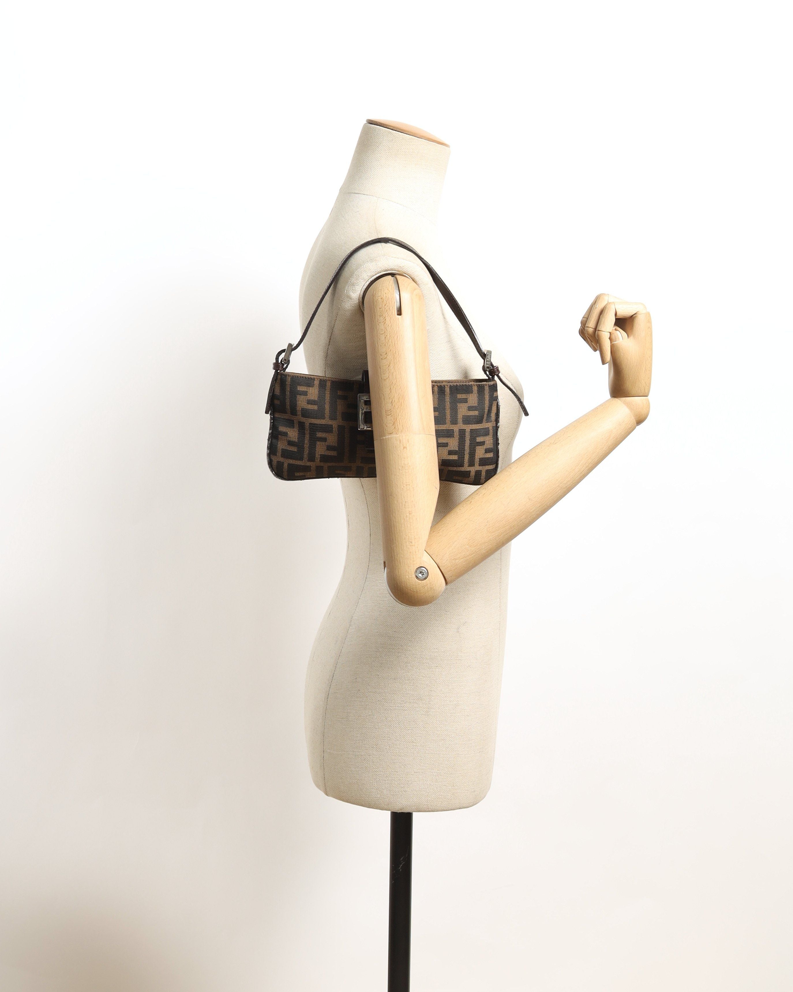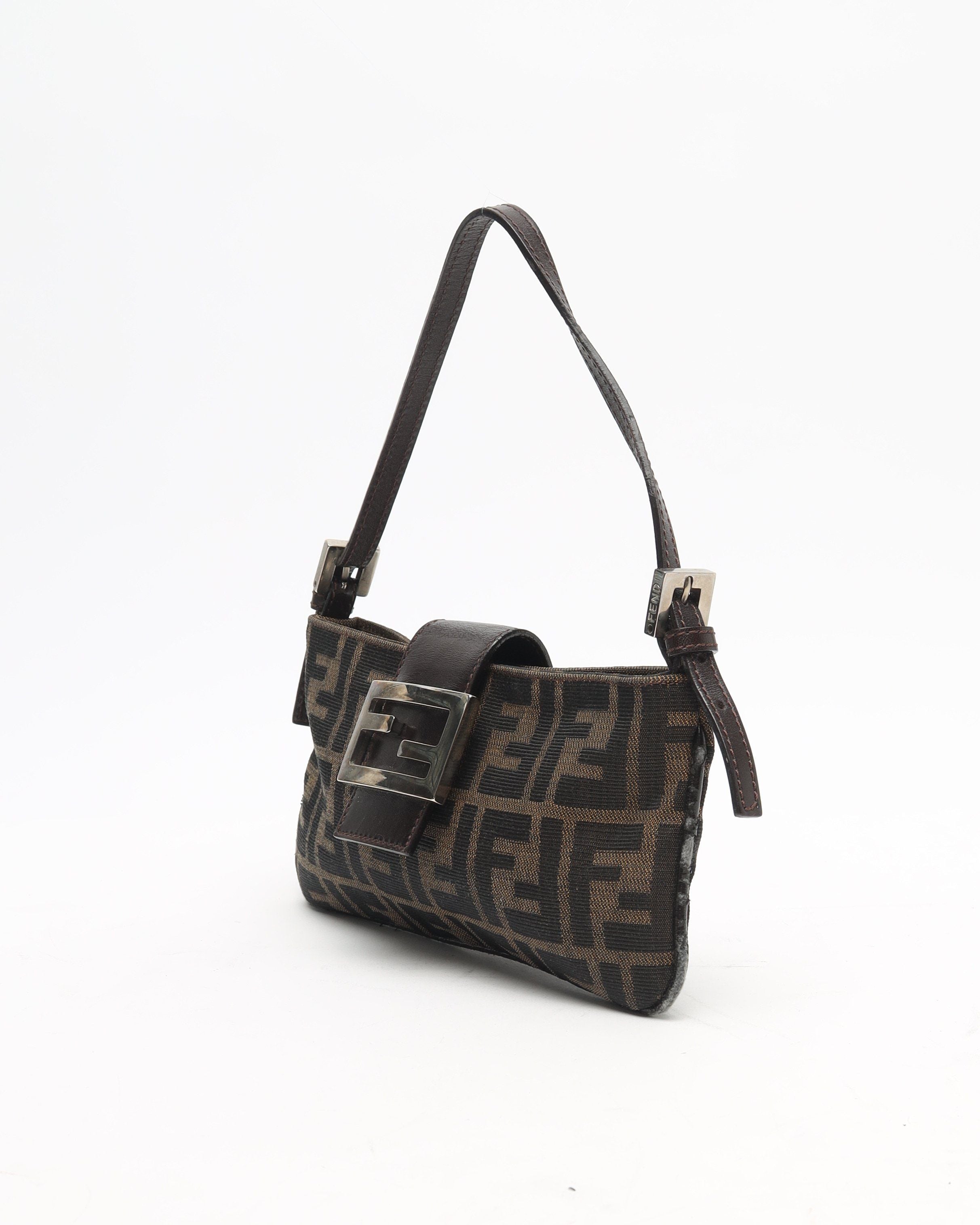 Fendi Zucca Mini Shoulder Bag- Silver-tone hardware- Brown Zucca print- Flat leather shoulder strap- Tonal cloth lining with one pocket- VintageOverall Preloved Condition: Good.Exterior Condition: Good. Torn trim.Interior Condition: Very Good. Light trace of use.Hardware: Shiny with scratches.Delivered with no accessoriesMade in ItalyDimensions:Height 11 cmWidth 22 cmDepth 1 cmHandle drop 13 cmPlease note that the majority of our items are vintage and therefore have tales to tell unless stated otherwise. Therefore, please look at pictures, descriptions and measurements provided as they give you the best idea of the story this item has to tell.* Please note that when you buy a vintage product, the dimensions may vary slightly from a new one depending on previous care and storage.