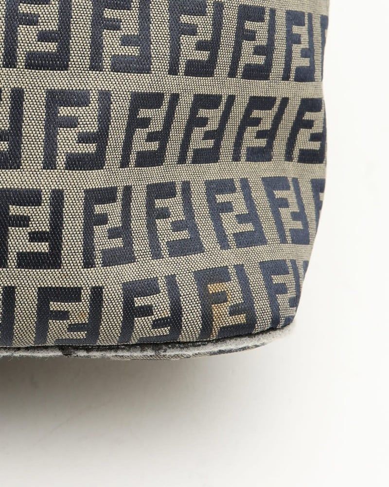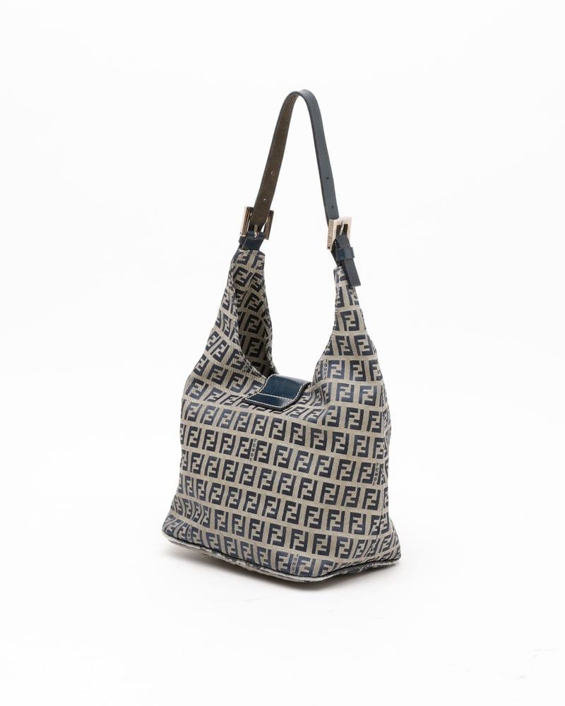 Fendi Zucca Shoulder Bag- Silver-tone hardware- Grey and blue canvas with zucchino print- Adjustable shoulder strap- Tonal lining with one pocket- VintageOverall Preloved Condition: Good.Exterior Condition: Very Good. Heavily scuffed trim along base. Marks and scratches at closure and strap.Interior Condition: Good. Hole in lining in pocket.Hardware: Shiny with marks and scratches.Delivered with no accessoriesMade in ItalyDimensions:Height 18 cmWidth 19 cmDepth 13 cmShoulder strap drop 24 cmPlease note that the majority of our items are vintage and therefore have tales to tell unless stated otherwise. Therefore, please look at pictures, descriptions and measurements provided as they give you the best idea of the story this item has to tell.* Please note that when you buy a vintage product, the dimensions may vary slightly from a new one depending on previous care and storage.