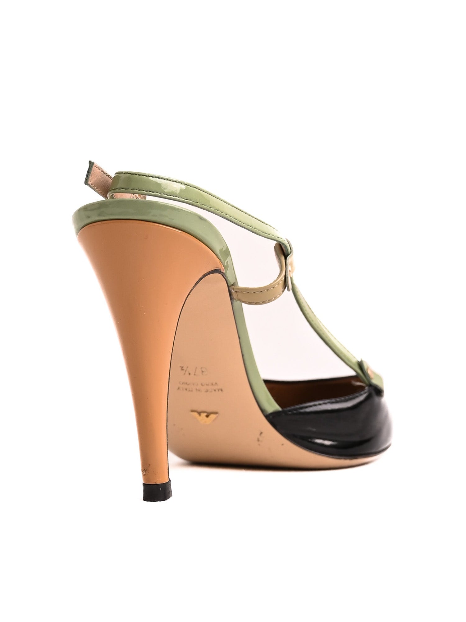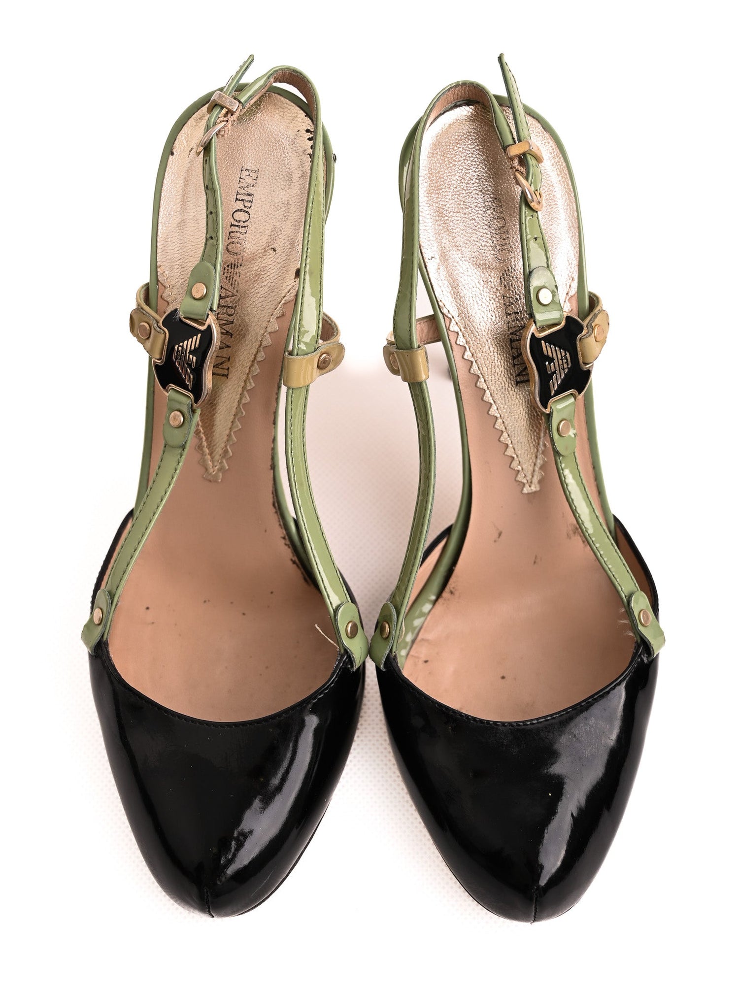 These striking high-heeled shoes from the renowned brand Emporio Armani feature a sophisticated color combination of black, green, and tan, perfect for making a fashion statement. With a pointed toe and sleek heel, these shoes are designed for elegance and style. The decorative straps with buckles add a unique touch, further enhancing their appeal.