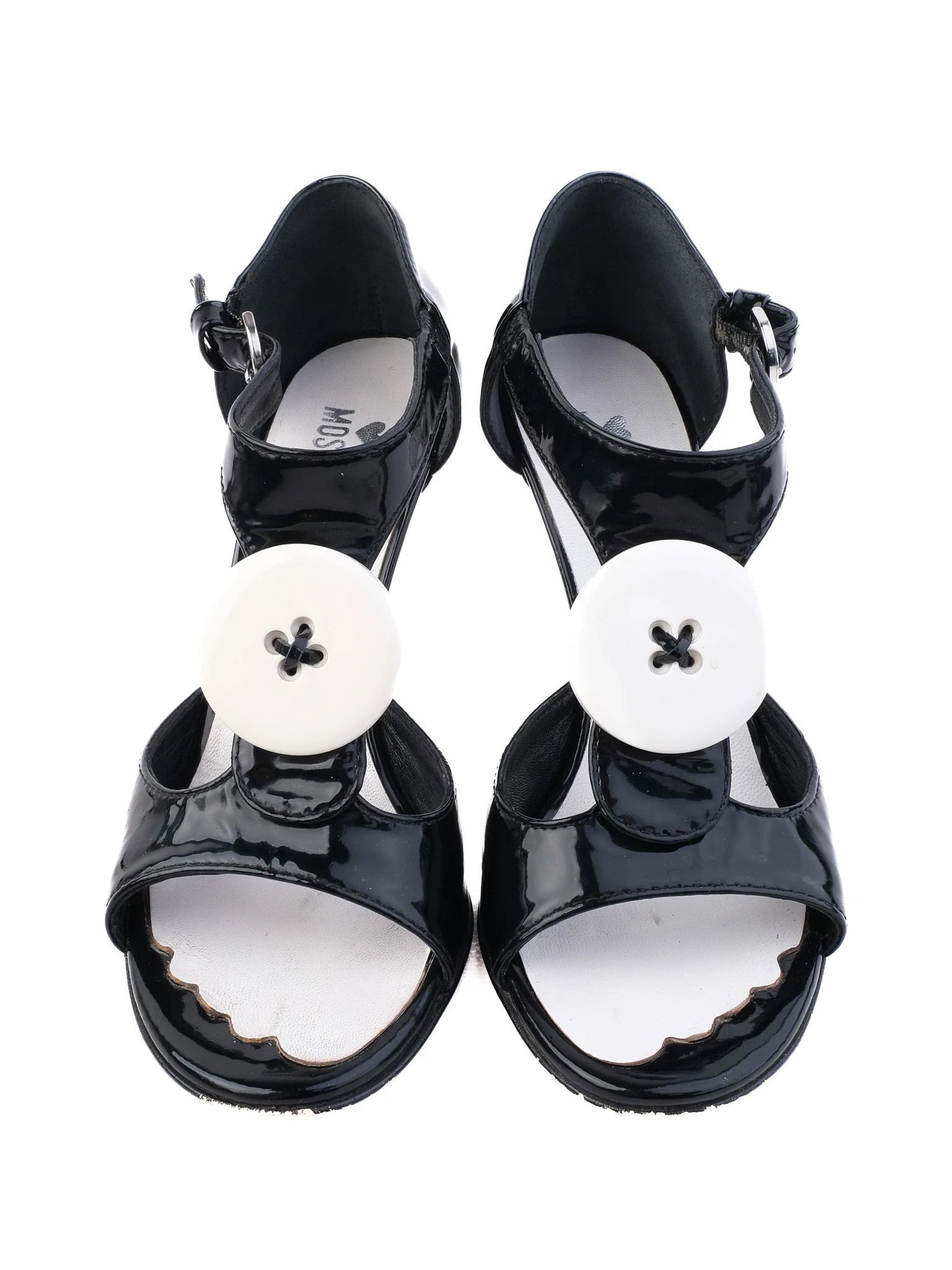 Good Love Moschino Black Leather High-Heeled Sandals Size 36. These stunning high-heeled sandals are crafted by Love Moschino and are available in a sleek black patent leather finish. The shoes feature an open-toe design, perfect for showcasing your pedicure, and a stylish adjustable ankle strap for added comfort and support. A distinctive large white decorative button on the front strap adds a unique flair to this chic footwear. Condition is good, with minor signs of wear. The size is 36, suitable for women seeking fashionable and comfortable options. These sandals are ideal for semi-casual outings or evening events, making them a versatile addition to your wardrobe. Care instructions: Spot clean with a leather cleaner to maintain their pristine appearance. Enjoy the refinement and bold design that Love Moschino is known for, while making a statement in these high-heeled sandals. Please message me to confirm shipping timeframe. My full-time job involves traveling often, and shipping out may take longer than usual. Thanks for your interest.