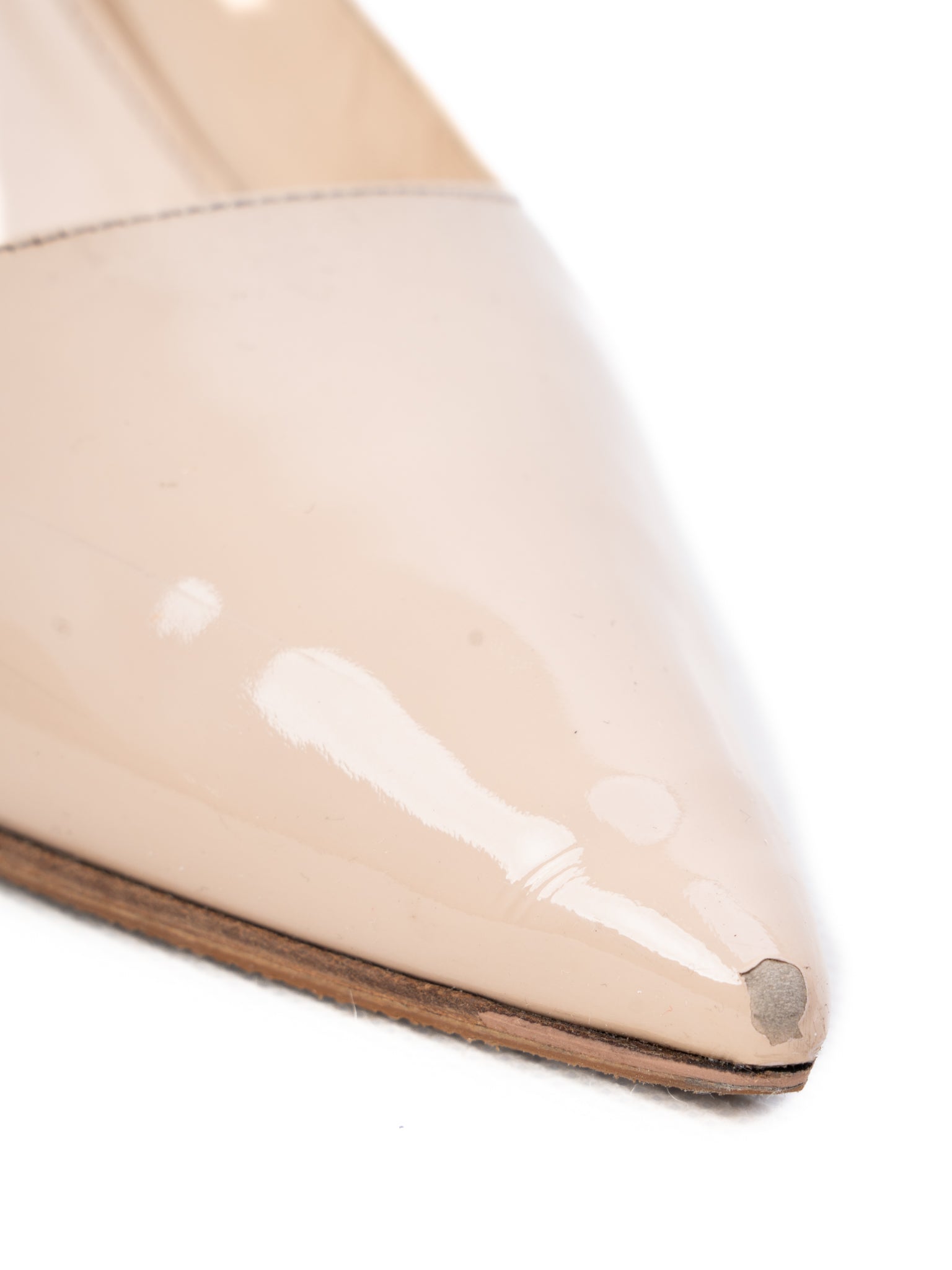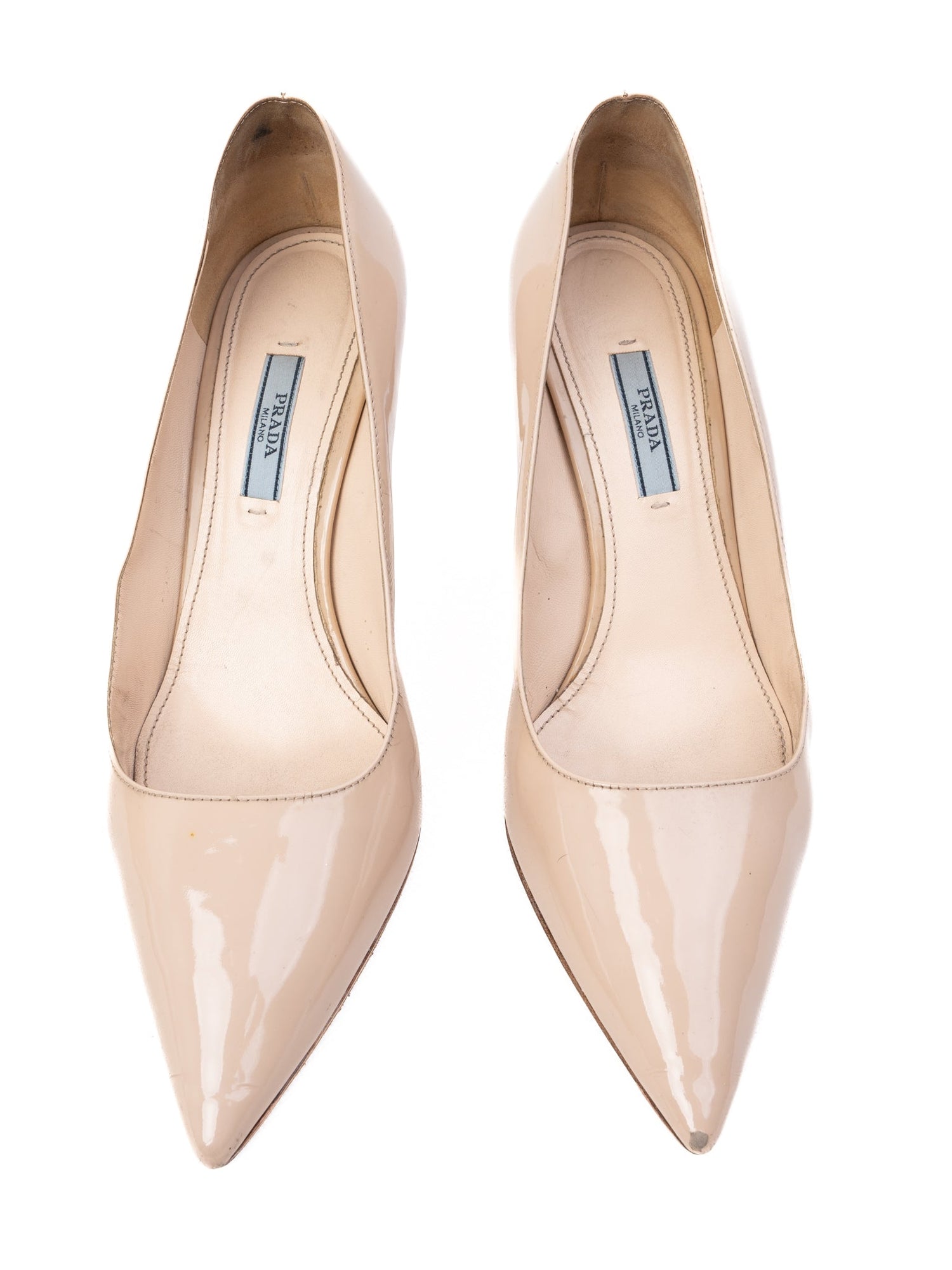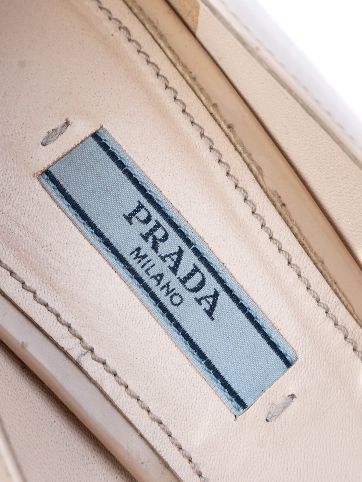 These elegant high-heeled shoes from Prada are crafted from genuine leather, ensuring both style and quality. The classic pumps feature a chic pointed toe design and a shiny white finish, making them a versatile addition to any wardrobe. The condition is good, with minor signs of wear that do not detract from their elegance.