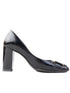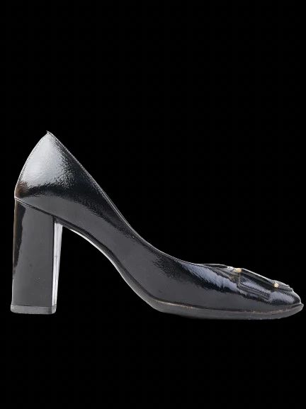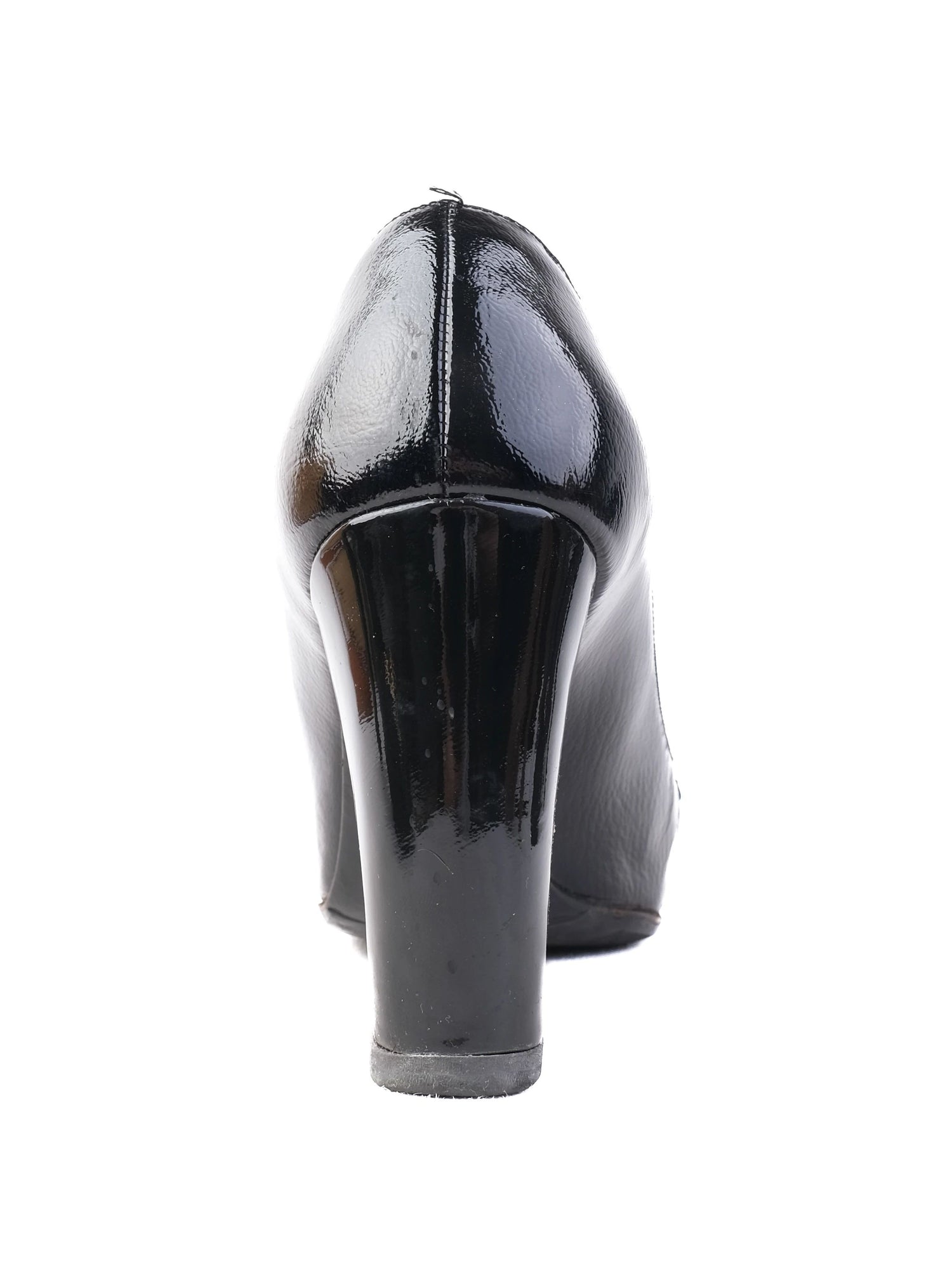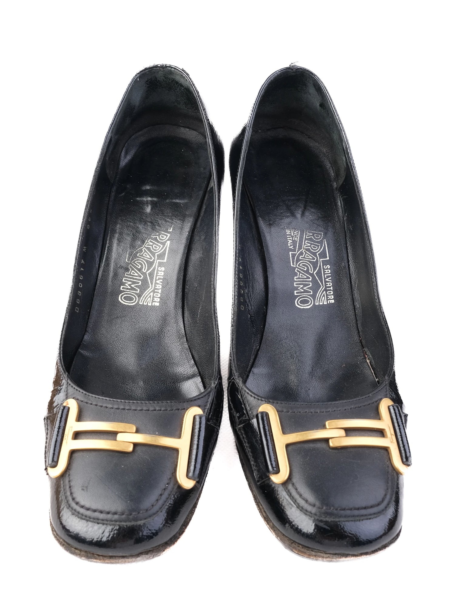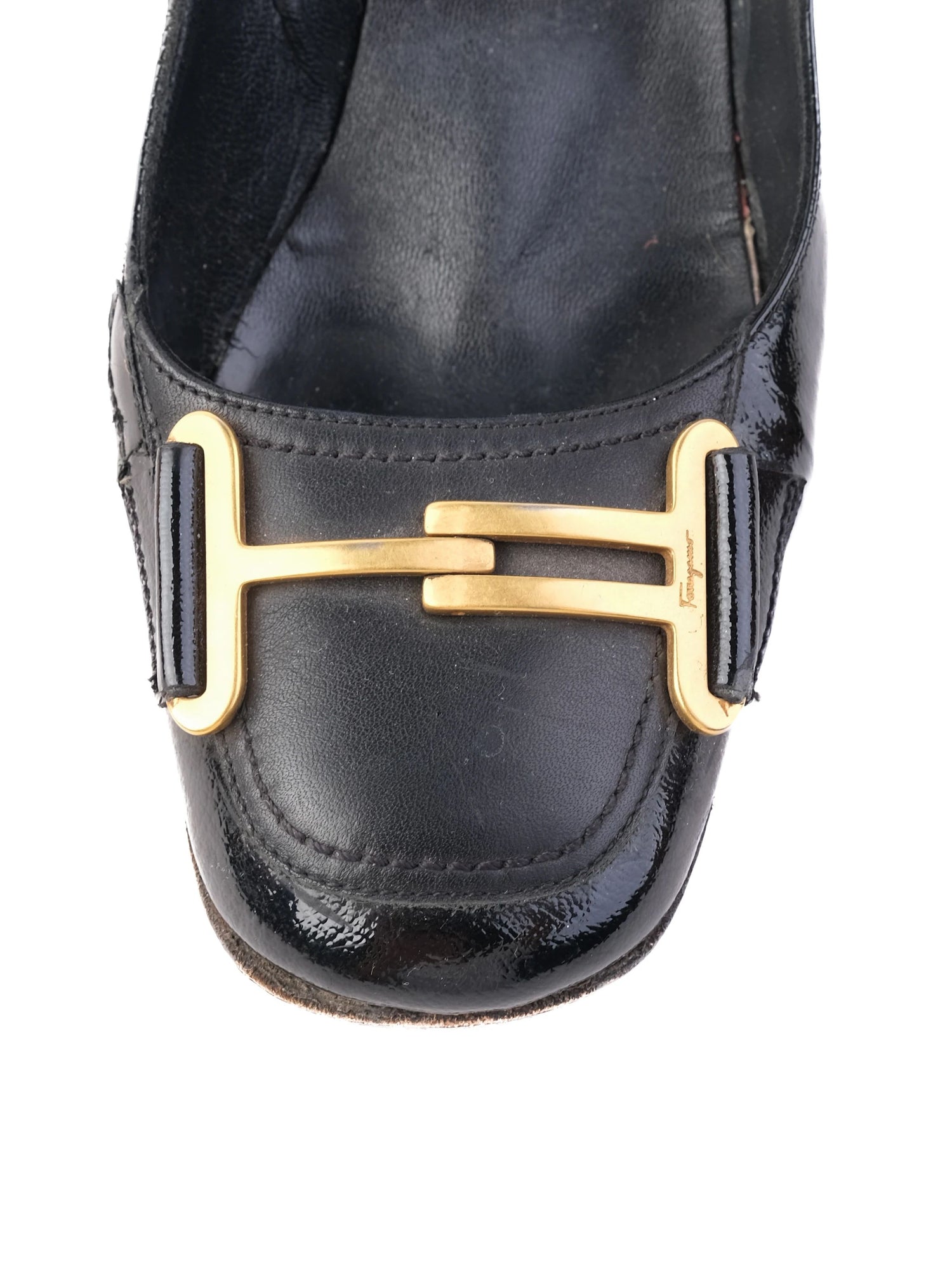 Good Salvatore Ferragamo Black Patent Leather Dress Shoes Size 38. These elegant shoes showcase a sleek black patent leather construction, ideal for formal occasions. The shoes feature a decorative gold element on the toe, adding a touch of sophistication. The chunky heel provides both style and stability, making them perfect for extended wear. In good condition, these dress shoes have been well-maintained and show minor signs of wear. They are designed in a classic style suitable for various formal or dressy events. Care: Wipe clean with a soft, damp cloth to maintain their shine. Heel height is approximately 3 inches, providing an elevated look without sacrificing comfort. These versatile shoes can complement any wardrobe, perfect for the office, cocktail events, or special occasions. Smoke-free and pet-free home. Please message me to confirm shipping timeframe. My full-time job involves traveling often, and shipping out may take longer than usual. Thanks for your interest.