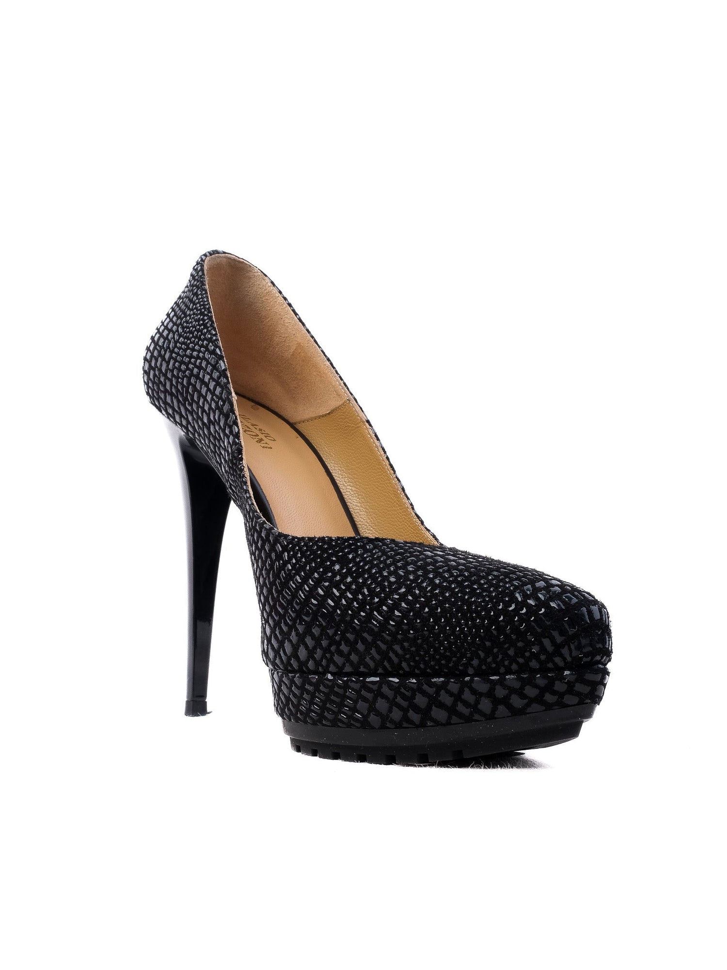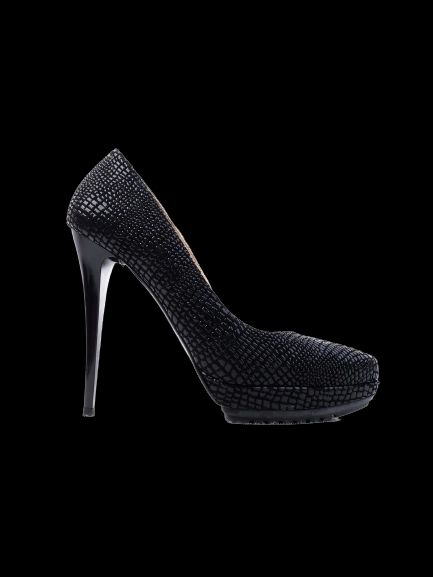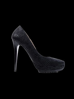 These stylish and elegant high-heeled shoes from Renzoni are in brand new condition, showcasing a sophisticated design that is perfect for any formal occasion. The shoes feature a luxurious black leather upper with a textured pattern, ensuring they stand out while providing comfort and support. The very high, narrow heel and stylish platform create a striking silhouette that enhances the overall aesthetic.
