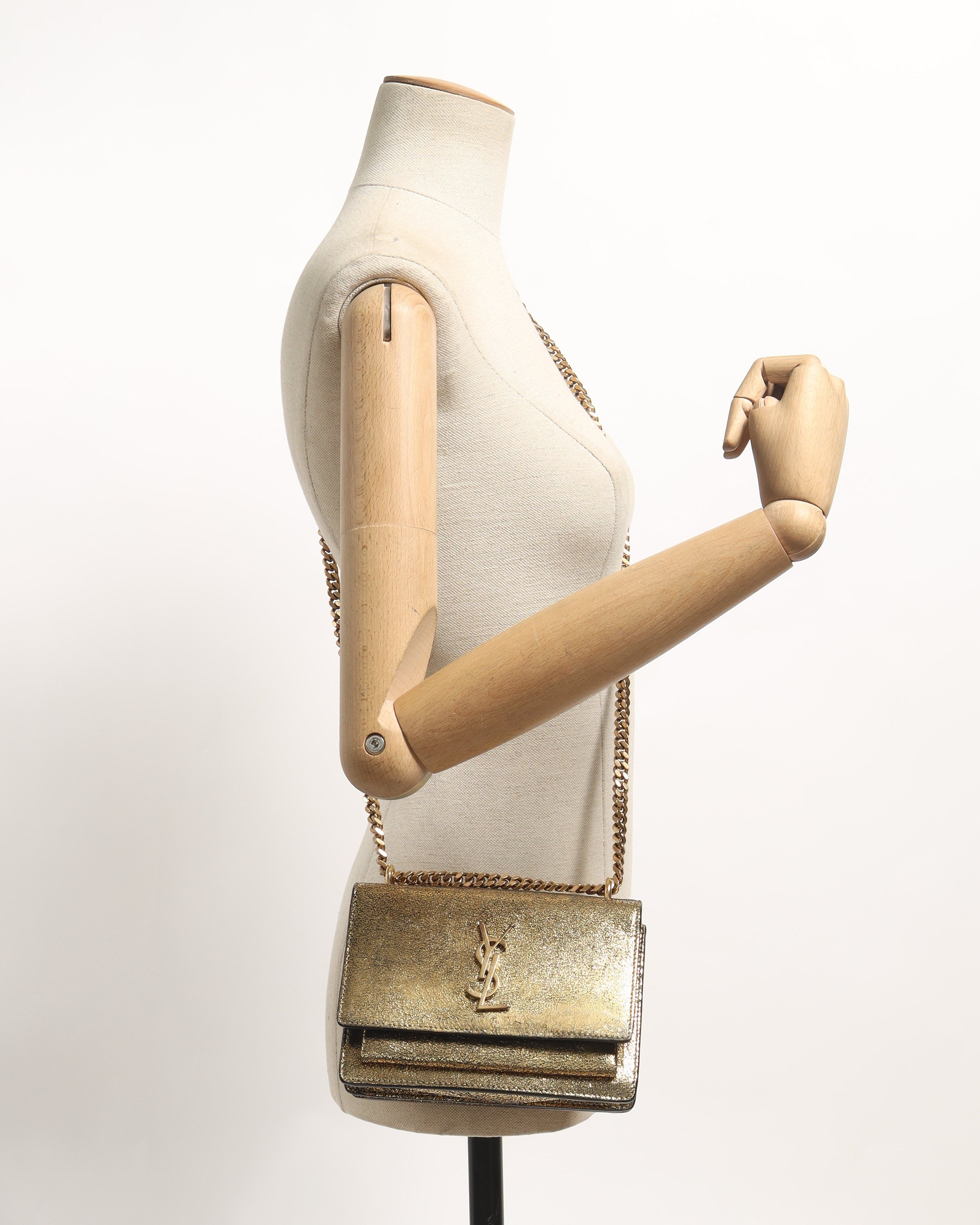 SAINT LAURENT Small Sunset Bag- Gold-tone hardware- Gold-tone leather- Chainlink and leather shoulder strap- Black lining with four pockets- VintageOverall Preloved Condition: Very Good.Exterior Condition: Very Good. Light wear and scuffing at leather.Interior Condition: Very Good. Light marks and faded interior lining.Hardware: Shiny with scratches.Delivered with no accessoriesMade in ItalyDimensions:Height 14 cmWidth 19 cmDepth 4 cmShoulder strap drop 50 cmPlease note that the majority of our items are vintage and therefore have tales to tell unless stated otherwise. Therefore, please look at pictures, descriptions and measurements provided as they give you the best idea of the story this item has to tell.* Please note that when you buy a vintage product, the dimensions may vary slightly from a new one depending on previous care and storage.