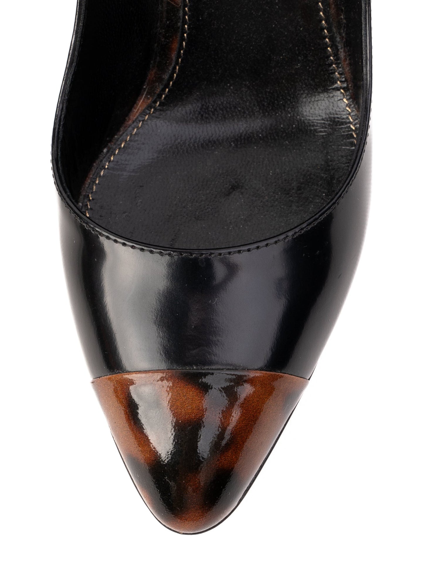 This exquisite pair of Sergio Rossi high-heeled shoes combines elegance and sophistication, featuring a glossy black leather finish that is sure to make a statement. The stylish pointed toe is adorned with a unique tortoiseshell-style accent, while the stiletto heel showcases a complementary tortoiseshell pattern that adds a chic touch to the overall design.