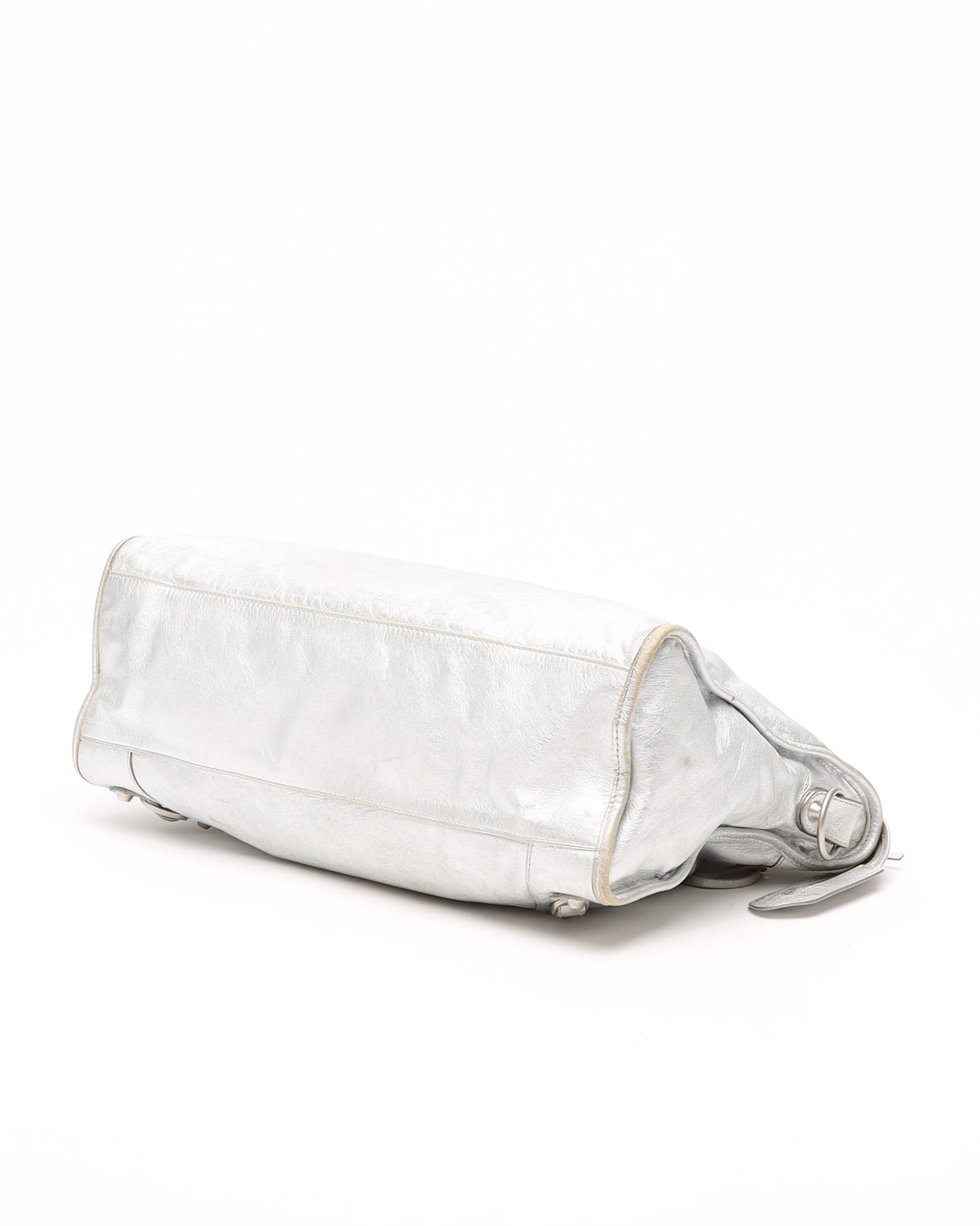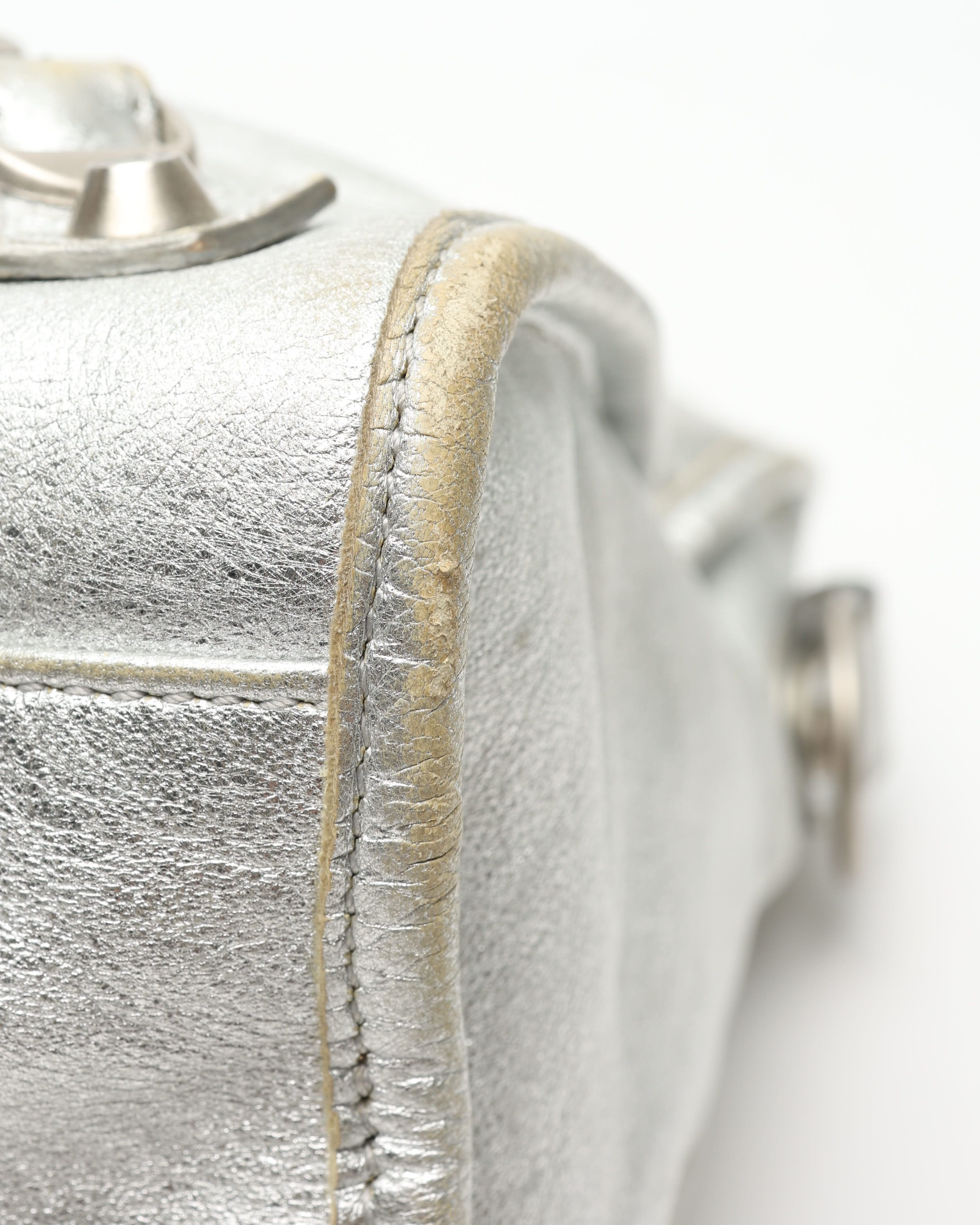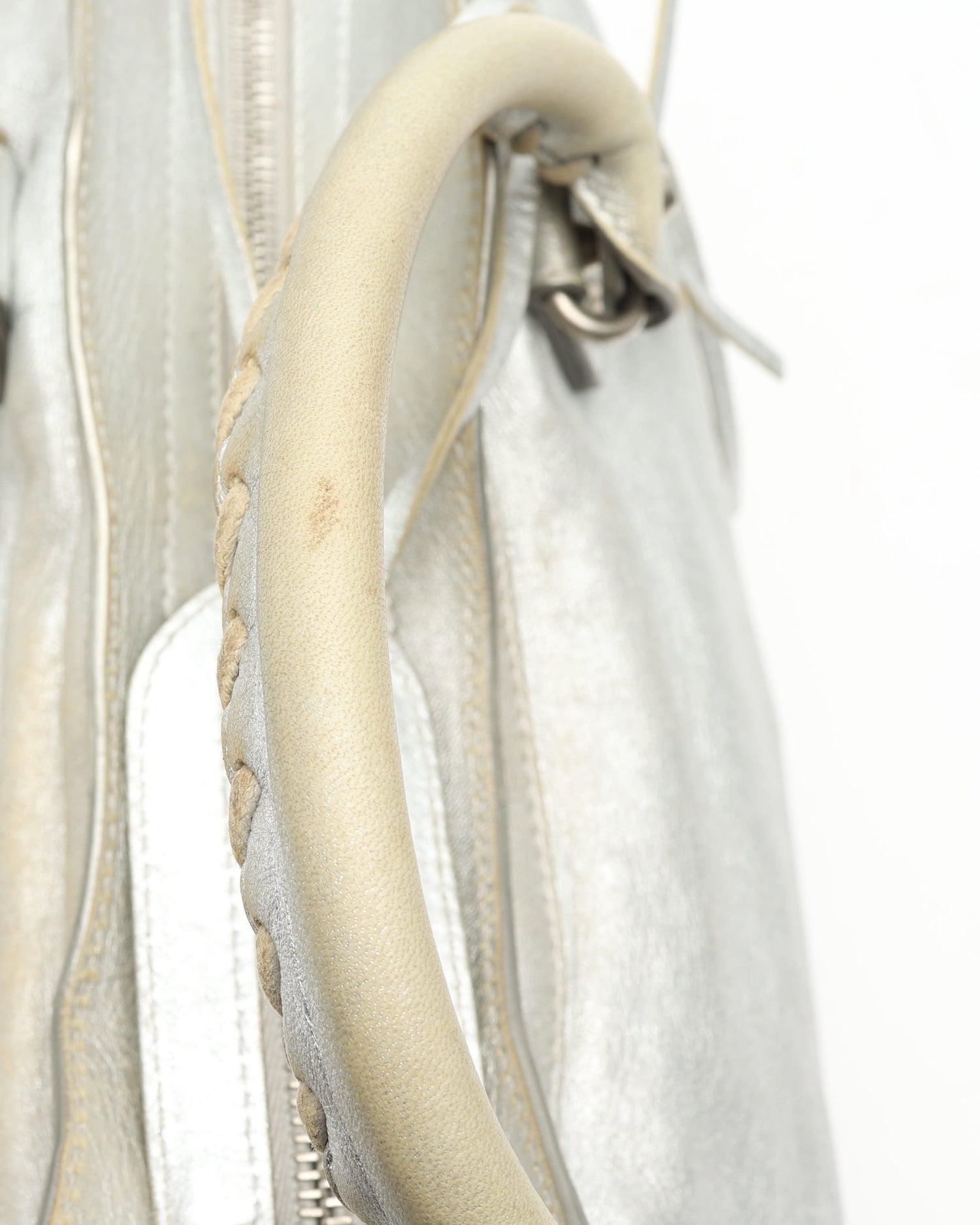 Balenciaga Classic Metallic Motocross City Bag- Silver-tone hardware- Silver metallic leather- Dual handles and detachable shoulder strap- Black lining with three pockets- VintageOverall Preloved Condition: Good.Exterior Condition: Good. Discoloration at top and along edges. Discolored handles. Scuffed corners.Interior Condition: Very Good. Discolored lining with marks.Hardware: Shiny with scratches.Delivered with detachable shoulder strap, bookletMade in ItalyDimensions:Height 23 cmWidth 38 cmDepth 13 cmHandle drop 10 cmShoulder strap drop 24 cmPlease note that the majority of our items are vintage and therefore have tales to tell unless stated otherwise. Therefore, please look at pictures, descriptions and measurements provided as they give you the best idea of the story this item has to tell.* Please note that when you buy a vintage product, the dimensions may vary slightly from a new one depending on previous care and storage.