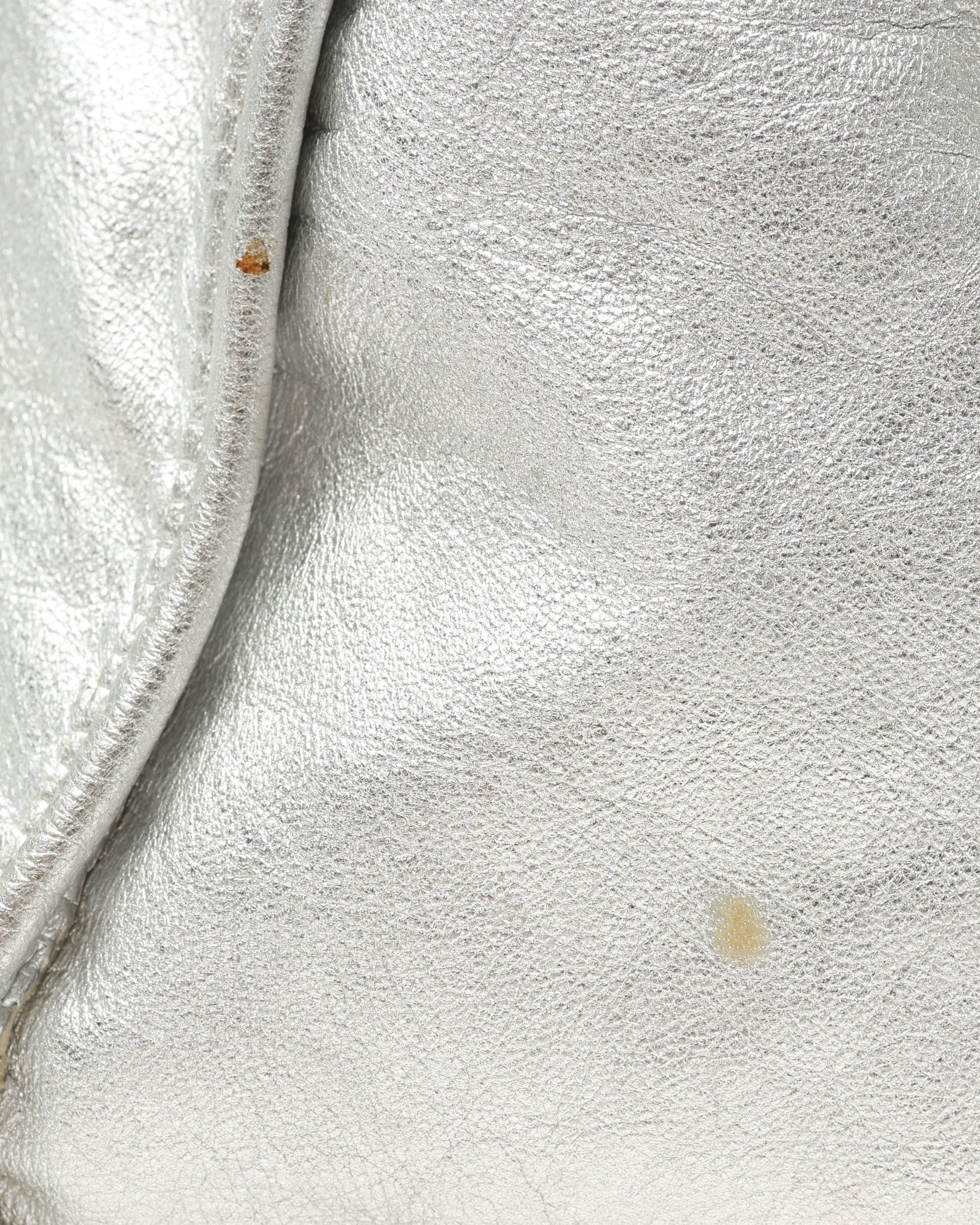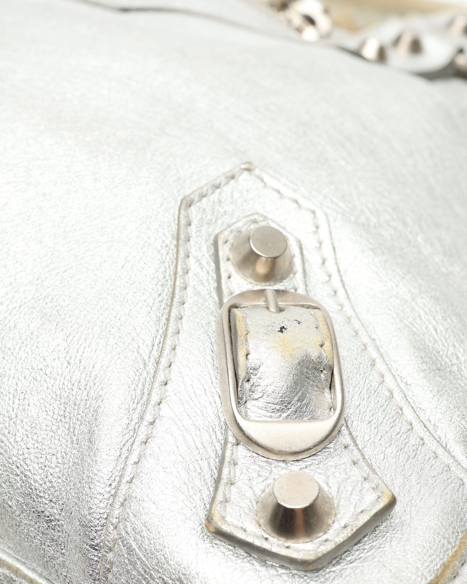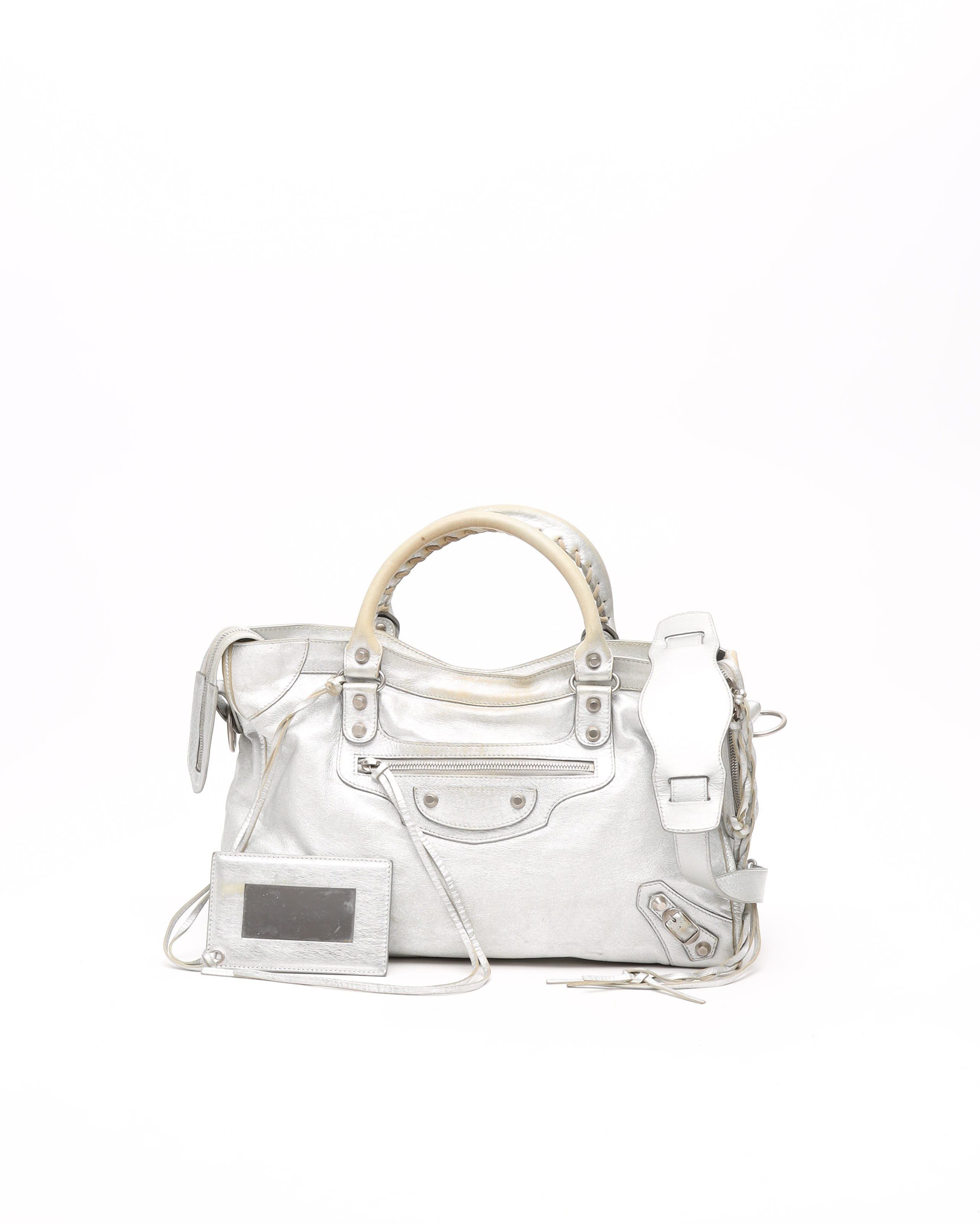 Balenciaga Classic Metallic Motocross City Bag- Silver-tone hardware- Silver metallic leather- Dual handles and detachable shoulder strap- Black lining with three pockets- VintageOverall Preloved Condition: Good.Exterior Condition: Good. Discoloration at top and along edges. Discolored handles. Scuffed corners.Interior Condition: Very Good. Discolored lining with marks.Hardware: Shiny with scratches.Delivered with detachable shoulder strap, bookletMade in ItalyDimensions:Height 23 cmWidth 38 cmDepth 13 cmHandle drop 10 cmShoulder strap drop 24 cmPlease note that the majority of our items are vintage and therefore have tales to tell unless stated otherwise. Therefore, please look at pictures, descriptions and measurements provided as they give you the best idea of the story this item has to tell.* Please note that when you buy a vintage product, the dimensions may vary slightly from a new one depending on previous care and storage.