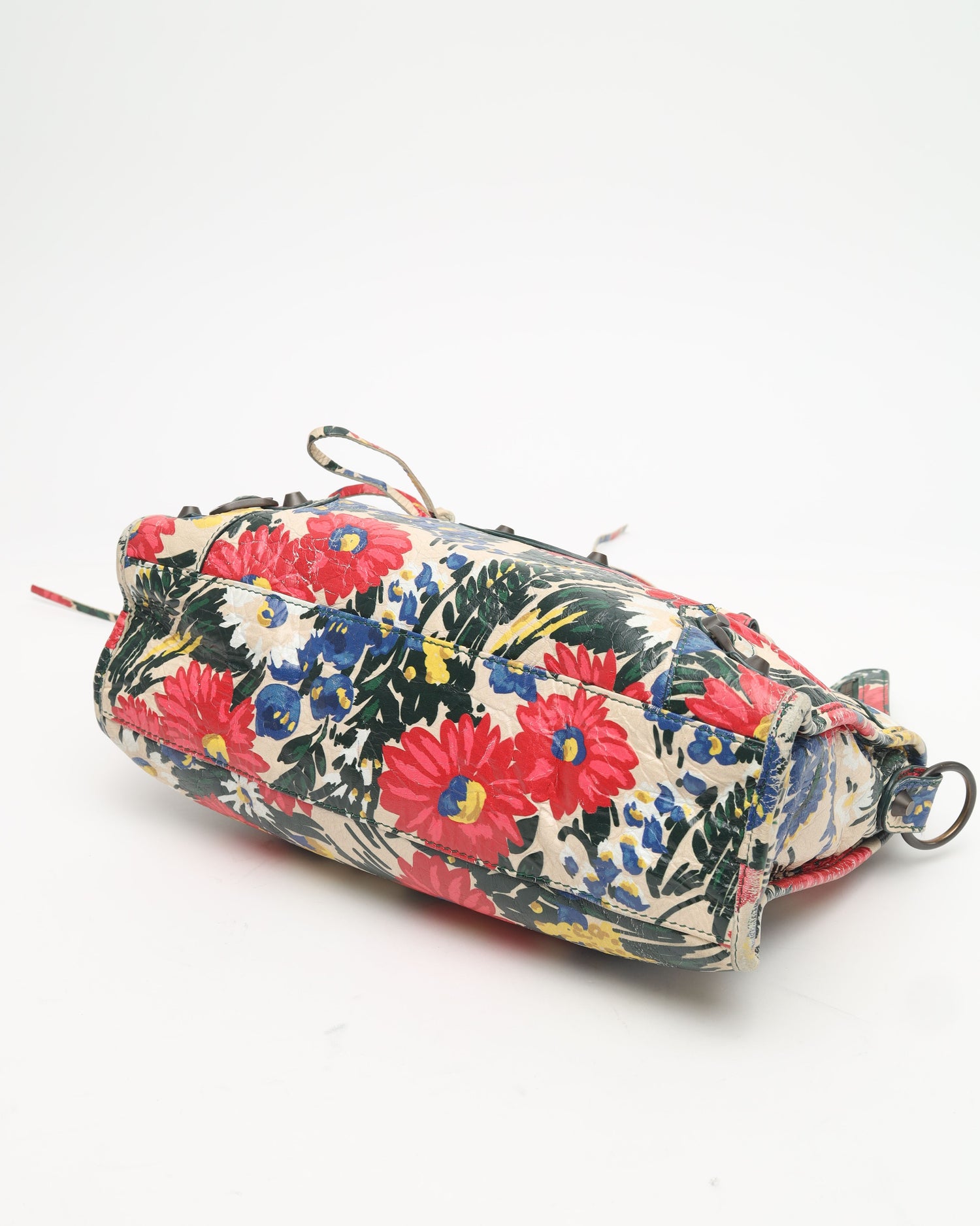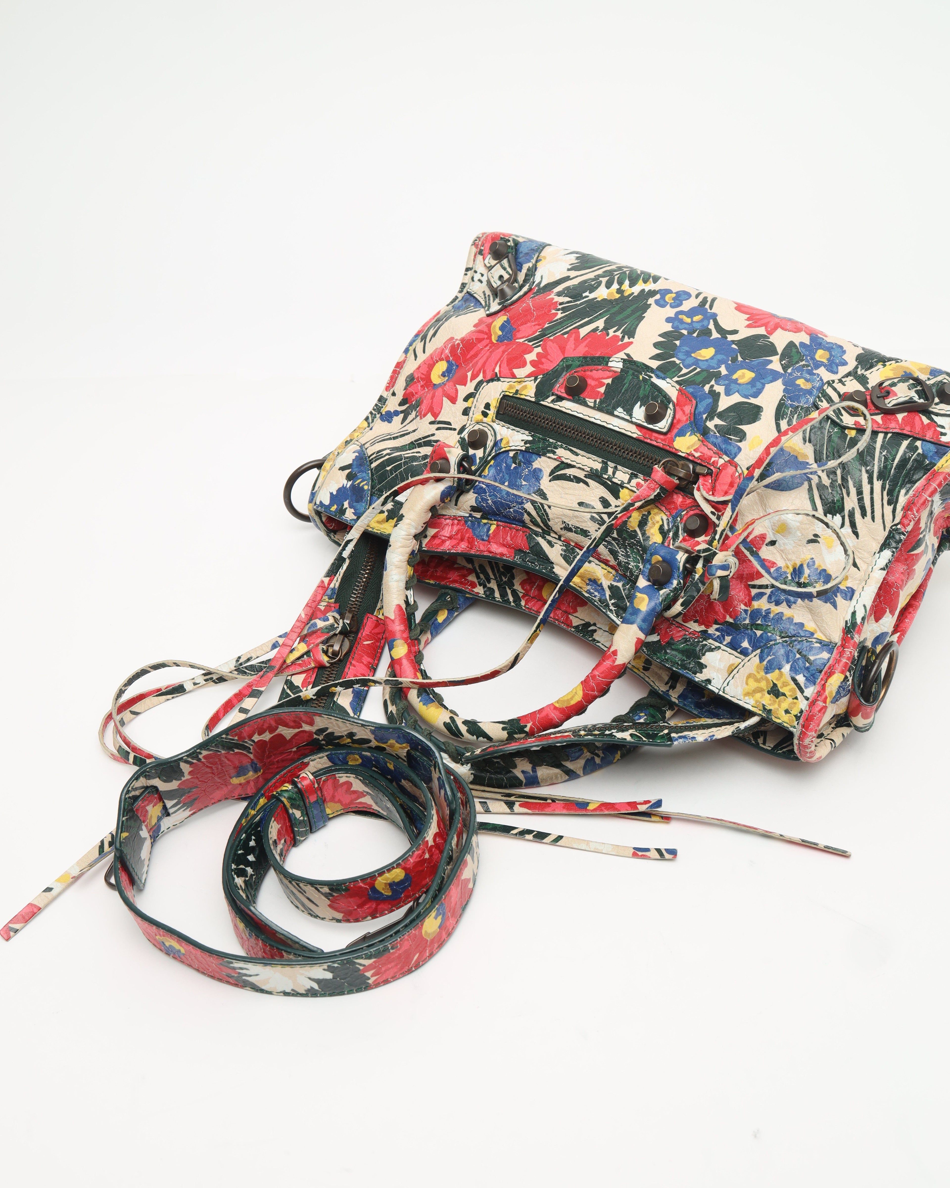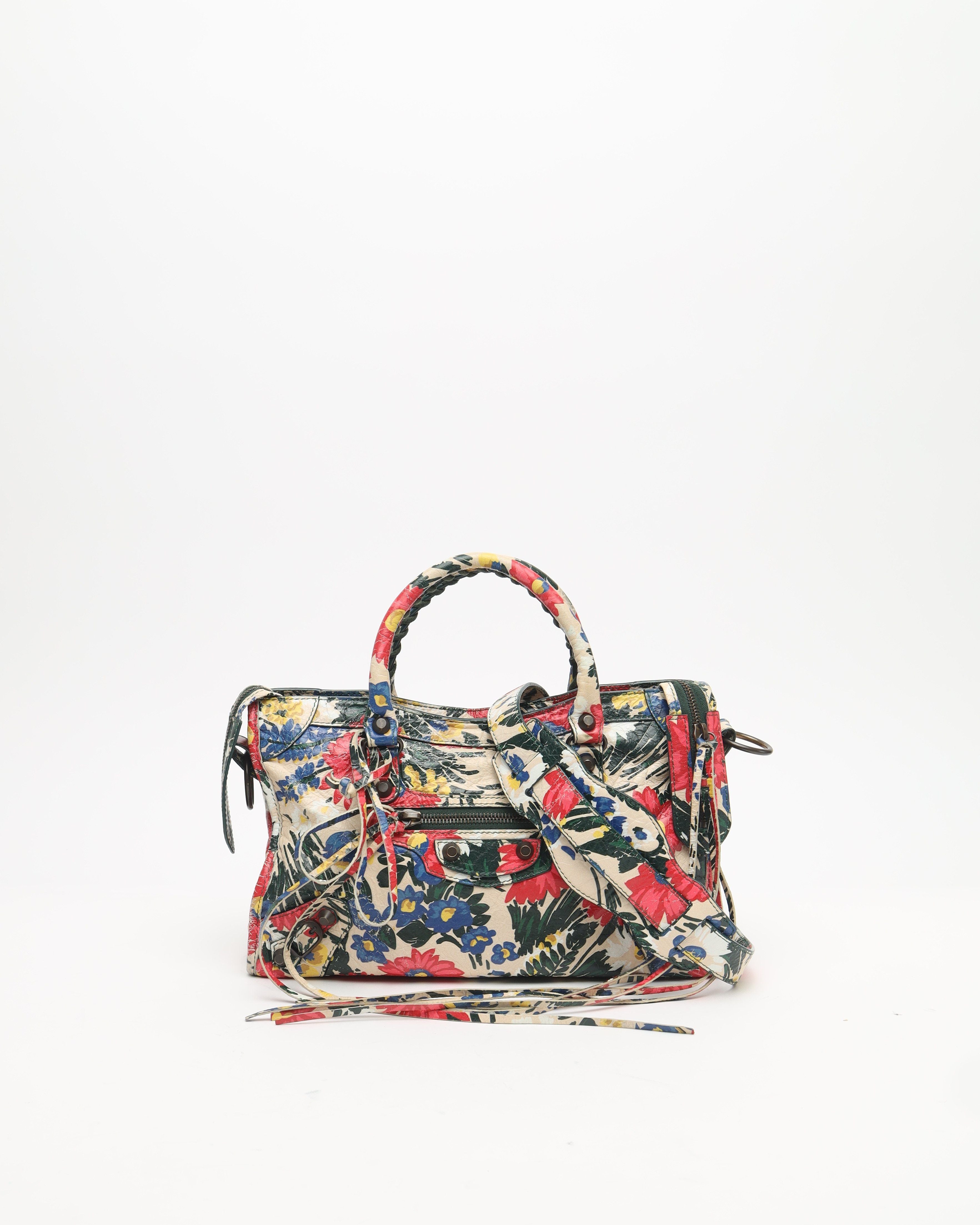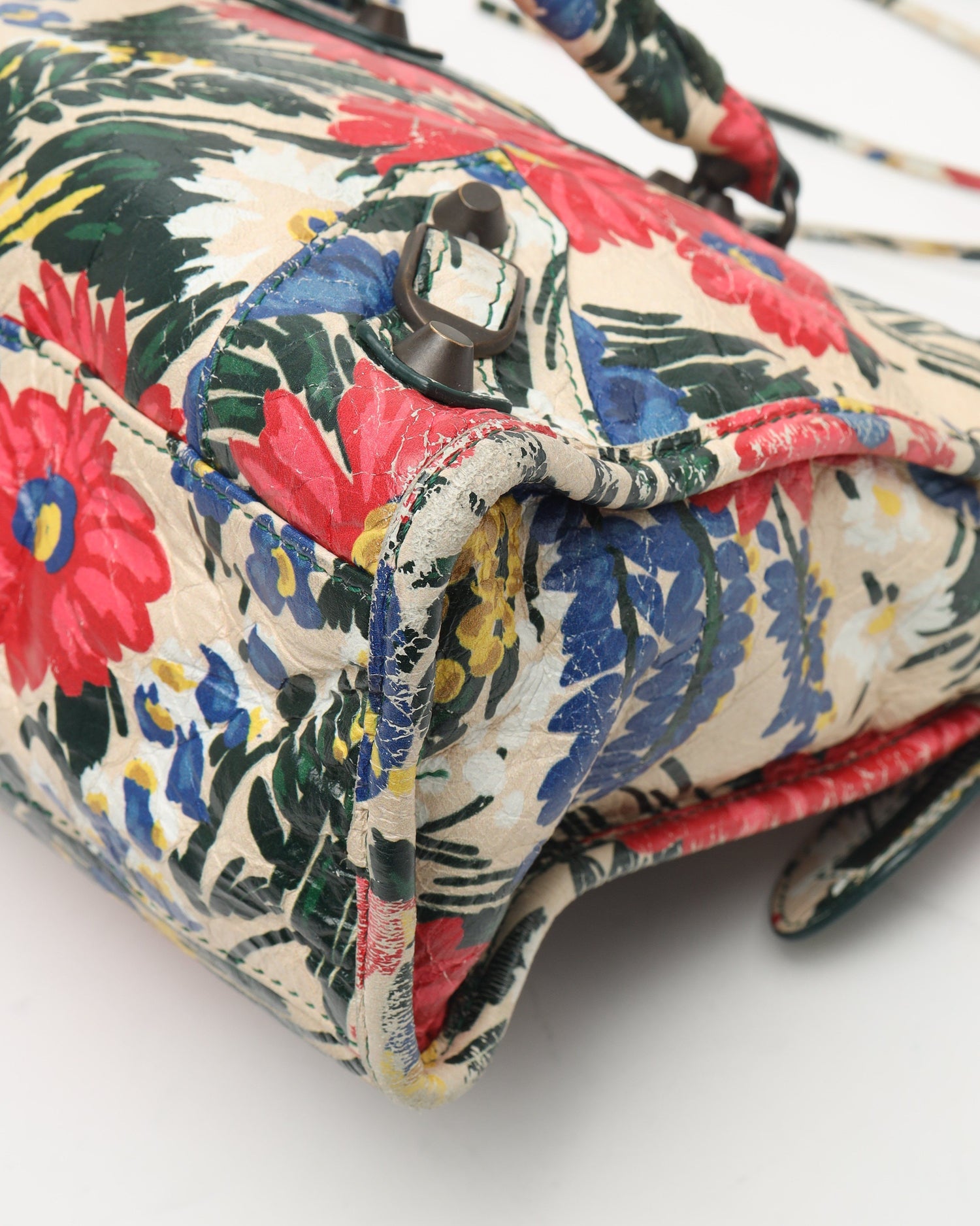 BALENCIAGA Motocross Classic Small City Bag- Gunmetal-tone hardware- White leather with flower print- Dual handles and detachable flat shoulder strap- Black lining with three pockets- VintageOverall Preloved Condition: Very Good.Exterior Condition: Very Good. Light scuffing and wear at bottom corners.Interior Condition: Very Good. Light vintage smell.Hardware: Shiny with scratches.Delivered with Detachable shoulder strapMade in ItalyDimensions:Height 18 cmWidth 17 cmDepth 9 cmHandle drop 12 cmShoulder strap drop 55 cmPlease note that the majority of our items are vintage and therefore have tales to tell unless stated otherwise. Therefore, please look at pictures, descriptions and measurements provided as they give you the best idea of the story this item has to tell.* Please note that when you buy a vintage product, the dimensions may vary slightly from a new one depending on previous care and storage.