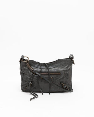 Balenciaga Motocross Hip Crossbody Bag- Gun metal-tone hardware- Grey leather- Flat crossbody strap- Black lining with two pockets- VintageOverall Preloved Condition: Very Good.Exterior Condition: Very Good. Worn leather with scuffing throughout edges.Interior Condition: Very Good. Light discoloration at lining.Hardware: Matte with scratches.Delivered with no accessoriesMade in ItalyDimensions:Height 15 cmWidth 23 cmDepth 4 cmShoulder strap drop 58 cmPlease note that the majority of our items are vintage and therefore have tales to tell unless stated otherwise. Therefore, please look at pictures, descriptions and measurements provided as they give you the best idea of the story this item has to tell.* Please note that when you buy a vintage product, the dimensions may vary slightly from a new one depending on previous care and storage.