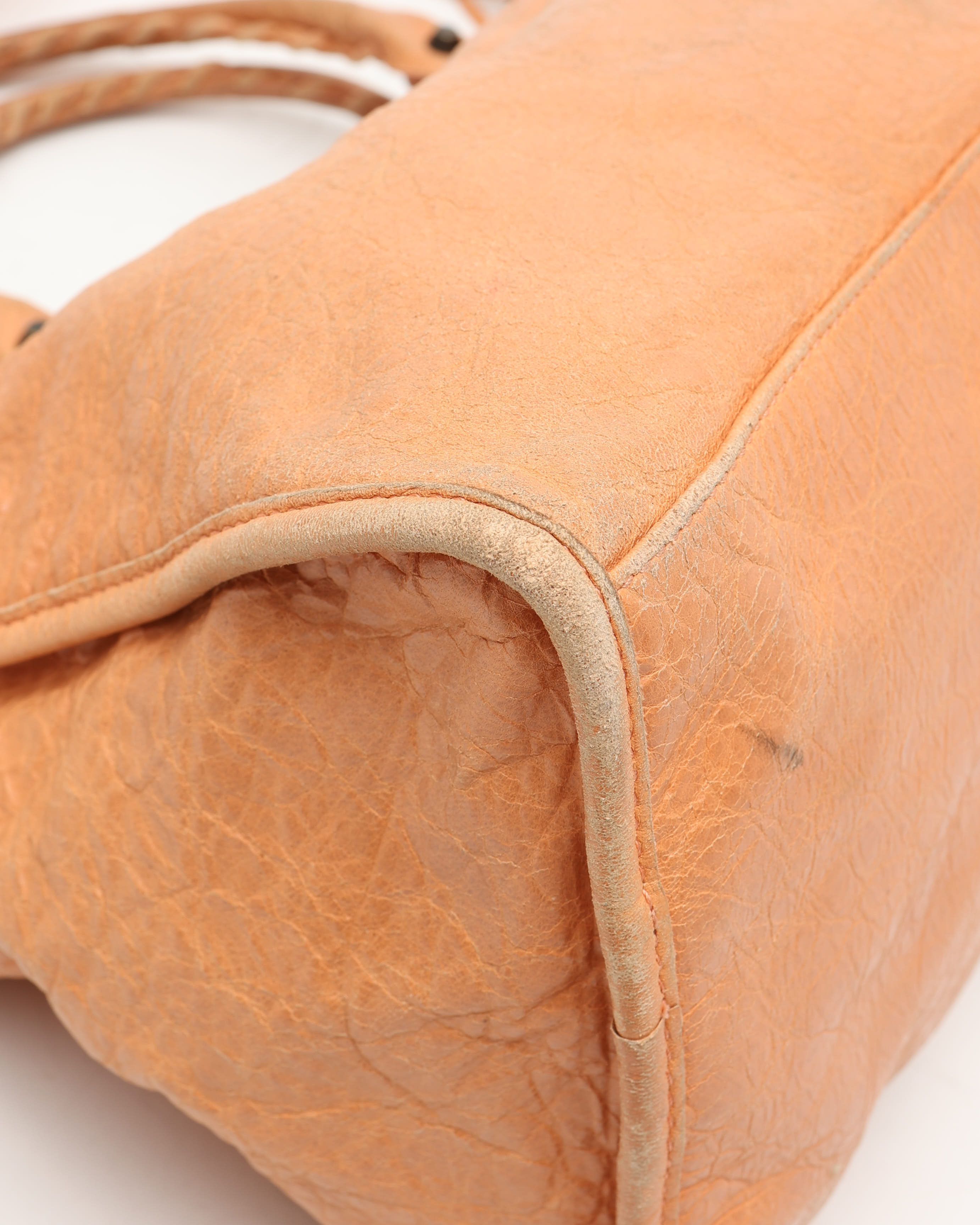 Balenciaga Part Time Bag- Gunmetal hardware- Apricot colored leather- Dual handles and flat shoulder strap- Black lining with one interior pocketOverall Preloved Condition: Good.Exterior Condition: Good. Marks and scuffed leather throughout. Tear at zipper tabInterior Condition: Very Good. Clean with a light trace of use. Light vintage smell.Hardware: Shiny with scratches.Delivered with mirror and detachable shoulder strapMade in ItalyDimensions:Height 23 cmWidth 43 cmDepth 16 cmHandle drop 16 cmPlease note that the majority of our items are vintage and therefore have tales to tell unless stated otherwise. Therefore, please look at pictures, descriptions and measurements provided as they give you the best idea of the story this item has to tell.* Please note that when you buy a vintage product, the dimensions may vary slightly from a new one depending on previous care and storage.
