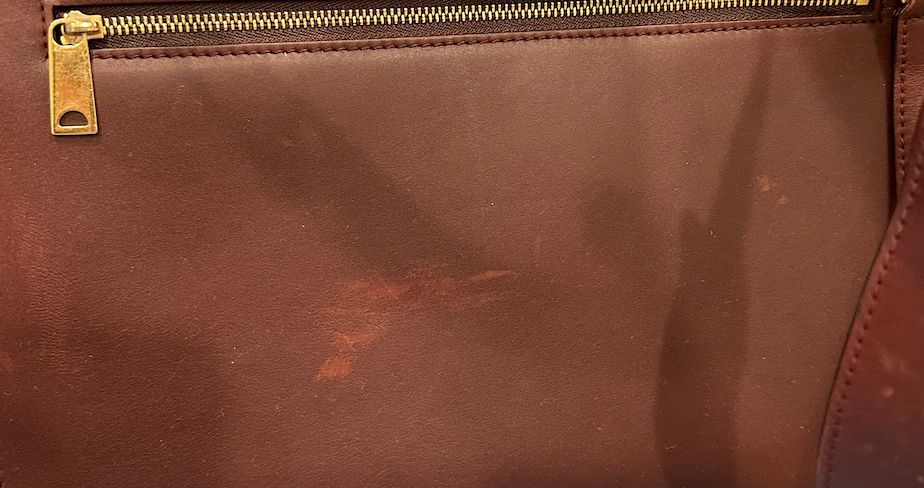Exterior: Medium burn marks and scuffs on leather. Scratches and marks are present on the front and back.