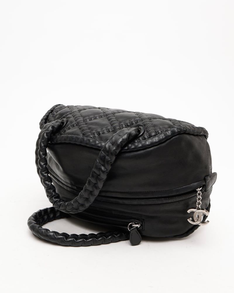 Chanel Bowling Bag- Silver-tone hardware- Black leather- Dual handles leather-covered chain linked handles- Black satin lining with two pockets- VintageOverall Preloved Condition: Very Good.Exterior Condition: Very Good. Lightly faded corners.Interior Condition: Good. Discoloration mark at lining.Hardware: Shiny with scratches.Delivered with Serial number tagMade in ItalySerial number: 11******(2006-2008)Dimensions:Height 13 cmWidth 32 cmDepth 15 cmHandle drop 16 cmPlease note that the majority of our items are vintage and therefore have tales to tell unless stated otherwise. Therefore, please look at pictures, descriptions and measurements provided as they give you the best idea of the story this item has to tell.* Please note that when you buy a vintage product, the dimensions may vary slightly from a new one depending on previous care and storage.