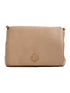 This excellent condition DKNY handbag is crafted from high-quality pebbled leather in a sophisticated gray color. The structured design features a flap closure adorned with a circular DKNY logo, making it a stylish accessory for any occasion. The back of the bag includes a convenient zipper pocket for extra storage, while the bottom of the bag showcases its durability and quality craftsmanship. The handbag comes with a comfortable shoulder strap for easy carrying.