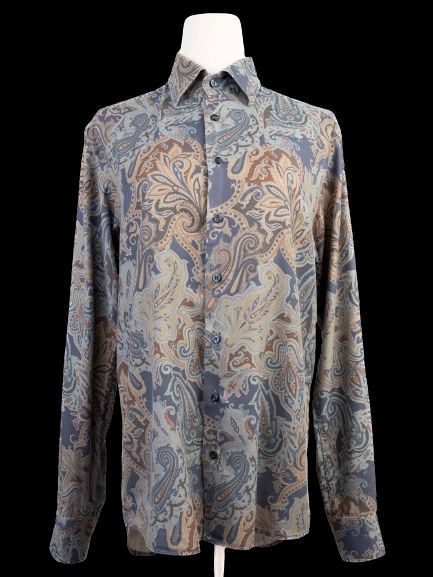 In excellent condition, this shirt shows no signs of wear and fits true to size, making it a great addition to any wardrobe. The intricate paisley design adds a touch of sophistication, making it suitable for both casual and semi-formal occasions.