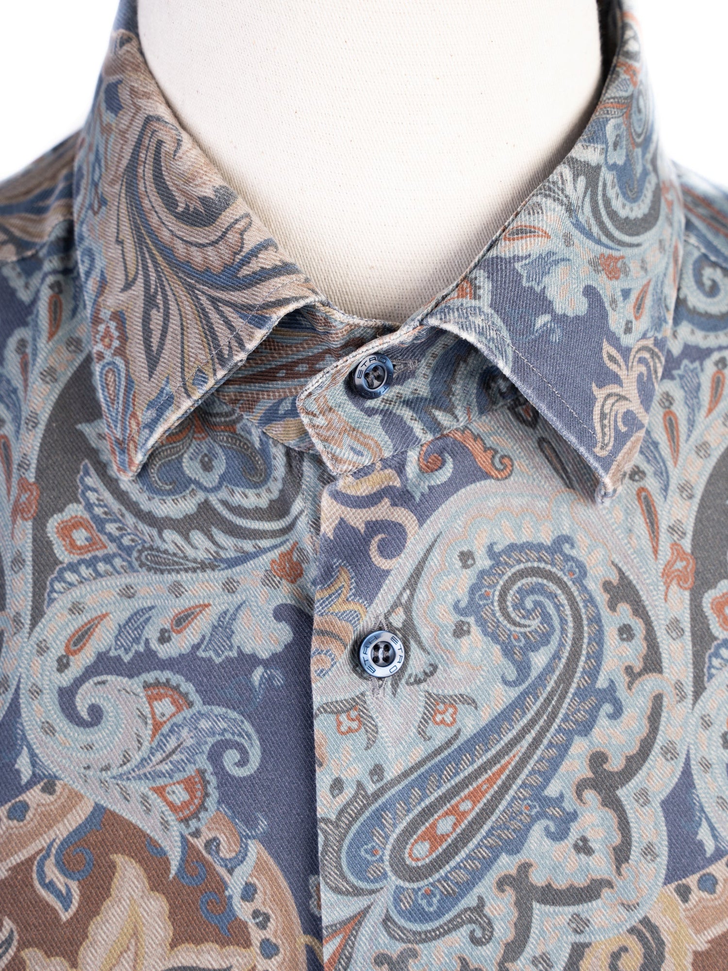 This stylish long-sleeved button-up shirt by Etro features a vibrant paisley pattern in rich shades of blue and brown. Crafted from high-quality natural cotton, this shirt is perfect for men who appreciate both comfort and elegance.