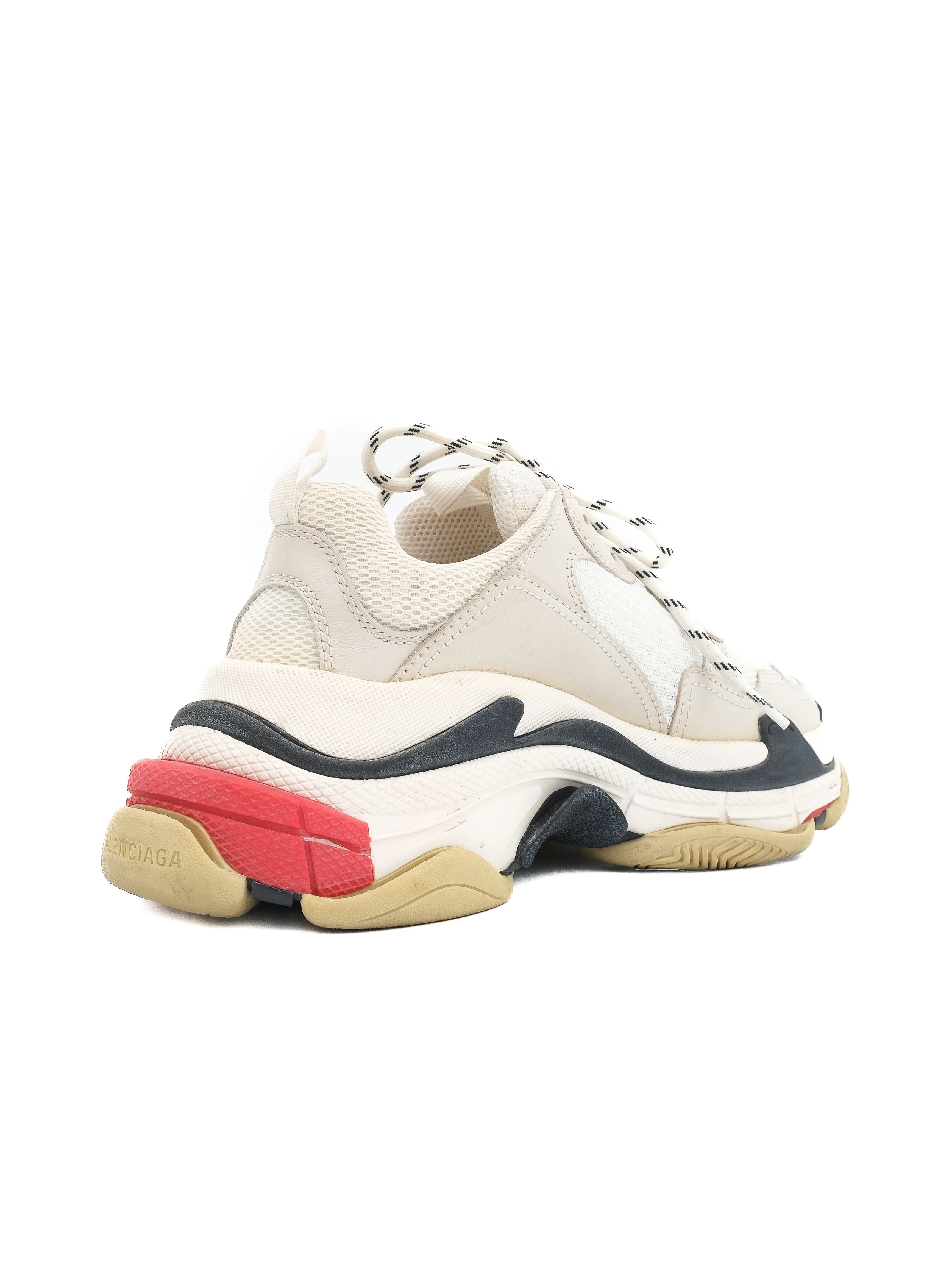 Excellent Balenciaga Triple S Sneakers Gray Textile Size 39 Women. These stunning Balenciaga Triple S sneakers are in excellent condition, showcasing their signature chunky design. Featuring a blend of gray textile material, these shoes are both stylish and durable. Size 39 ensures a comfortable fit for women's footwear. The sneakers feature a unique layered construction with a striking mix of colors, including beige, black, and red accents, creating an eye-catching look. Noteworthy details include the prominent 'BALENCIAGA' branding displayed on the side and back, adding authenticity to this fashionable footwear. The thick soles provide superior comfort and stability for everyday wear or casual outings. Care instructions suggest spot cleaning to maintain their exceptional appearance without damaging the textile material. Ideal for casual wear or adding a fashion statement to any outfit, these sneakers are a must-have for any Balenciaga enthusiast. Smoke-free and pet-free home. Please message me to confirm shipping timeframe. My full-time job involves traveling often, and shipping out may take longer than usual. Thanks for your interest.