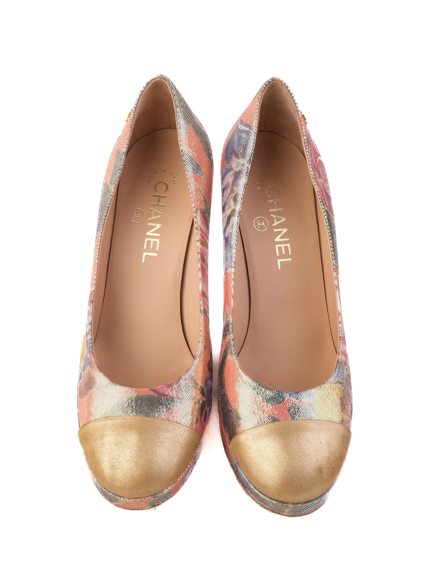 Excellent Chanel High-Heeled Floral Platform Shoes Size N/A. These stunning high-heeled shoes by Chanel are in excellent condition, showcasing a colorful and abstract floral design that perfectly complements their luxurious aesthetic. Crafted from high-quality fabric material, they feature a rounded toe cap in a striking gold hue, adding a touch of elegance. The tall heel and platform design offer both style and comfort, making them ideal for various occasions from casual outings to evening events. The shoes are adorned with a small emblem near the heel, signifying their authentic designer status. While no specific size is provided, the fit is true to size, suitable for any chic woman's wardrobe. Care for these beautiful shoes by simply wiping them clean with a soft, damp cloth to maintain the vibrant patterns and colors. These shoes are not only foot-friendly but also a statement piece that speaks volumes about sophistication and fashion-forward thinking in footwear. Please message me to confirm shipping timeframe. My full-time job involves traveling often, and shipping out may take longer than usual. Thanks for your interest.
