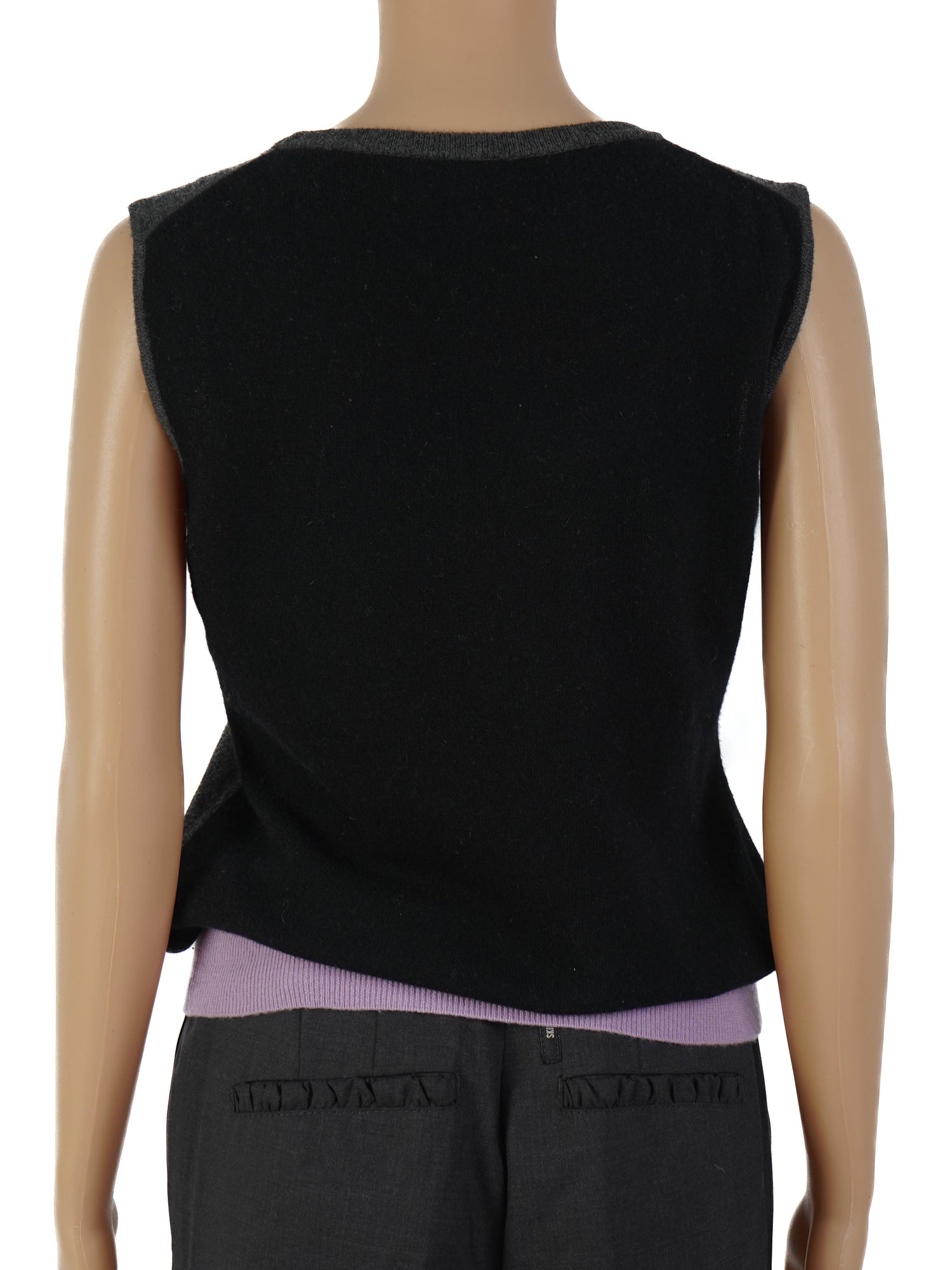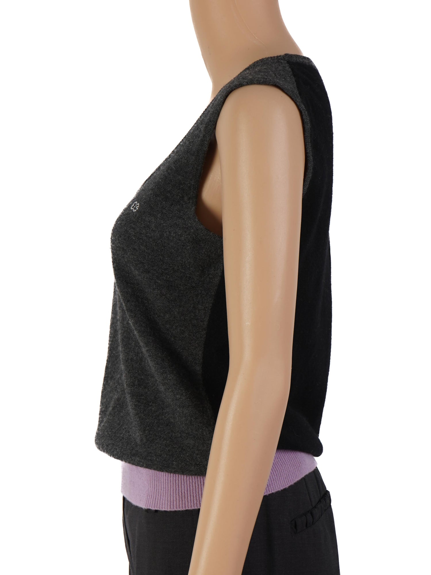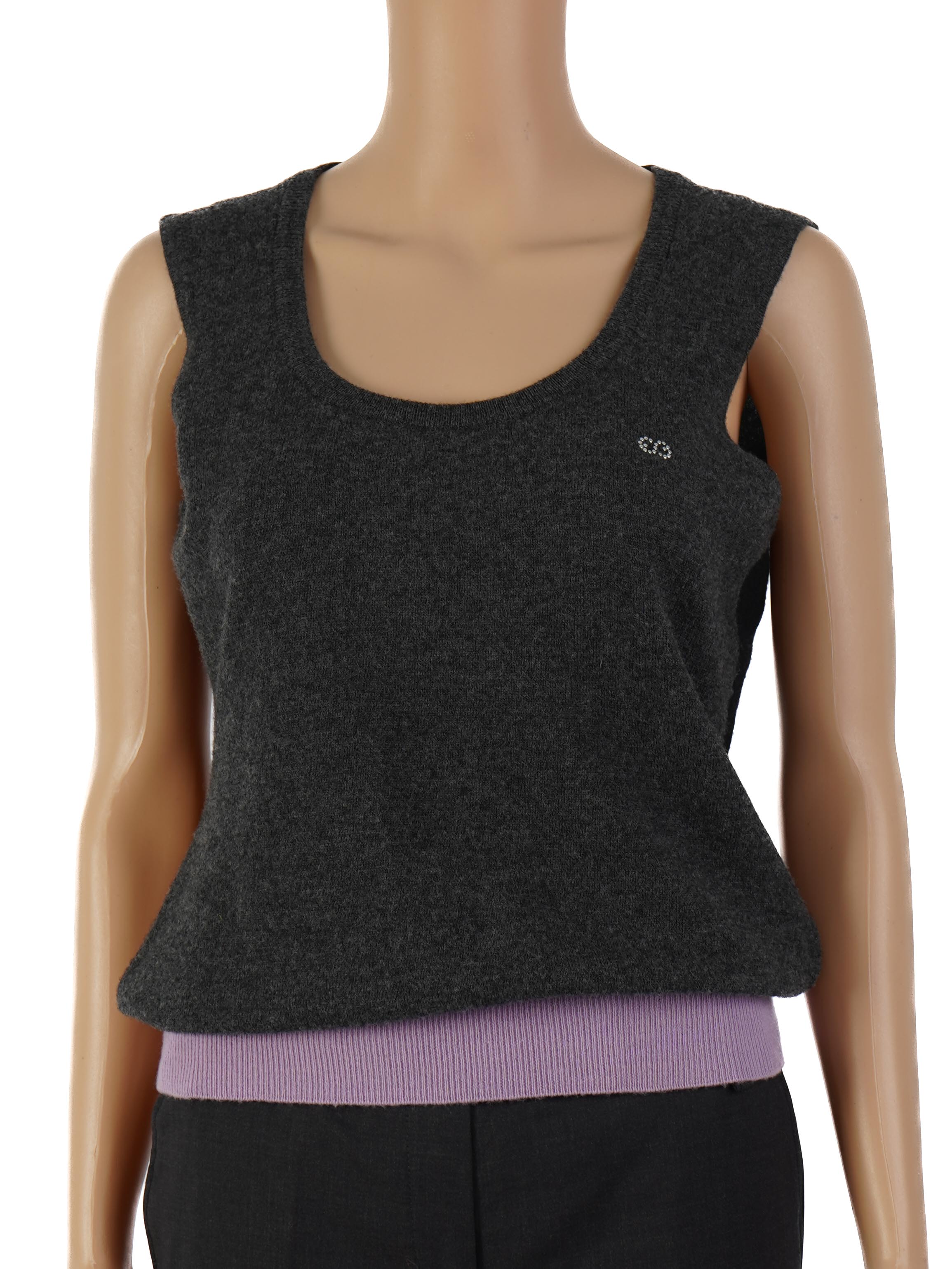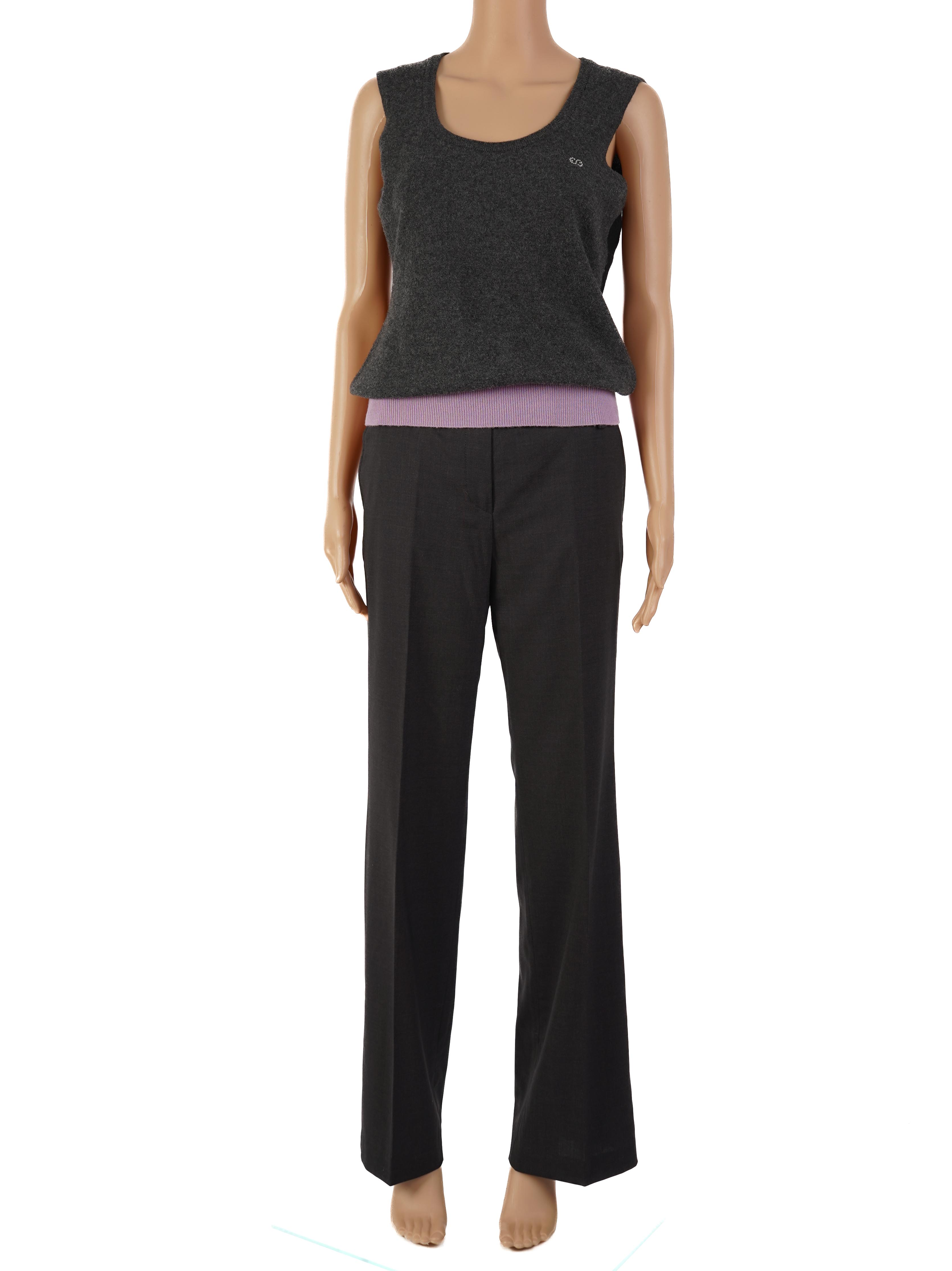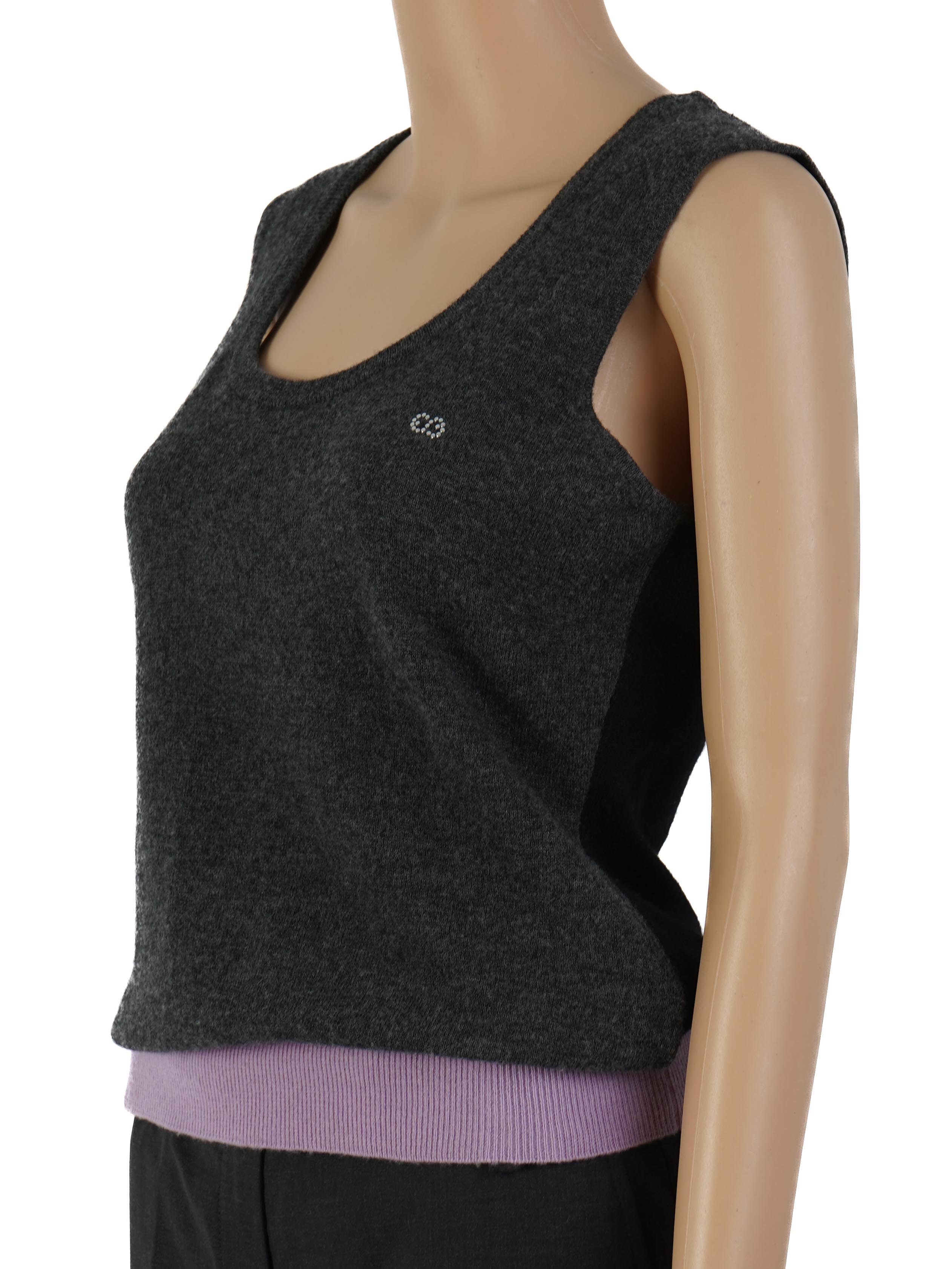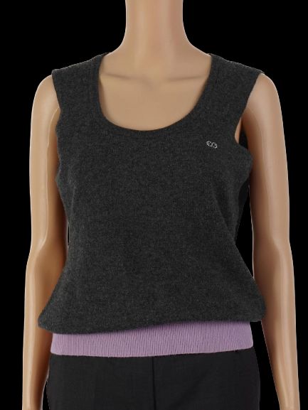 This stylish Escada top is a must-have addition to your wardrobe. Made from high-quality wool, this sleeveless piece features a chic dark gray body complemented by a light purple ribbed hem. The top is in excellent condition, showcasing minimal signs of wear, and it fits true to size, making it a versatile choice for various occasions.