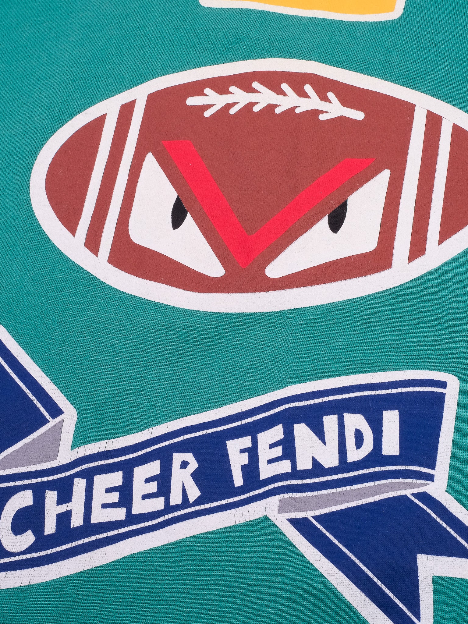 Excellent Fendi Kids Green T-Shirt Size 12 with Crown Design This vibrant Fendi T-shirt for kids showcases a striking design featuring a crown, a playful football with eyes, and the words "CHEER FENDI" embellished on a stylish blue ribbon. Made from natural cotton, this shirt is not only soft and comfortable but also durable for everyday wear. The shirt is in excellent condition, showing no flaws and fits true to size 12. It is perfect for casual outings or as stylish lounging wear at home. Available in a fresh green color, it's sure to make a statement in any childÕs wardrobe. Material: 100% Cotton. Care instructions: Machine washable for easy cleaning. Approximate Measurements: Body length: Regular 22" for a comfortable fit. The front design is eye-catching, ensuring your little one stands out. This shirt comes from a smoke-free and pet-free home, ensuring the utmost quality and cleanliness. An ideal addition for Fendi enthusiasts and fashion-forward kids alike! Please message me to confirm shipping timeframe. My full-time job involves traveling often, and shipping out may take longer than usual. Thanks for your interest.